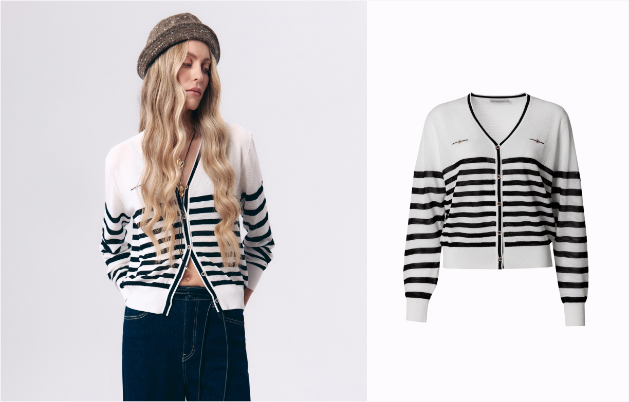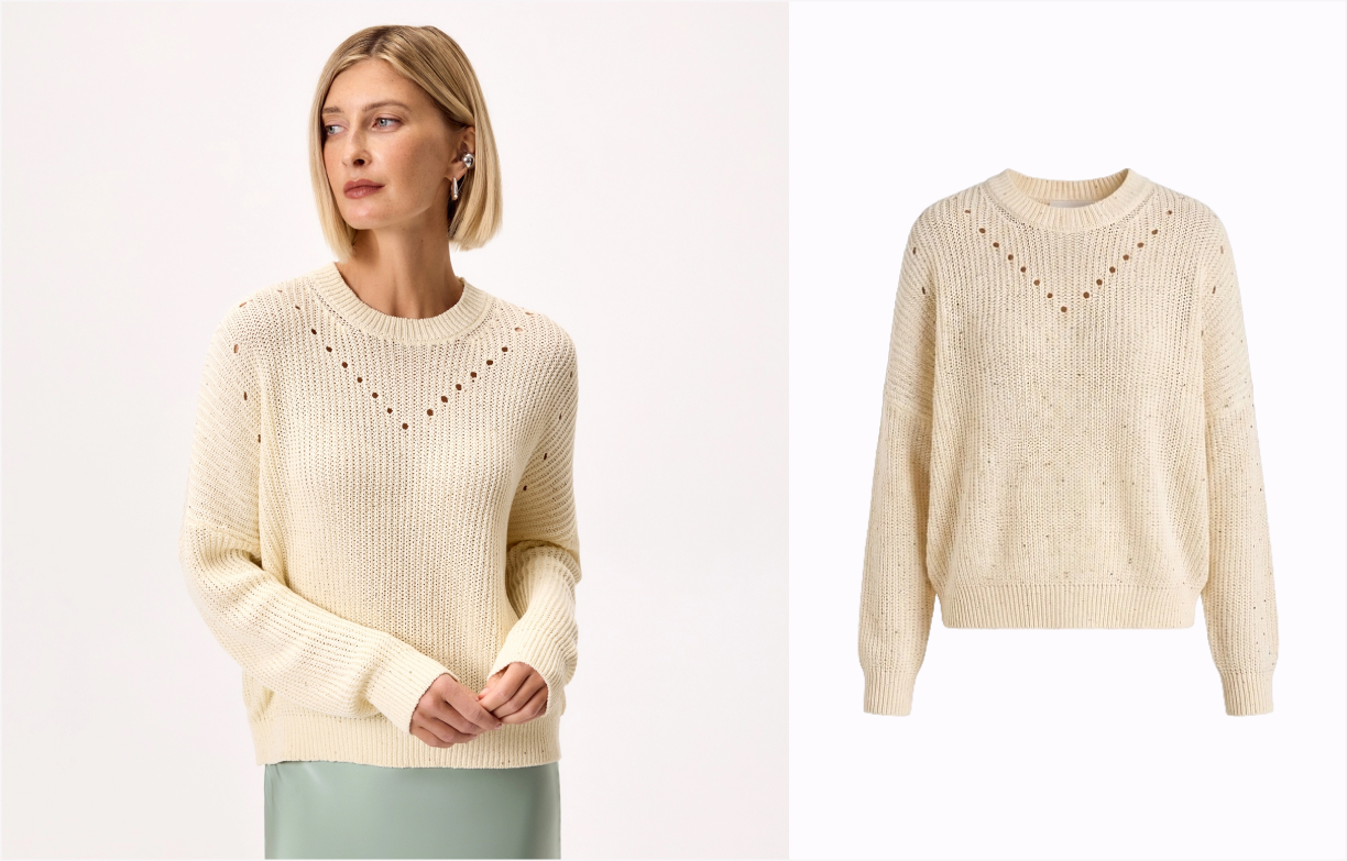 Люрекс — металлизированная тонкая нить, вплетённая в натуральную ткань. Люрекс добавляет лёгкое сияние при движении или под направленным светом. При этом ткань сохраняет все свойства натурального волокна: мягкость, воздухопроницаемость, комфорт в носке. Блеск не доминирует — он работает как акцент: добавляет образу глубины днём и сдержанного мерцания вечером.