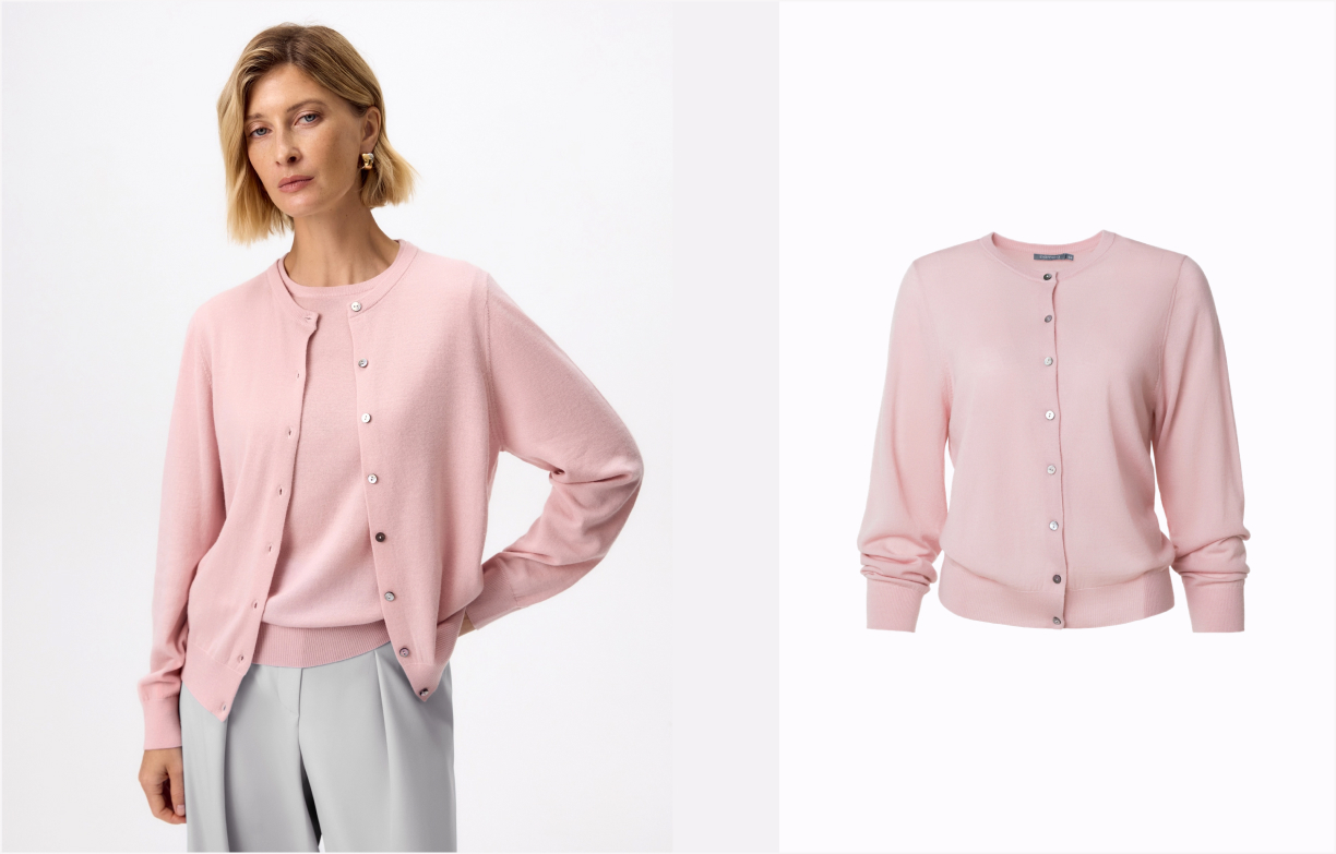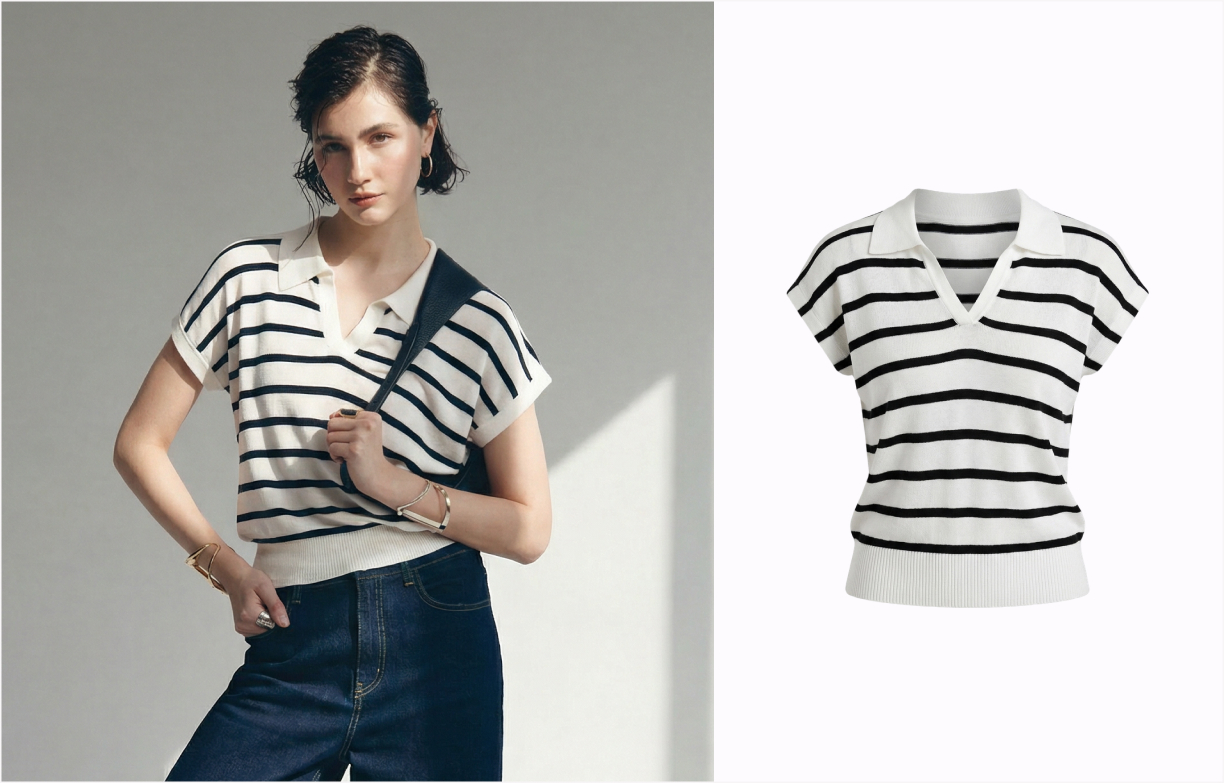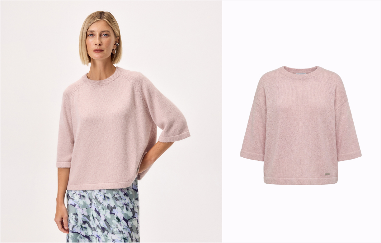 Смесовый трикотаж на основе вискозы и шёлка хорошо драпируется и обладает умеренным блеском. Вискоза обеспечивает мягкость и воздухопроницаемость, шёлк добавляет прочность и гладкость. Изделия комфортны в носке, сохраняют силуэт без скованности и подходят для переменчивой погоды — от прохладного утра до тёплого дня.
