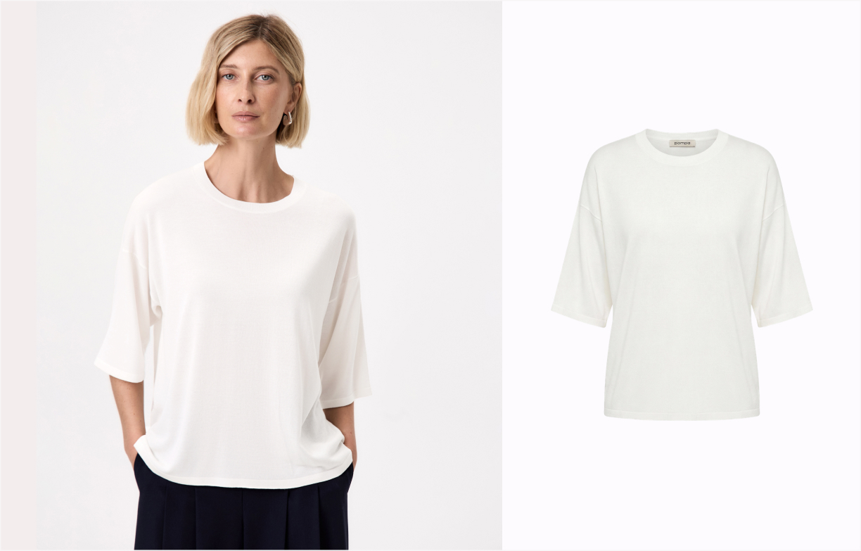 Ткань соединяет прочность тенселя и благородный блеск шёлка: тенсель быстро отводит влагу, шёлк сохраняет комфортную температуру. Изделия прочные, не теряют форму после стирки, обладают мягким матово-шелковым блеском и не вызывают статического электричества — подходят для повседневной носки.