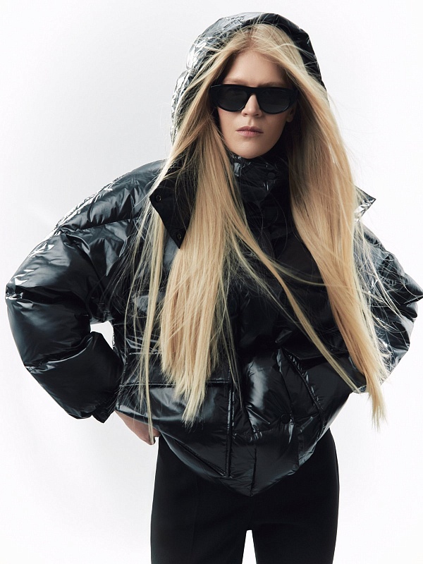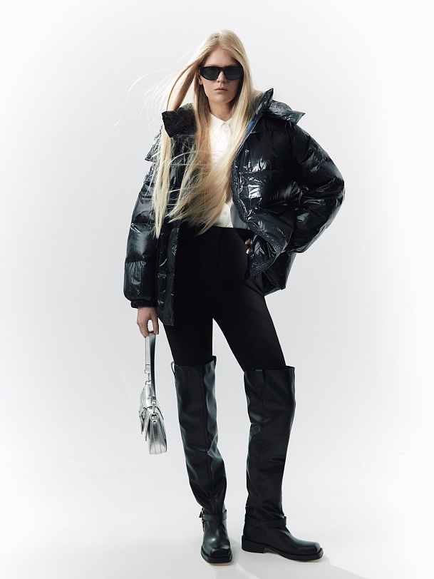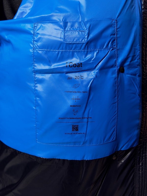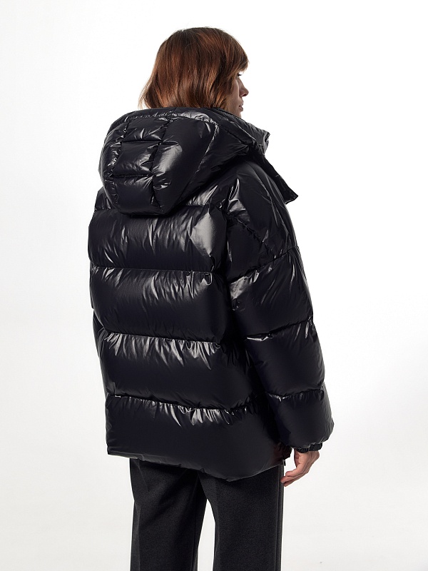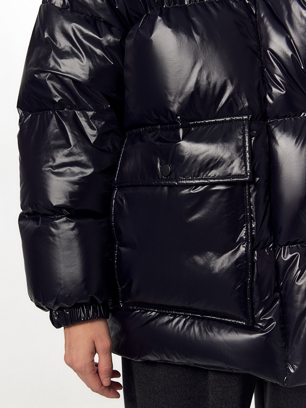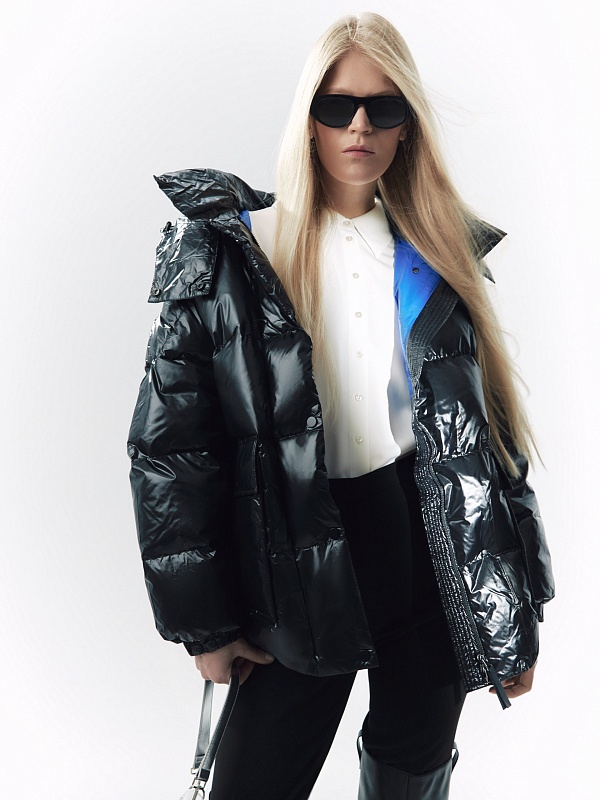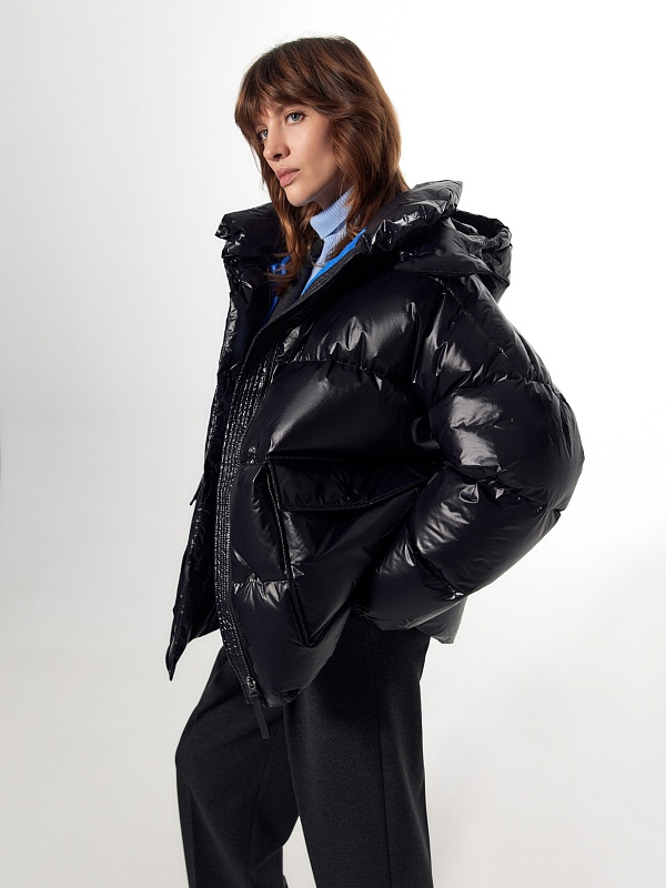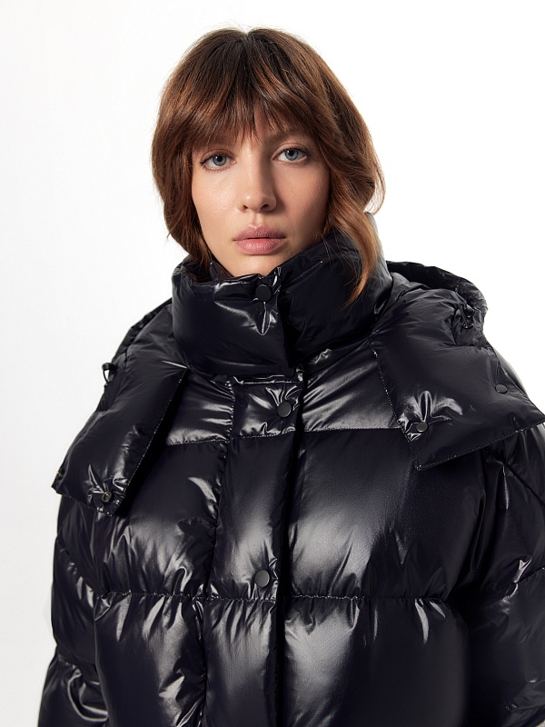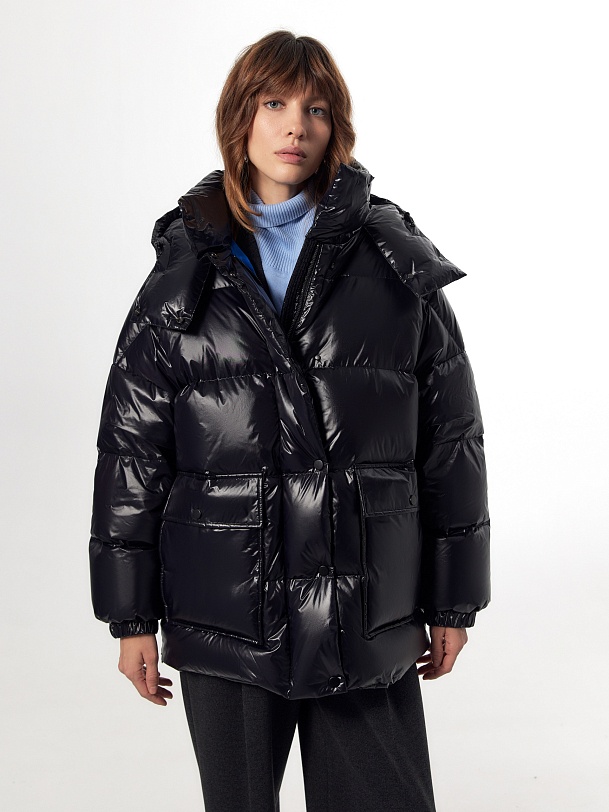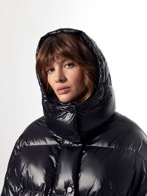 Ультрамодный объемный пуховик прямого силуэта из плотной глянцевой водонепроницаемой плащевой ткани черного цвета на объемном натуральном утеплителе пух/перо. Пуховик имеет свободный рубашечный рукав и высокий воротник-стойку с глубоким тёплым капюшоном. По бокам располагаются стильные разрезы на потайной молнии. Подкладка модного ярко-синего цвета "кобальт" контрастирует с основной тканью, внутри имеется маленький кармашек для мелочей. Для дополнительного комфорта имеет резинку по низу рукава, которая плотно прилегает к телу и не пропускает ветер и осадки, а также глубокие накладные карманы с двойным входом, внутри которых располагается теплый и уютный флис. Застегивается на молнию и ряд надежных установочных кнопок. А для наилучшей защиты от непогоды пуховик выполнен с использованием высокотехнологичной мембраны RaftPro.