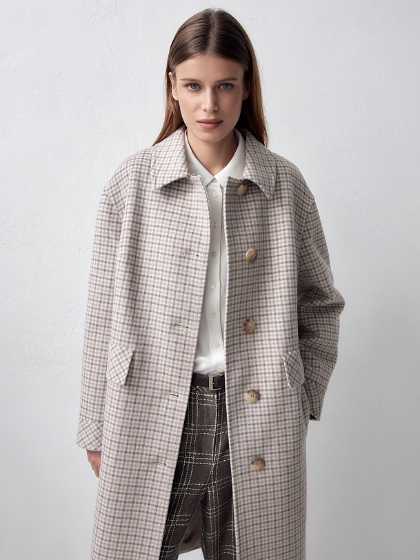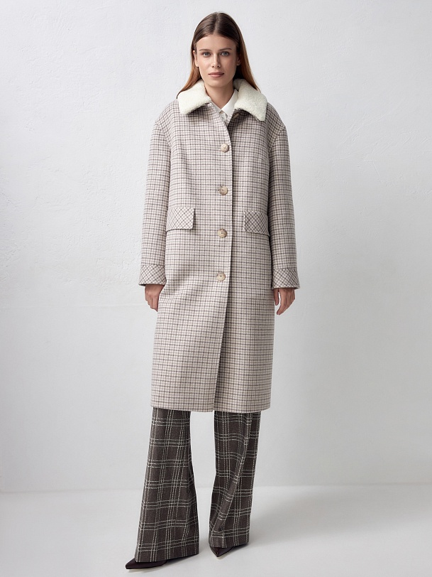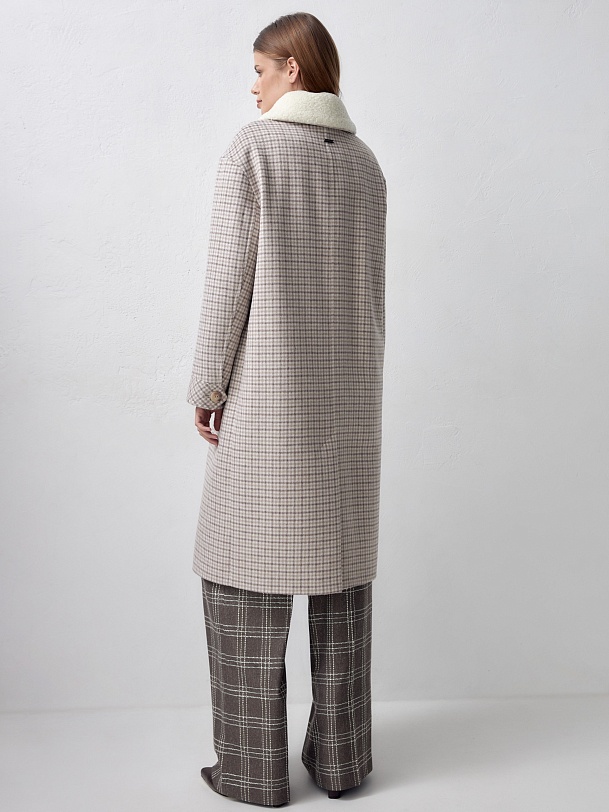 Однобортное полностью утепленное зимнее пальто прямого силуэта из ворсовой шерстяной ткани нежнего бежевого цвета с принтом клетка. Пальто имеет аккуратный стояче-отложной воротник с дополнительным съемным воротником из молочного искусственного меха. Рукав пальто рубашечный и не стесняет движений. Низ рукава обработан широкой функциональной манжетой с возможностью регулировки прилегания. По бокам пальто находятся аккуратные прорезные карманы с узкими листочками и декоративным клапаном. Изделие модной длины до колена, в среднем шве спинки имеется высокая шлица, обеспечивающая удобство шага. Застежка на ряд крупных стильных пуговиц под натуральный рог. Для наилучшей защиты от непогоды пальто выполнено с использованием высокотехнологичной мембраны RaftPro и современного легкого утеплителя. Произведено в Санкт-Петербурге.