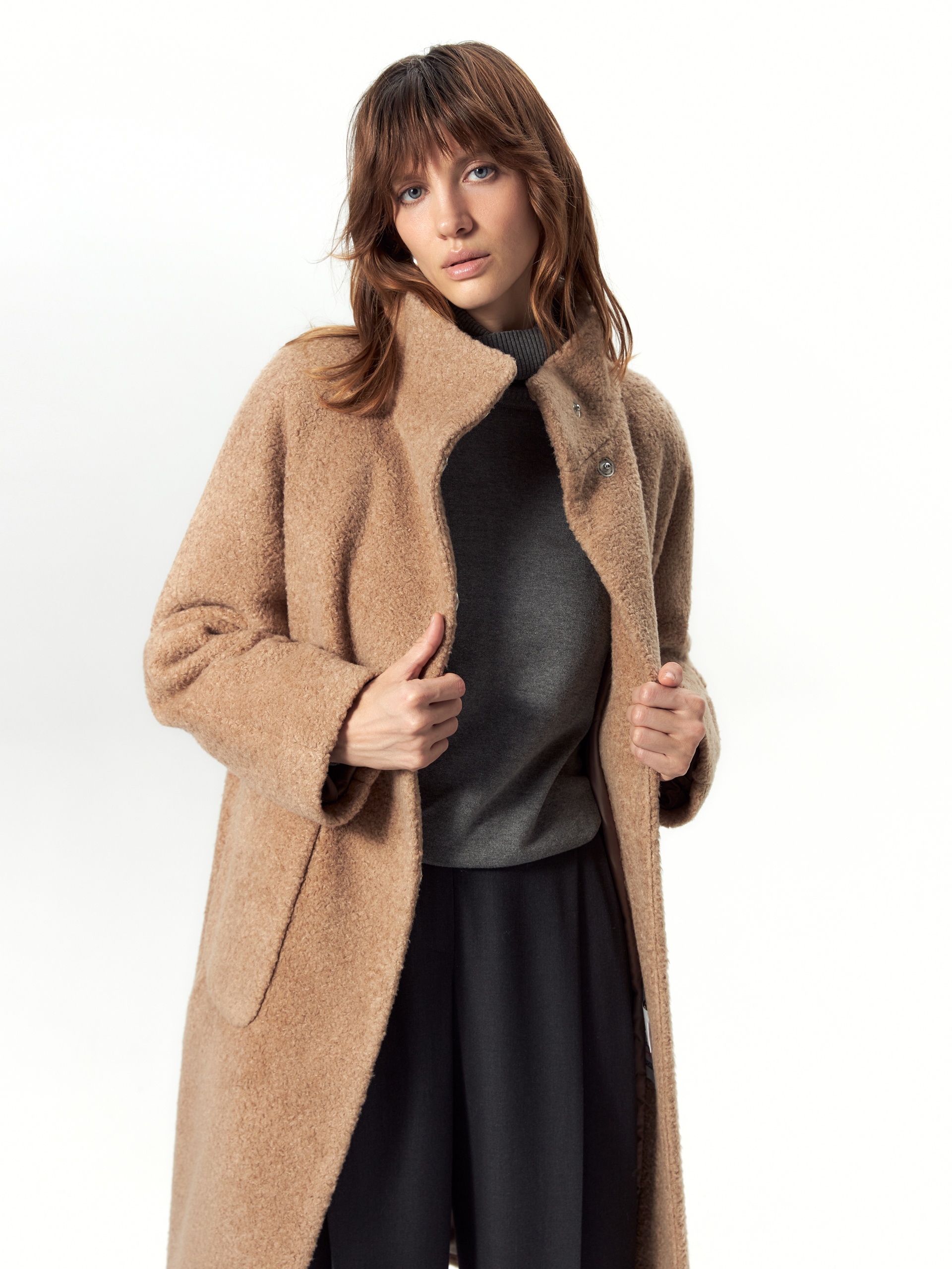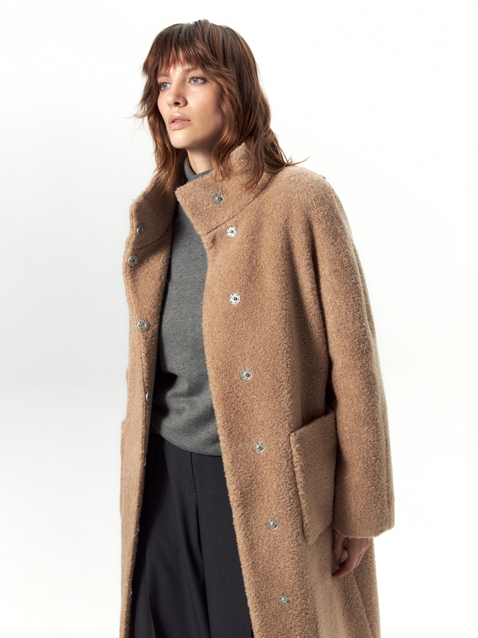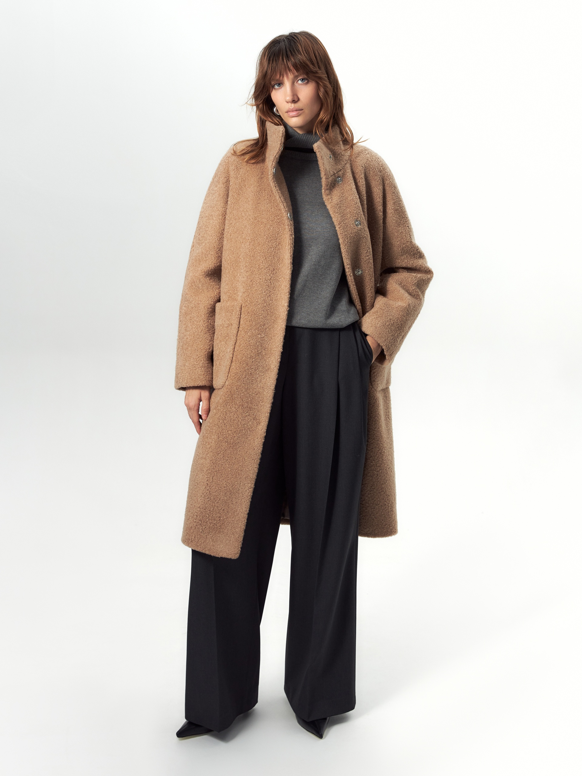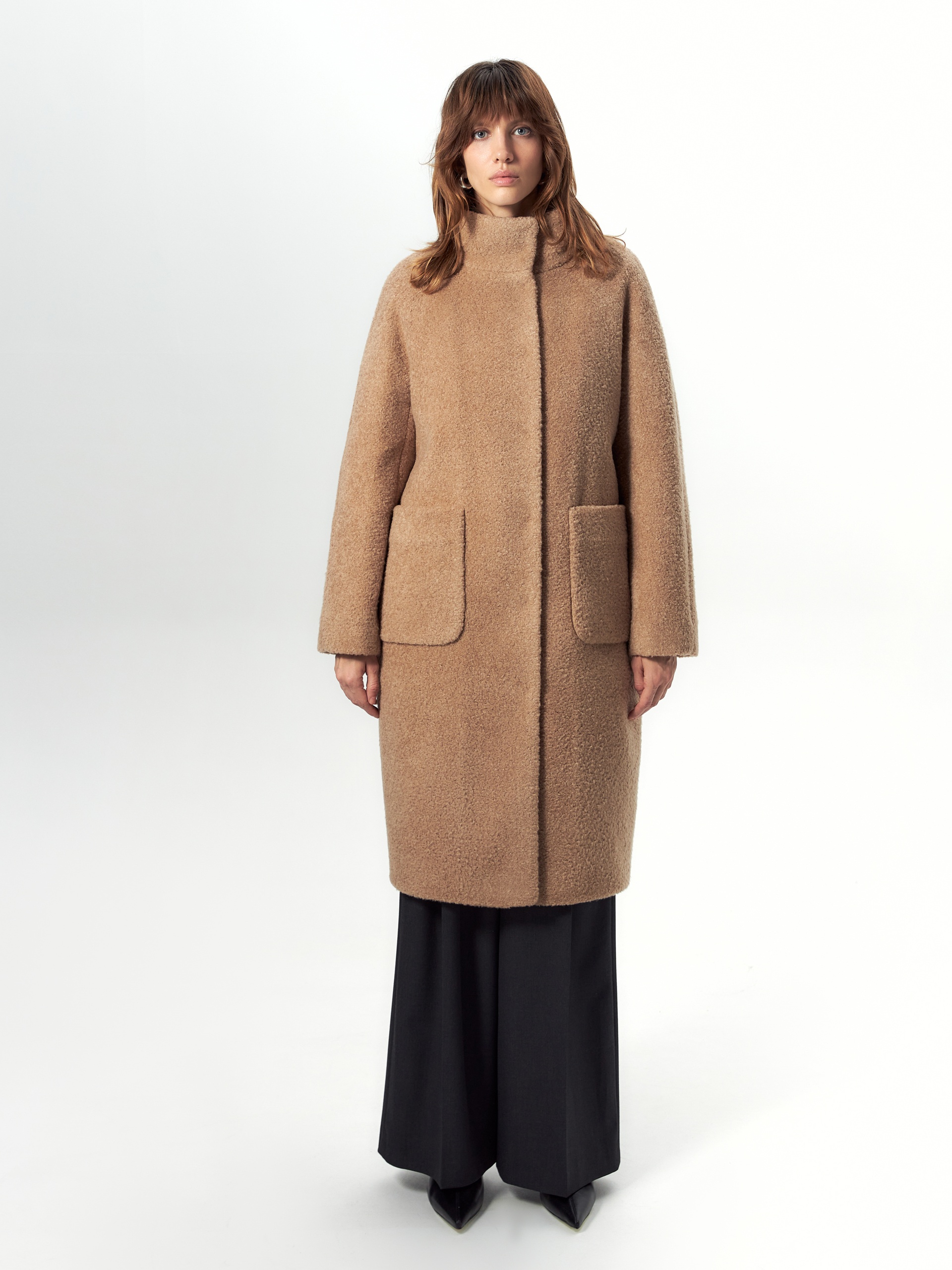 Шуба силуэта "кокон" из искусственного меха благородного бежевого оттенка. Такая шуба станет идеальной базовой вещью на холодную зиму за счет своих деталей: высокого и теплого воротника-стойки, слегка зауженного к низу рукава кимоно, надежной застежки на ряд кнопок. Модным функциональным декоративным элементом служат два крупных и вместительных накладных кармана. Длина шубы закрывает колено. Для наилучшей защиты от непогоды изделие выполнено с использованием высокотехнологичной мембраны RaftPro и современного легкого утеплителя. Произведено в Санкт-Петербурге....
