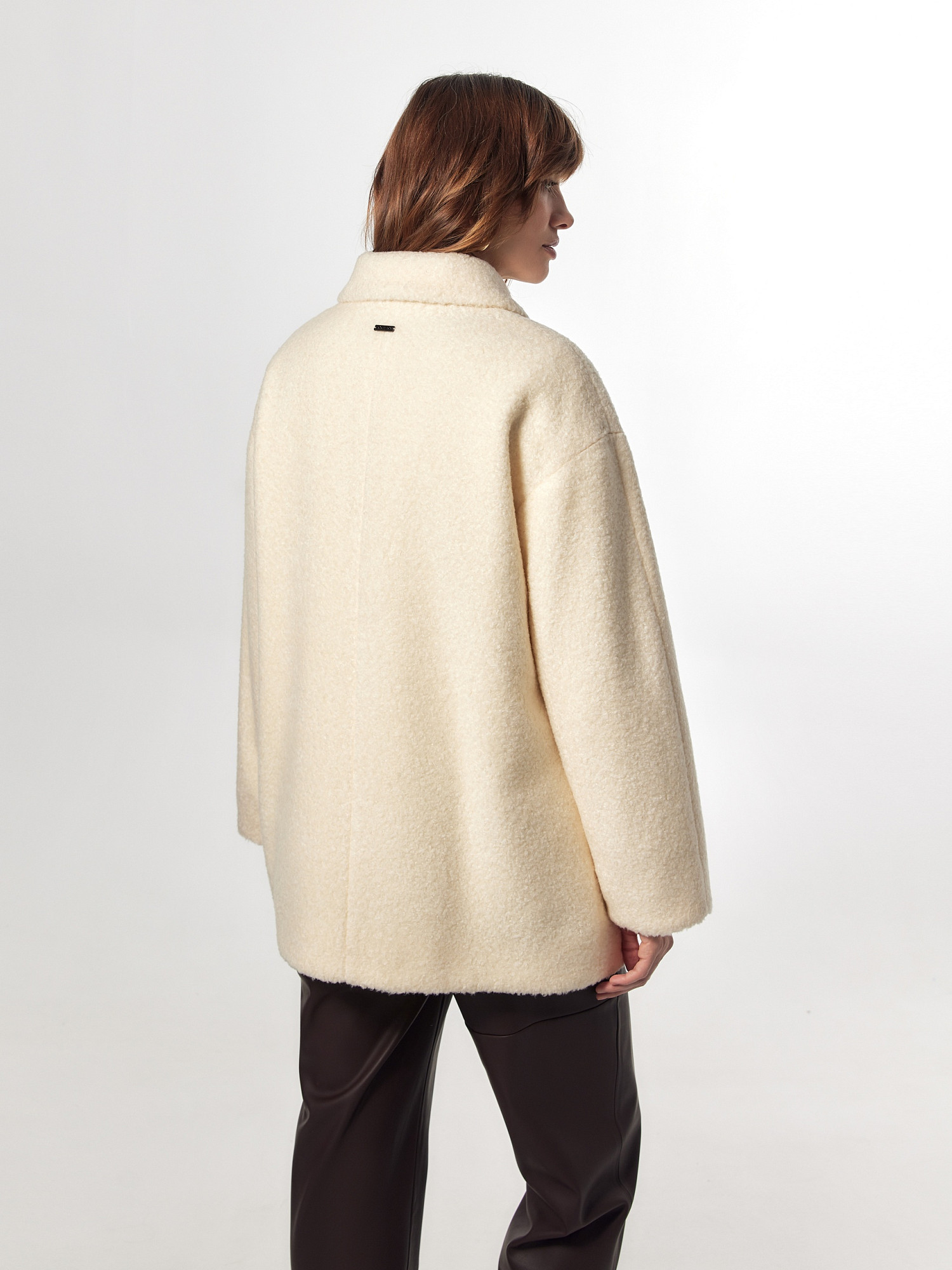 Однобортная шуба из искусственного меха в нежном молочном цвете. Шуба прямого силуэта, с аккуратным стояче-отложным воротником, утонченным плечевым поясом и минимальным количеством декора. По бокам располагаются два глубоких вместительных накладных кармана, рукав со спущенным плечом заужен к низу. Шуба удобной длины до середины бедра, с застежкой на ряд крупных светлых пуговиц под натуральный рог. Для наилучшей защиты от холода и ветра изделие выполнено с использованием высокотехнологичной мембраны RaftPro и легкого современного утеплителя. Произведено в Санкт-Петербурге.