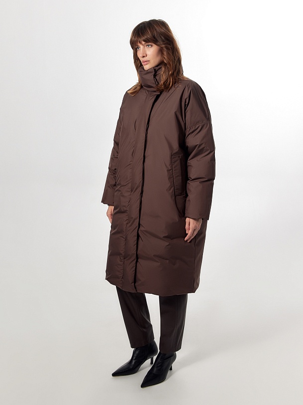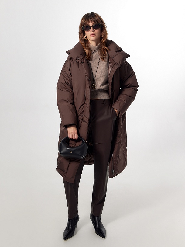 Современный базовый теплый пуховик из плащевой ткани в модном шоколадном оттенке. Пуховик выполнен из высокотехнологичных современных материалов на теплом натуральном утеплителе пух/перо. Снаружи пуховик гладкий матовый, а внутри располагается яркая глянцевая подкладка из стеганой плащевой ткани, которая не только смотрится контрастно и стильно, но и создает ультрамодный объем и дополнительное утепление. По низу рукава располагается трикотажная манжета для наибольшего комфорта и защиты от внешних факторов. Стойка пуховика достаточно высокая и также плотно набита утеплителем. Для наилучшего сохранения тепла низ пуховика собран на кулиску с возможностью регулировки. Пуховик имеет два кармана с листочками спереди, а также внутренний кармашек на подкладке для мелочей. Застегивается пуховик на молнию и ряд установочных кнопок. А для наилучшей защиты от непогоды пальто выполнено с использованием высокотехнологичной мембраны RaftPro.