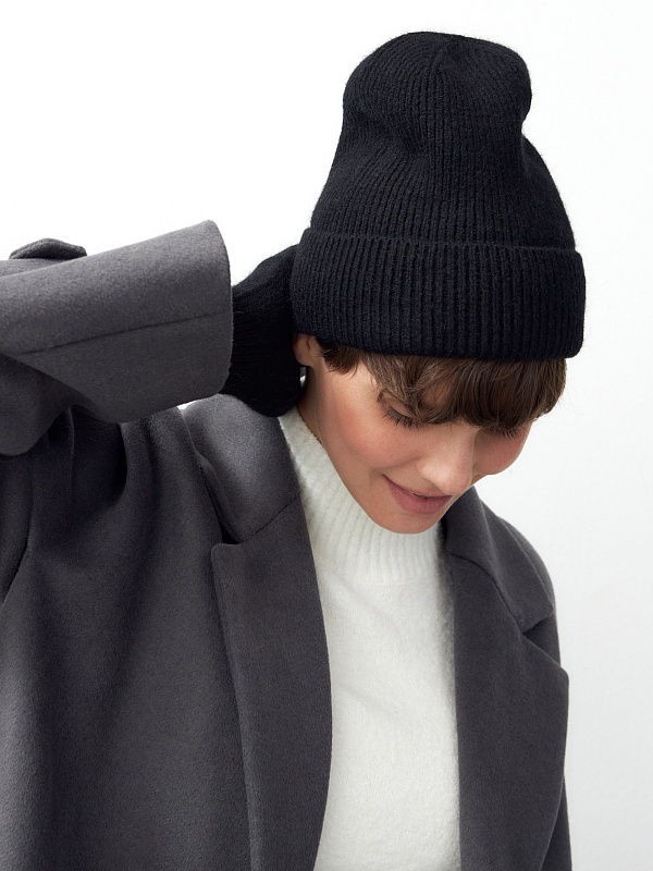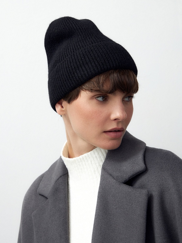 Шапка фактурной вязки из тёплой и мягкой пряжи с содержанием пуха ангорского кролика. Шапка имеет модную форму "бини" и отворот для дополнительного тепла. Изделие подойдёт на любой размер. Шапка классического чёрного цвета гармонично впишется в любой образ с нашими пальто и станет незаменимой базовой вещью в Вашем гардеробе.