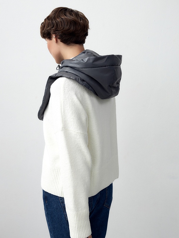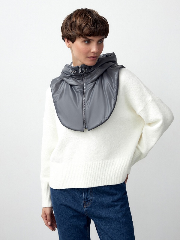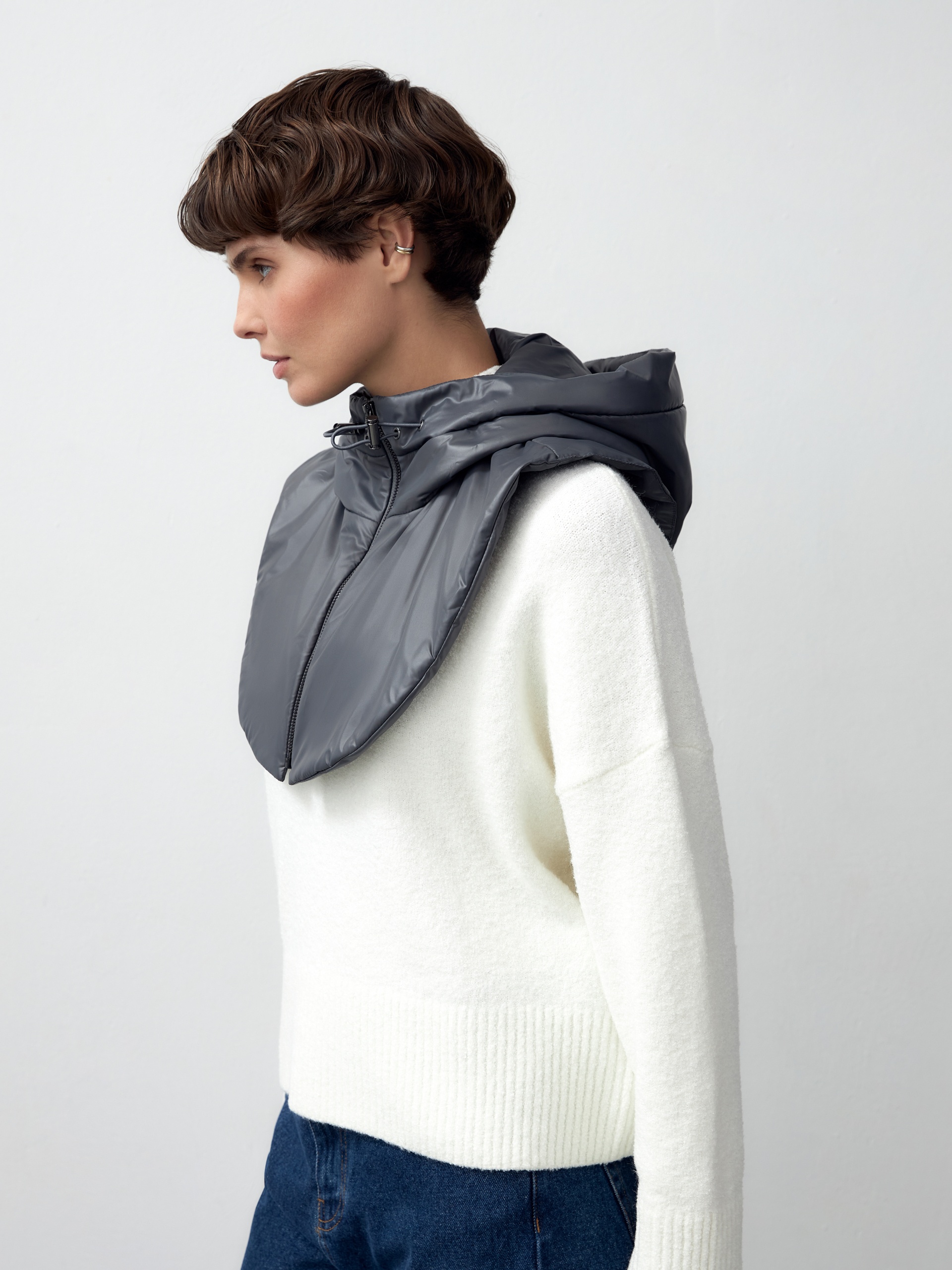 Съемный утеплённый зимний капюшон с манишкой из плащевой ткани с водоотталкивающим покрытием универсального тёмно-серого цвета. Капюшон на молнии, имеет резинку и два фиксатора для регулирования объема. Такой капюшон послужит прекрасным дополнением к любому образу с пальто из нашей коллекции и надёжно защитит от непогоды. Произведено в Санкт-Петербурге.