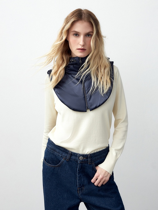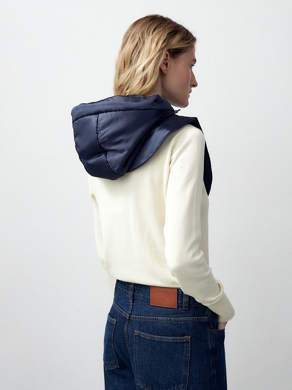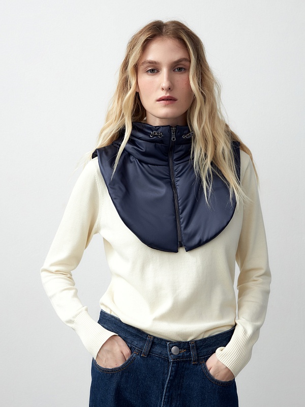 Съемный утеплённый зимний капюшон с манишкой из плащевой ткани с водоотталкивающим покрытием глубокого чёрно-синего оттенка. Капюшон на молнии, имеет резинку и два фиксатора для регулирования объема. Такой капюшон послужит прекрасным дополнением к любому образу с пальто из нашей коллекции и надёжно защитит от непогоды. Произведено в Санкт-Петербурге.