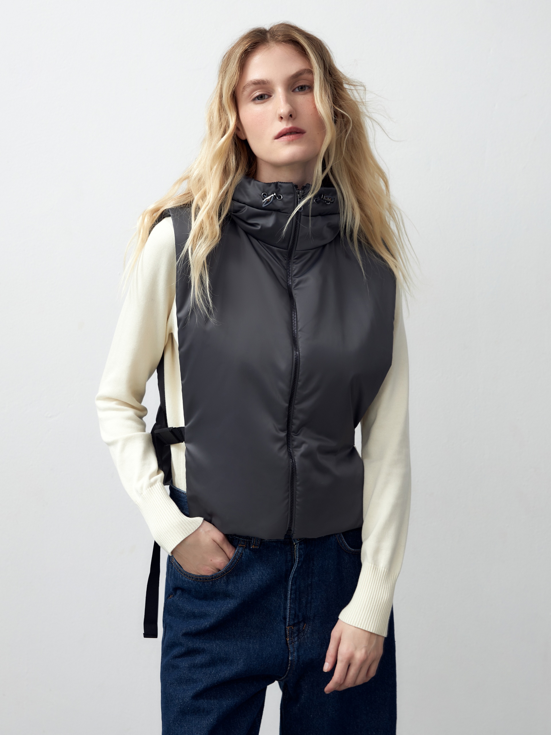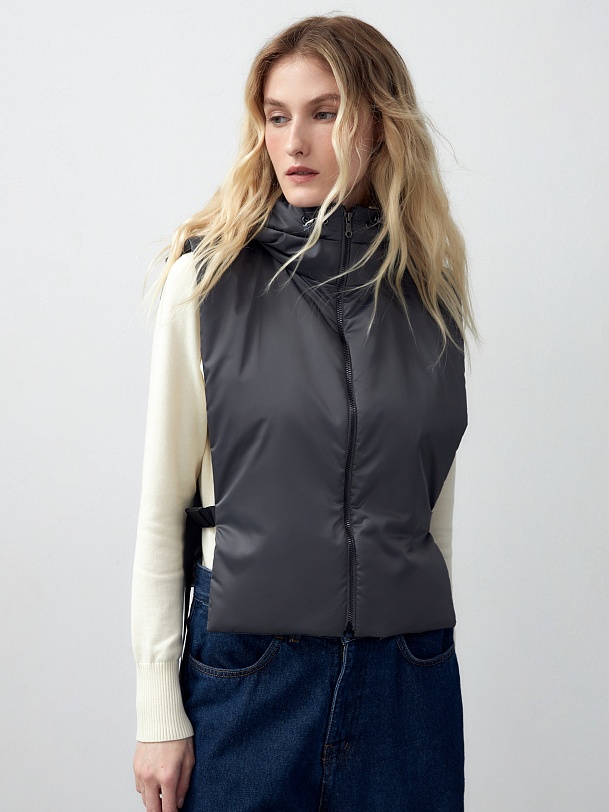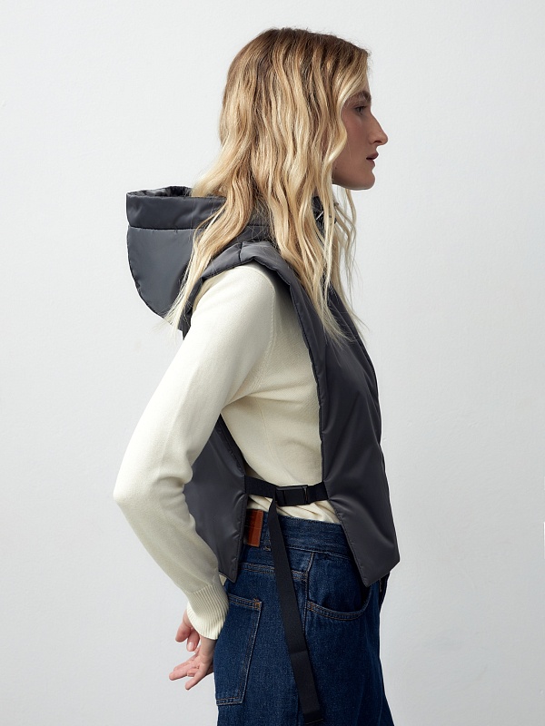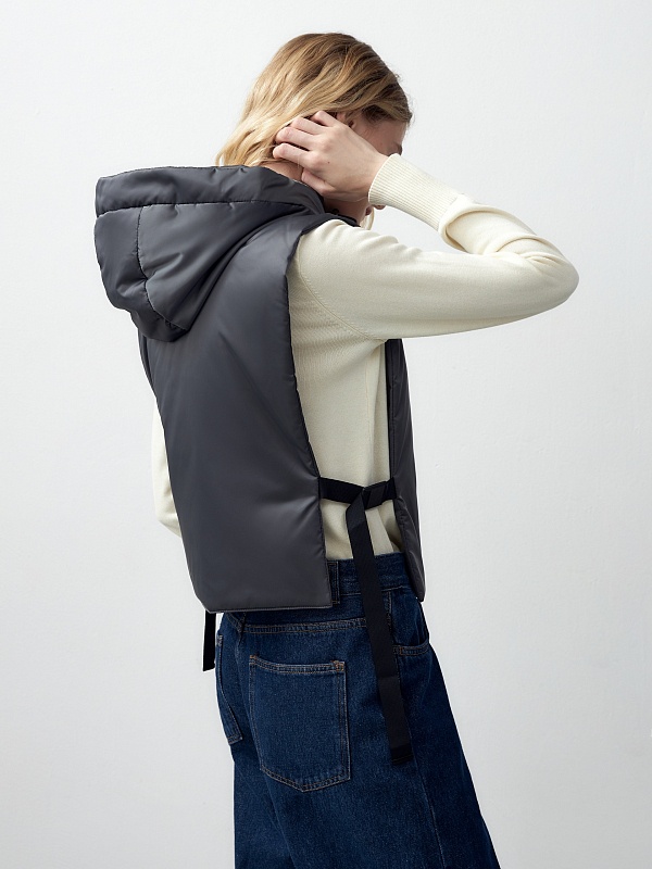 Съемный утеплённый зимний капюшон с длинной манишкой из плащевой ткани с водонепроницаемым покрытием универсального тёмно-серого цвета. Капюшон на молнии, имеет резинку и два фиксатора для регулирования объема. Манишка капюшона длиная, что может заменить полноценный жилет, а на талии располагаются застежки-фастексы, которые надежно фиксируют изделие. Такой капюшон послужит прекрасным дополнением к любому образу с пальто из нашей коллекции и надёжно защитит от непогоды. Произведено в Санкт-Петербурге.
