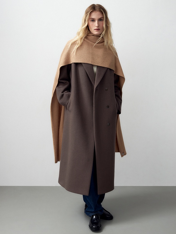 Шарф фактурной вязки из тёплой и мягкой пряжи с содержанием пуха ангорского кролика. Изделие имеет достаточную длину, чтобы полностью обернуть им шею, плечи и грудь. Такой шарф светлого бежевого оттенка подойдёт к любому образу с нашими пальто и станет незаменимой базовой вещью в гардеробе.