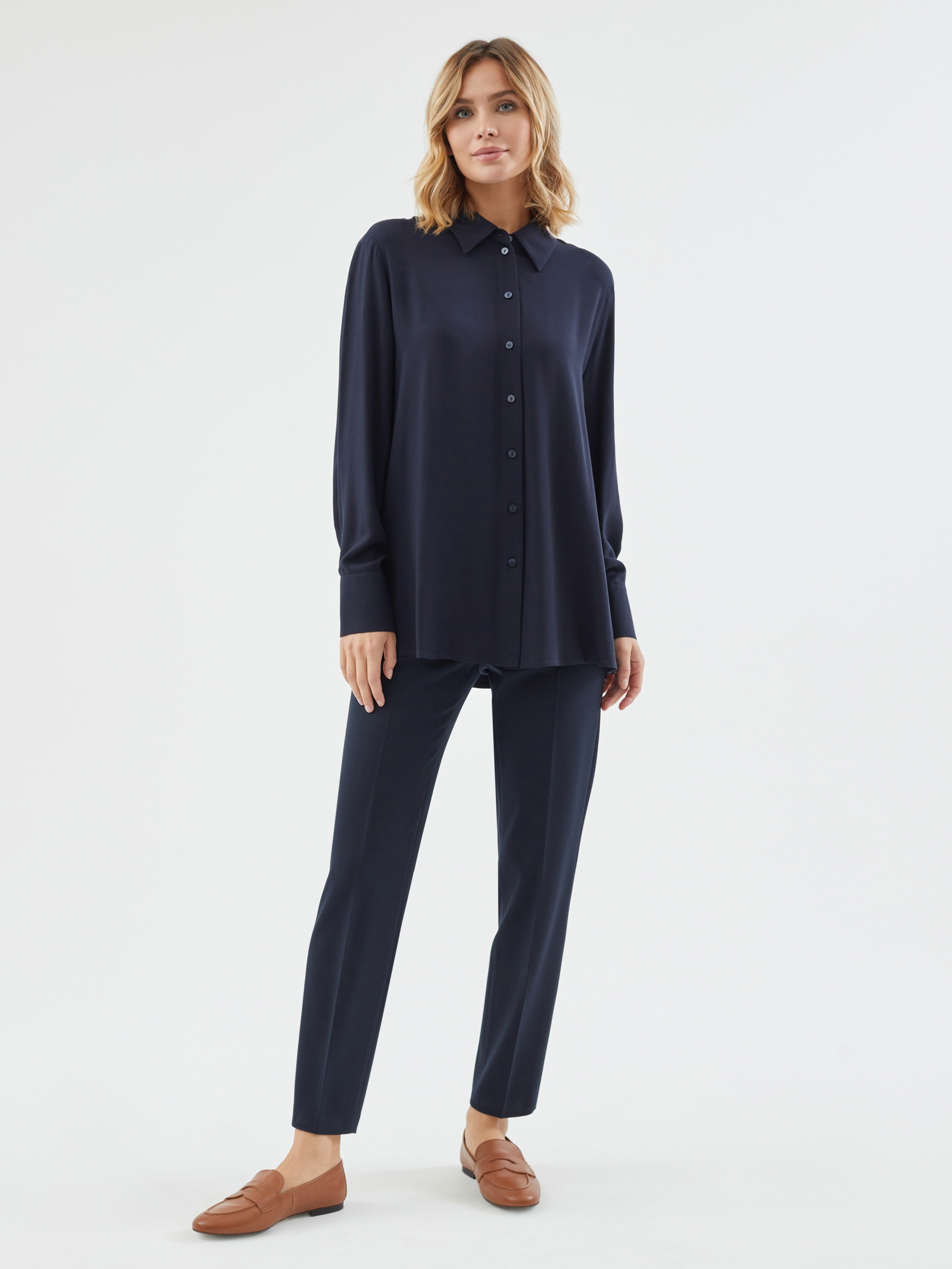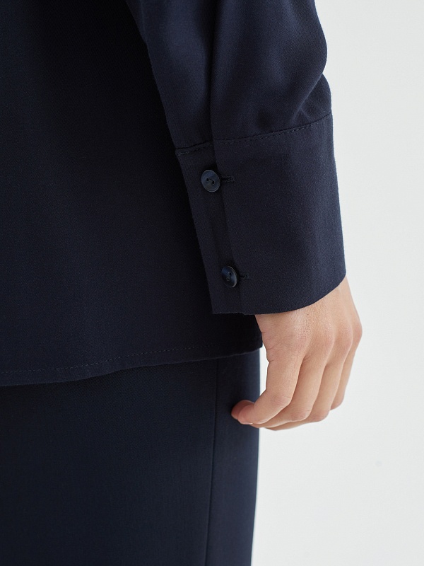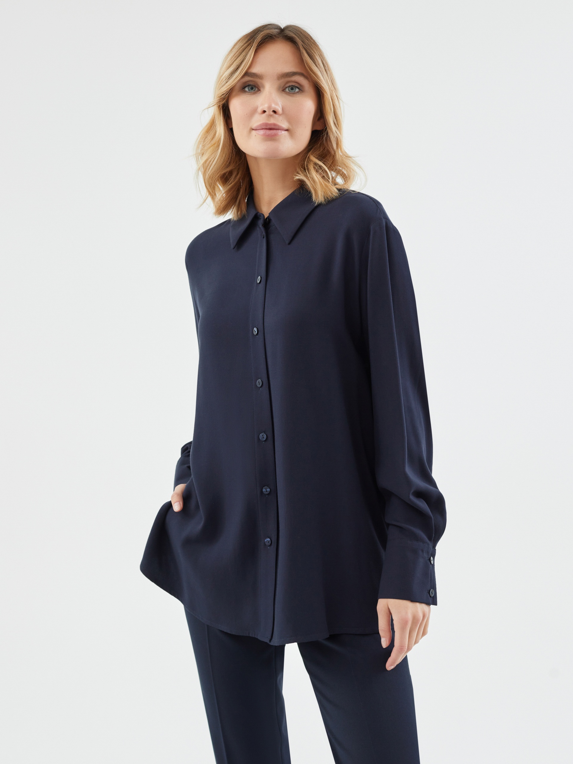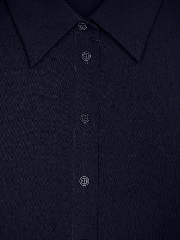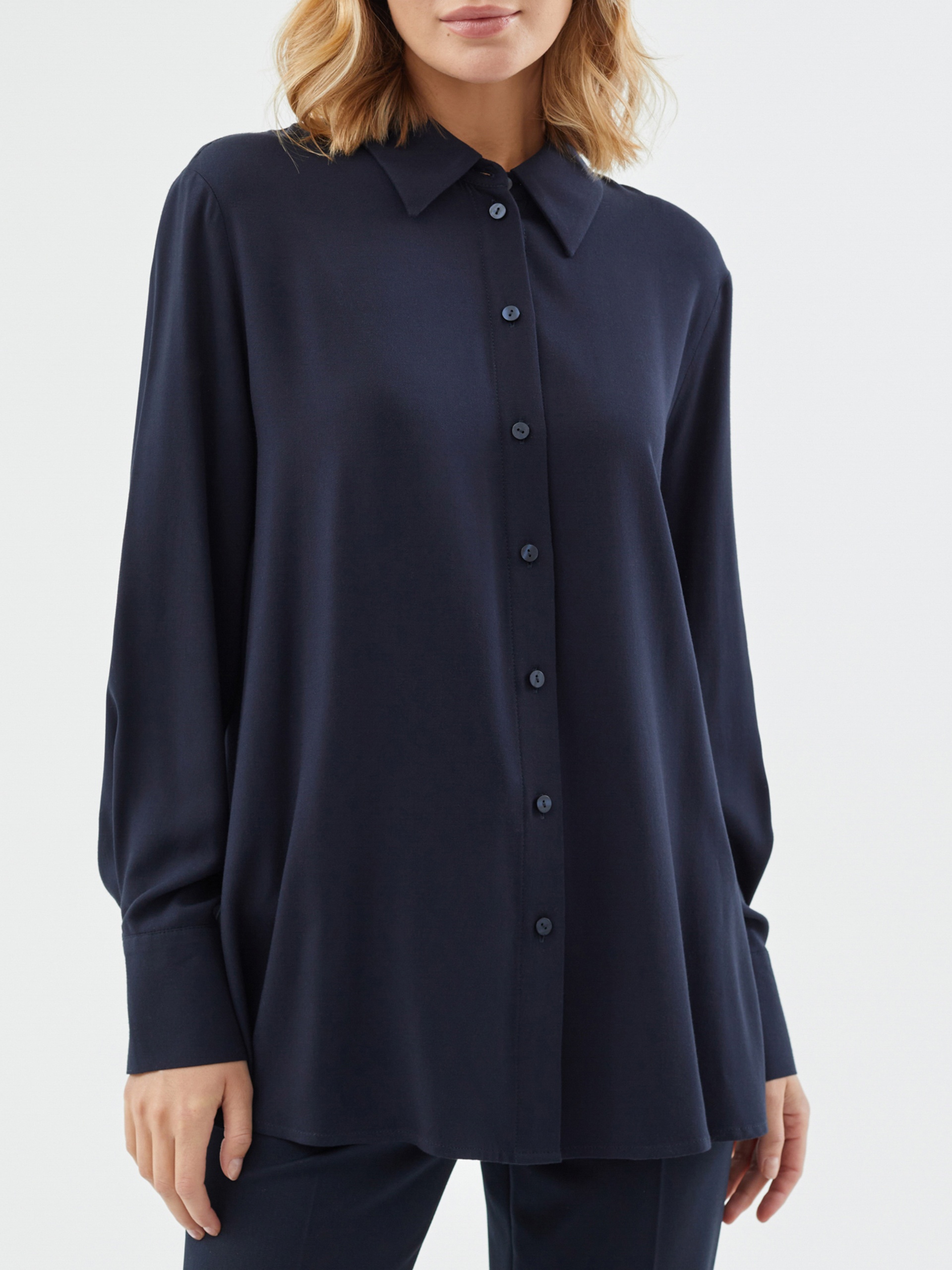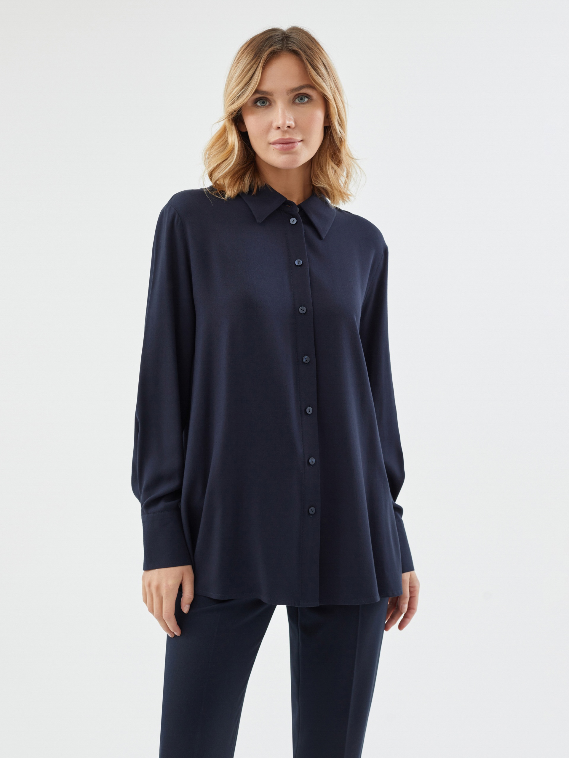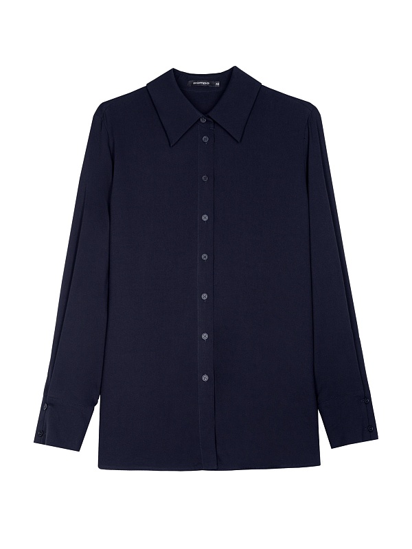 Стильная рубашка прямого силуэта из 100% вискозы в темно-синем цвете с отложным воротником и втачным рукавом полной длины на манжете. Застежка спереди на пуговицы, по бокам небольшие разрезы. Эта модель поможет создать отличный базовый осенний образ в комплекте с брюками или юбкой.