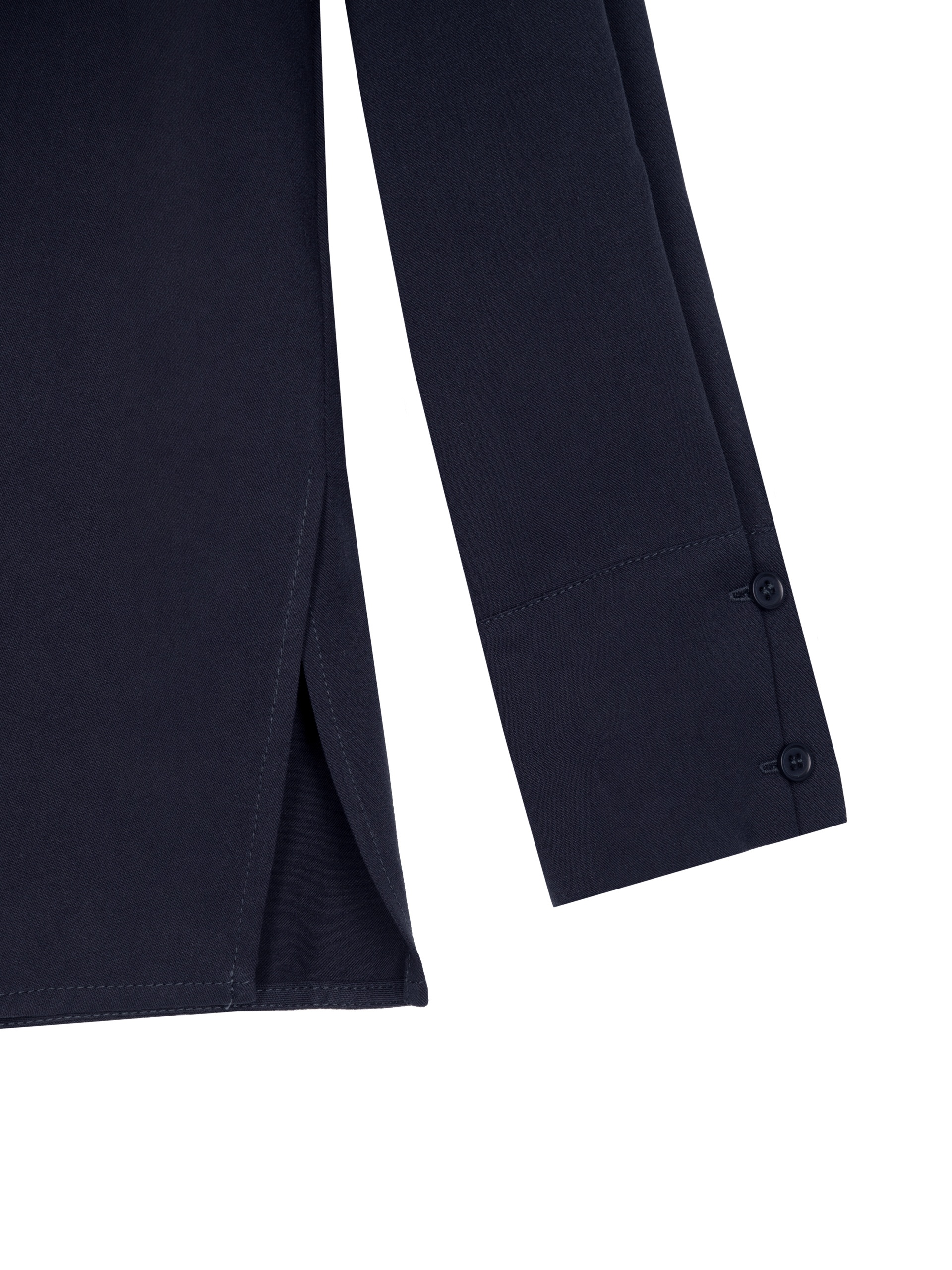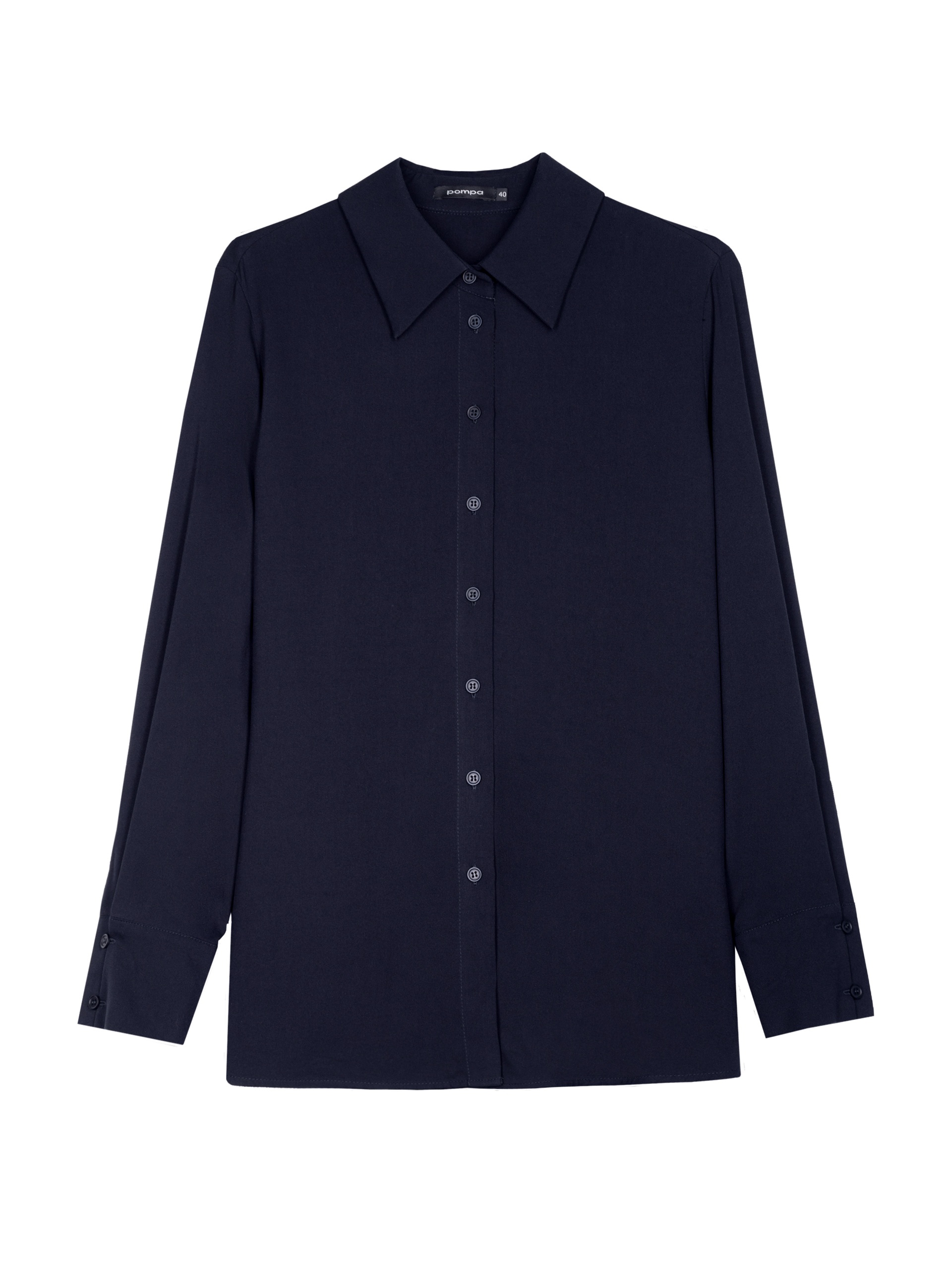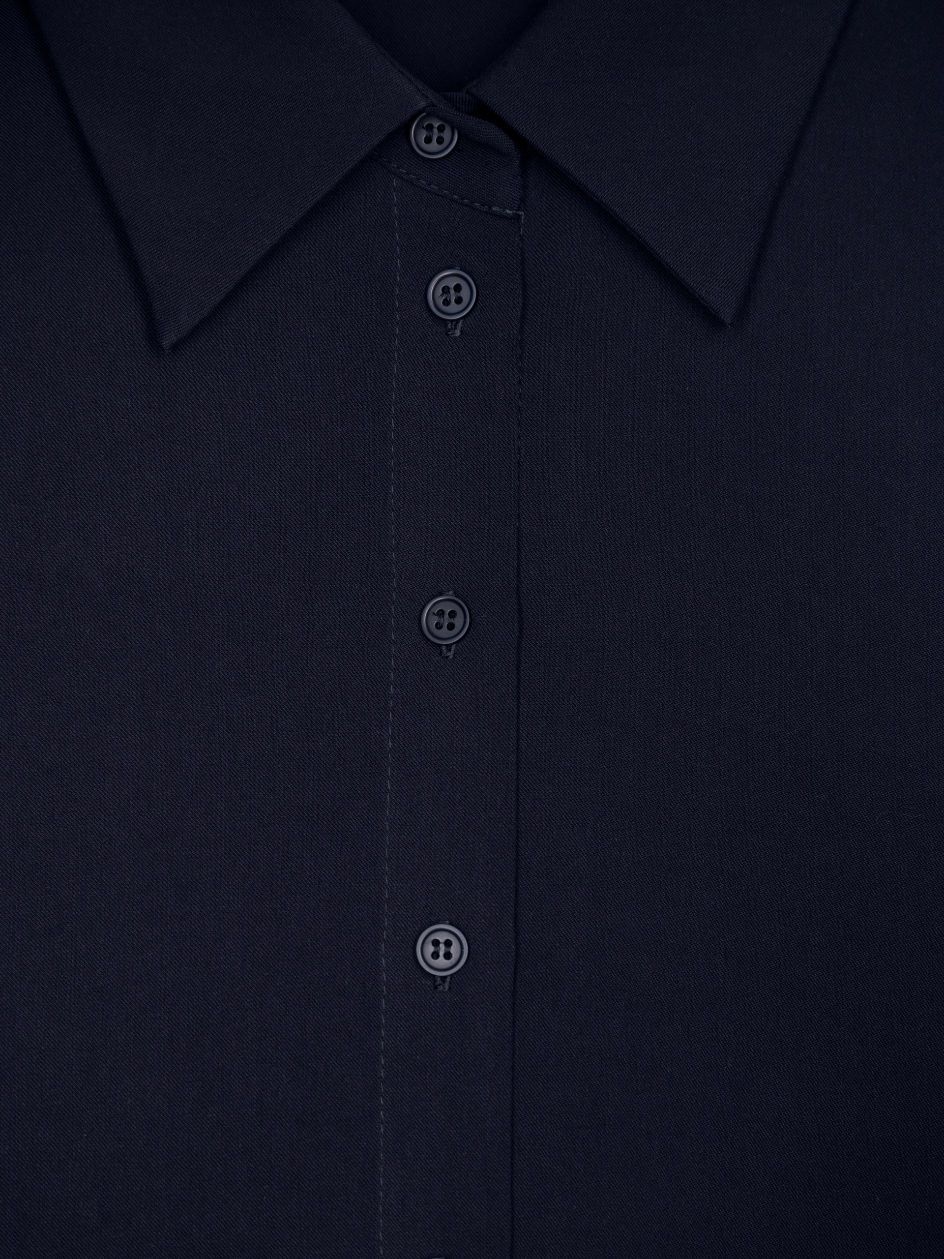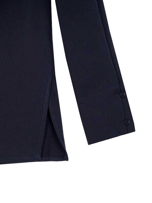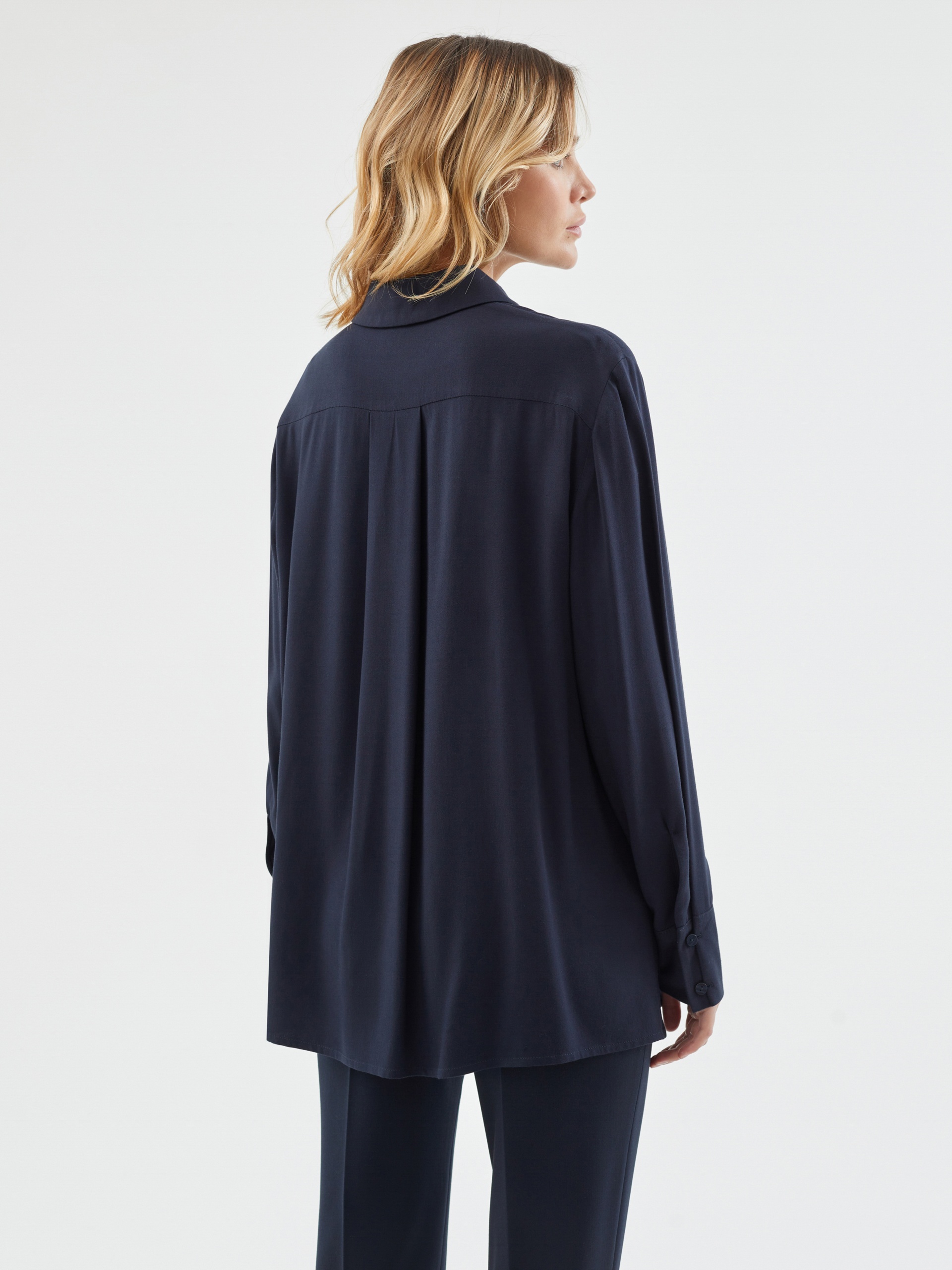 Стильная рубашка прямого силуэта из 100% вискозы в темно-синем цвете с отложным воротником и втачным рукавом полной длины на манжете. Застежка спереди на пуговицы, по бокам небольшие разрезы. Эта модель поможет создать отличный базовый осенний образ в комплекте с брюками или юбкой.