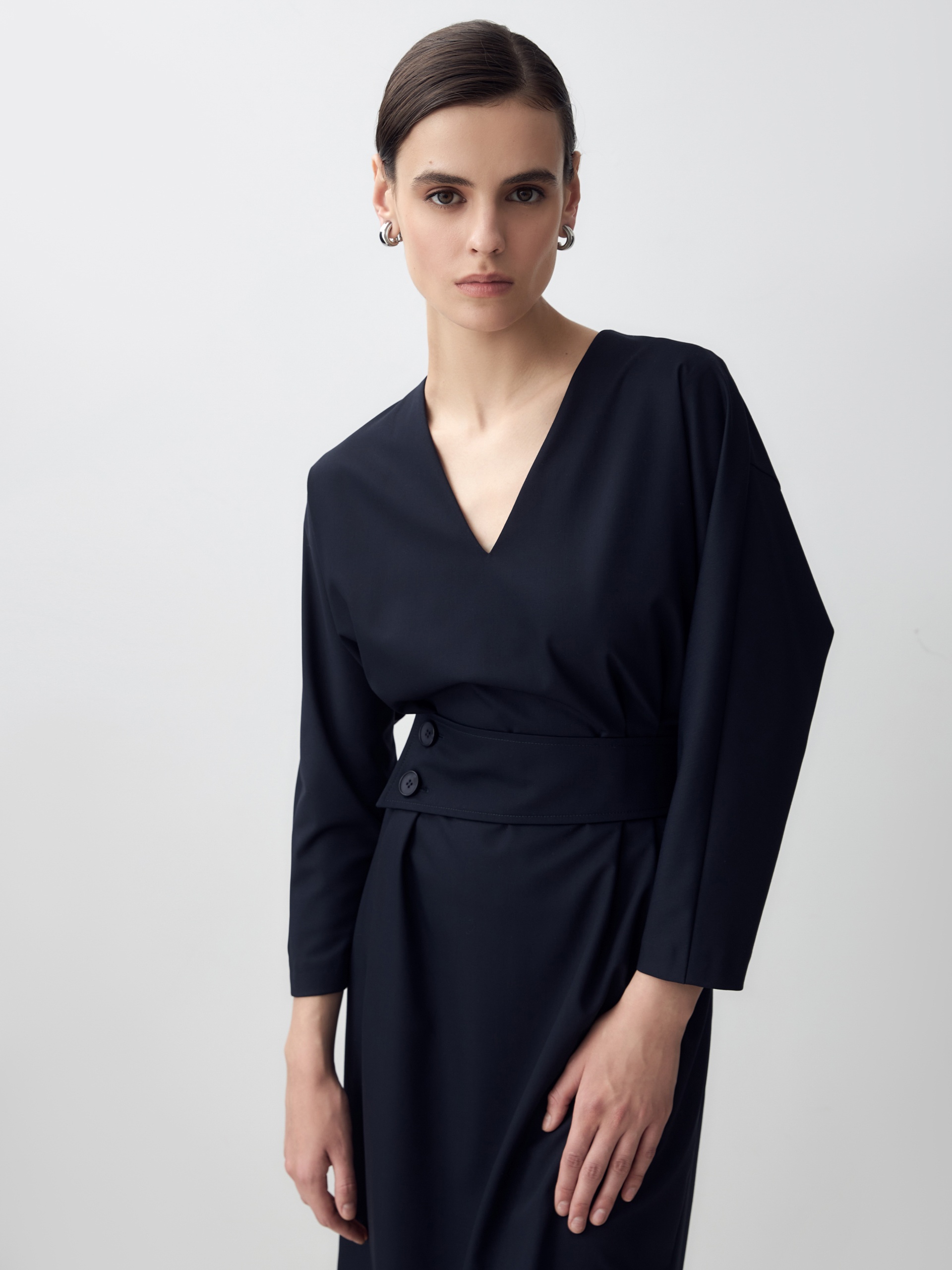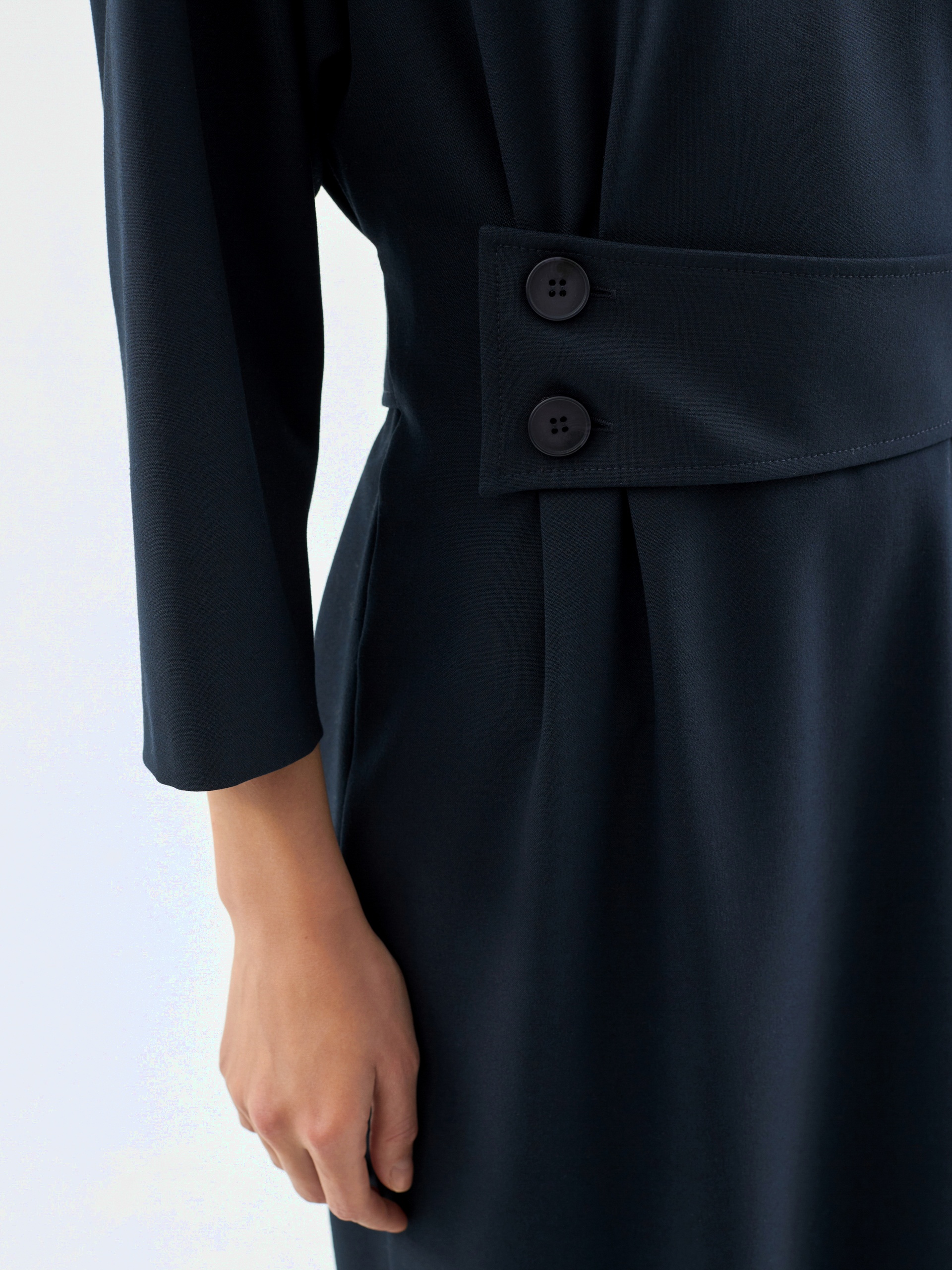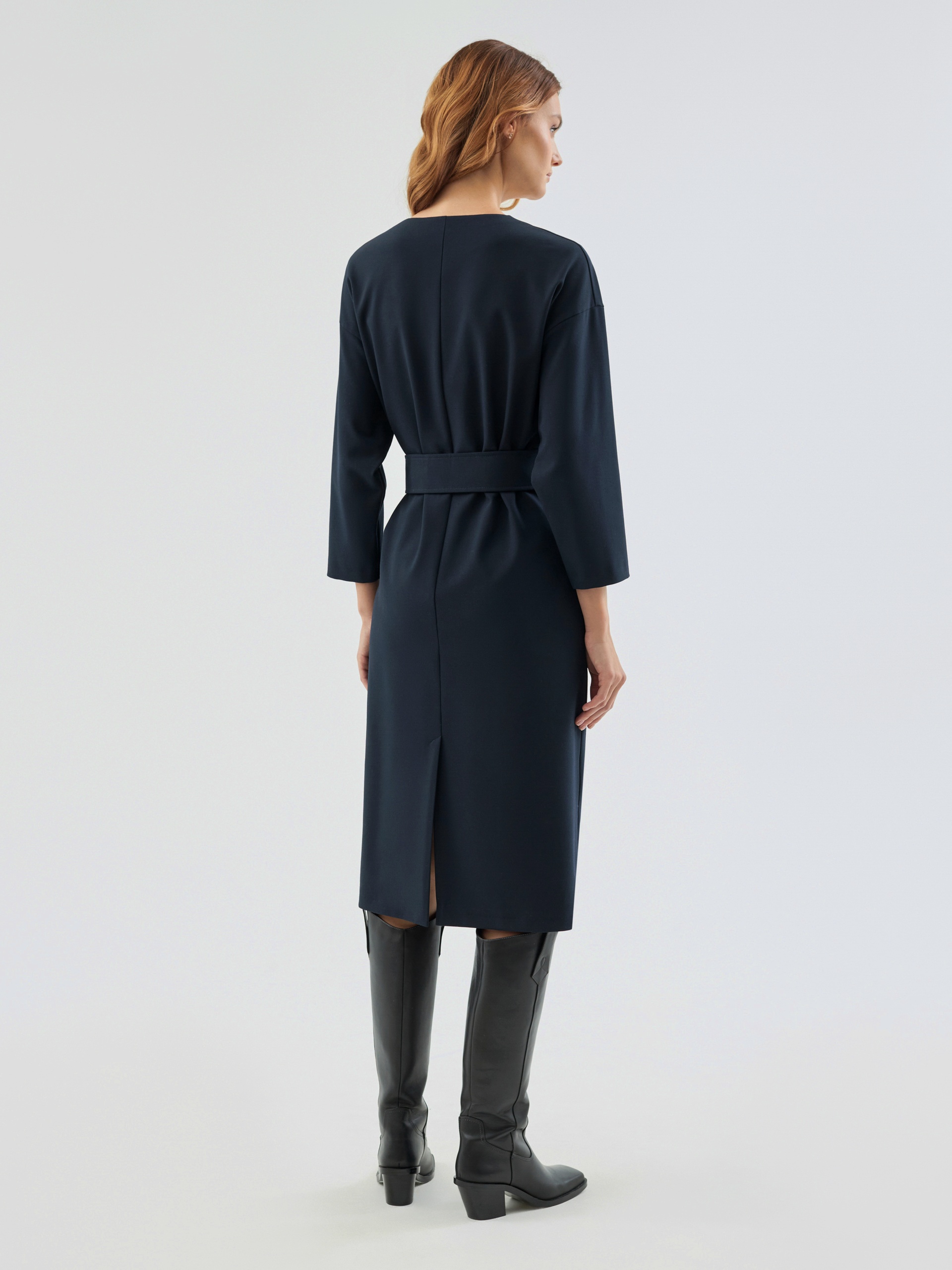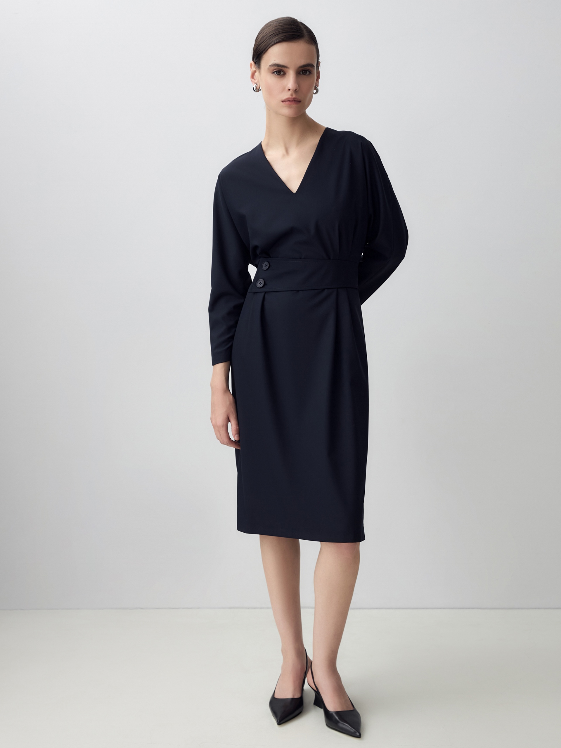 Прямое платье миди в стиле smart casual из вискозной ткани в темно-синем цвете с V-образным вырезом. Мягкое спущенное плечо и втачной пояс.