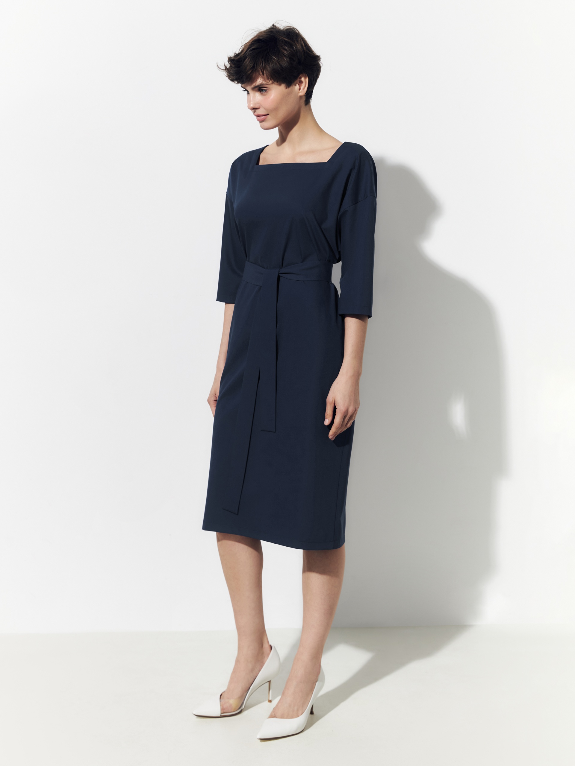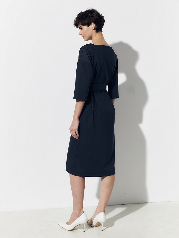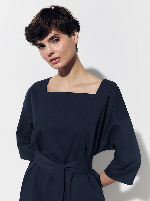 Платье из плательной ткани в темно-синем цвете, свободного силуэта без застежки, вырез платья оформлен формой "каре" и спущенным плечом. Пояс из основной ткани фиксирует талию и добавляет мягкие складки. Есть потайные карманы в швах.