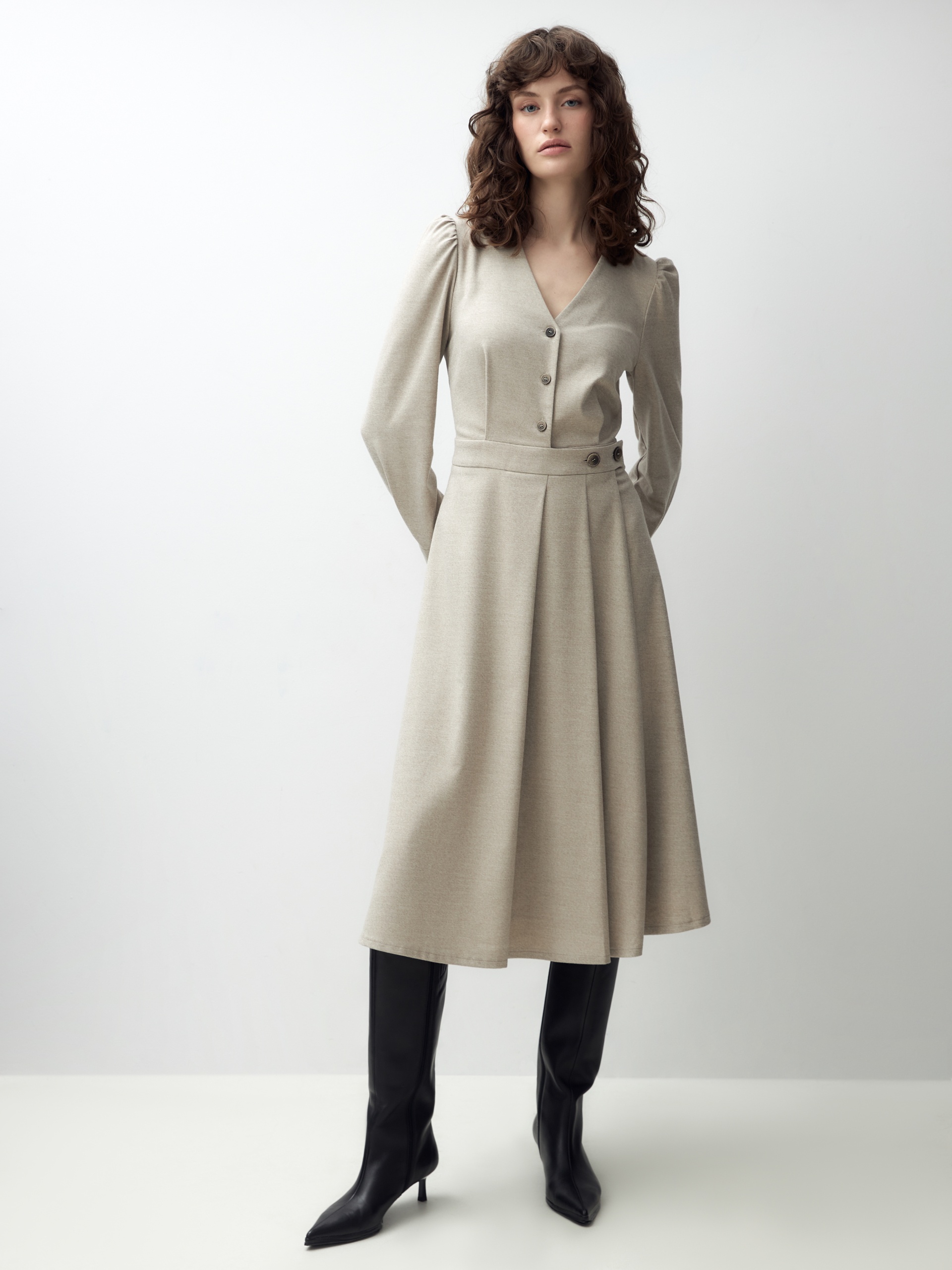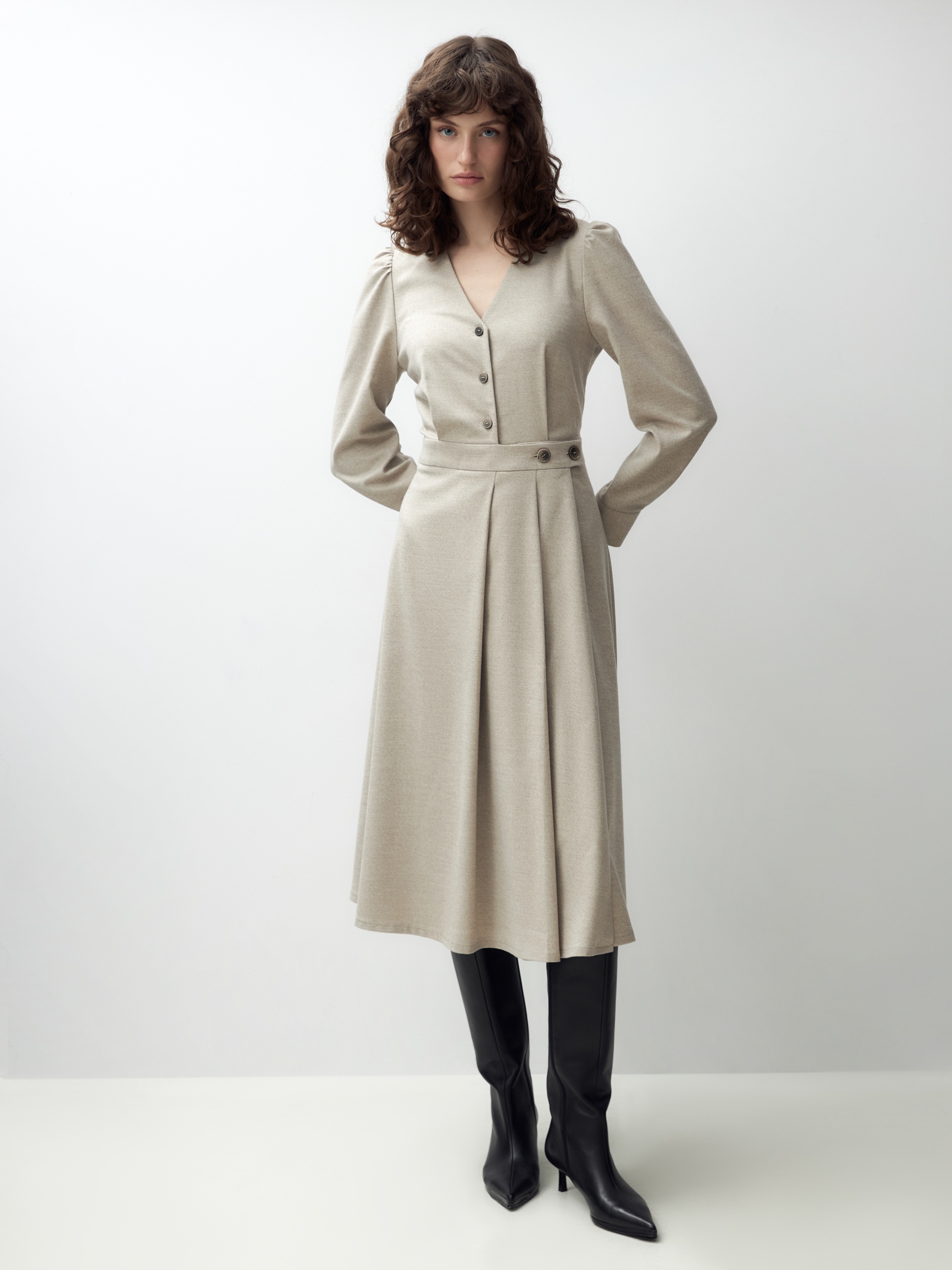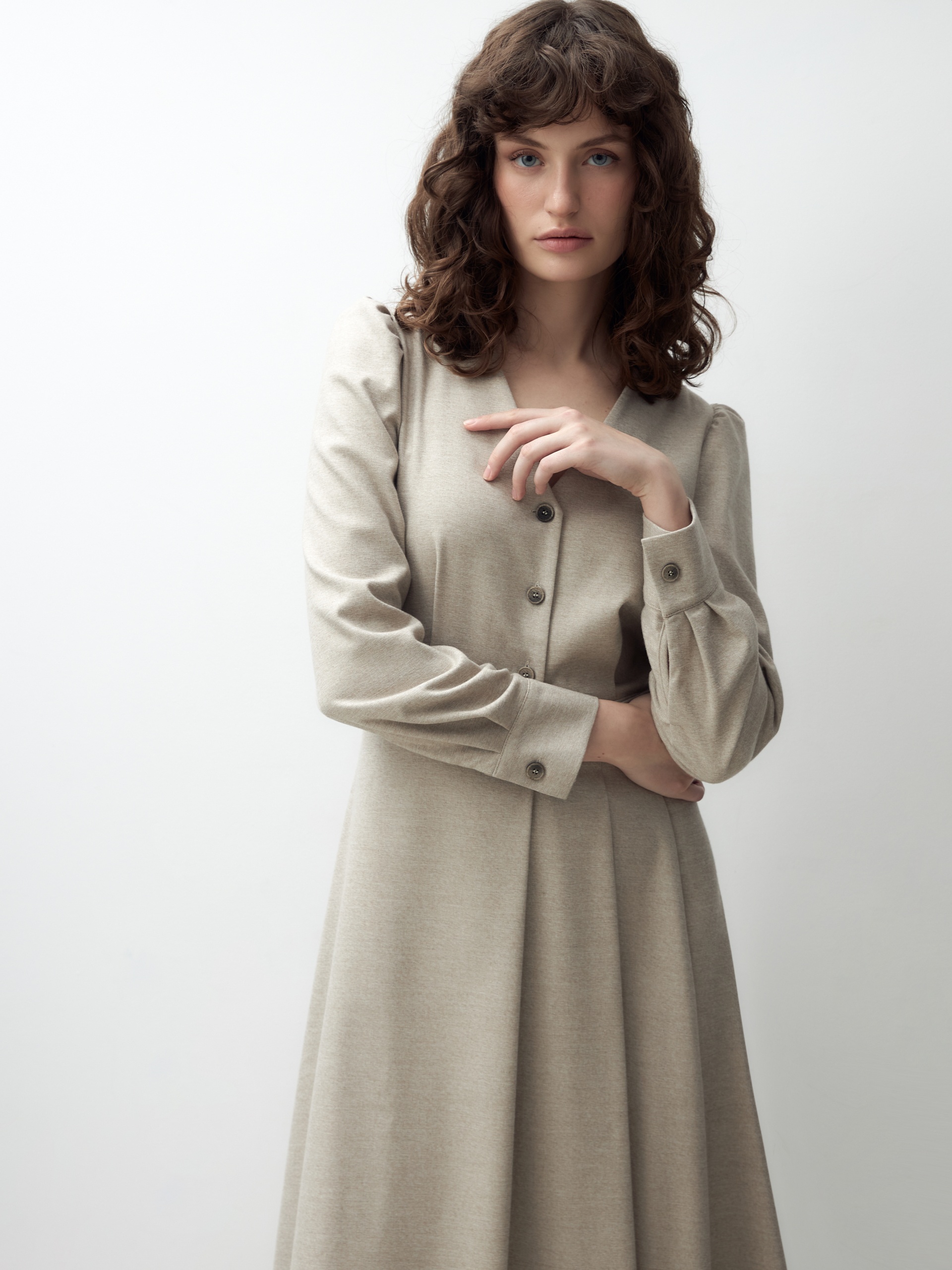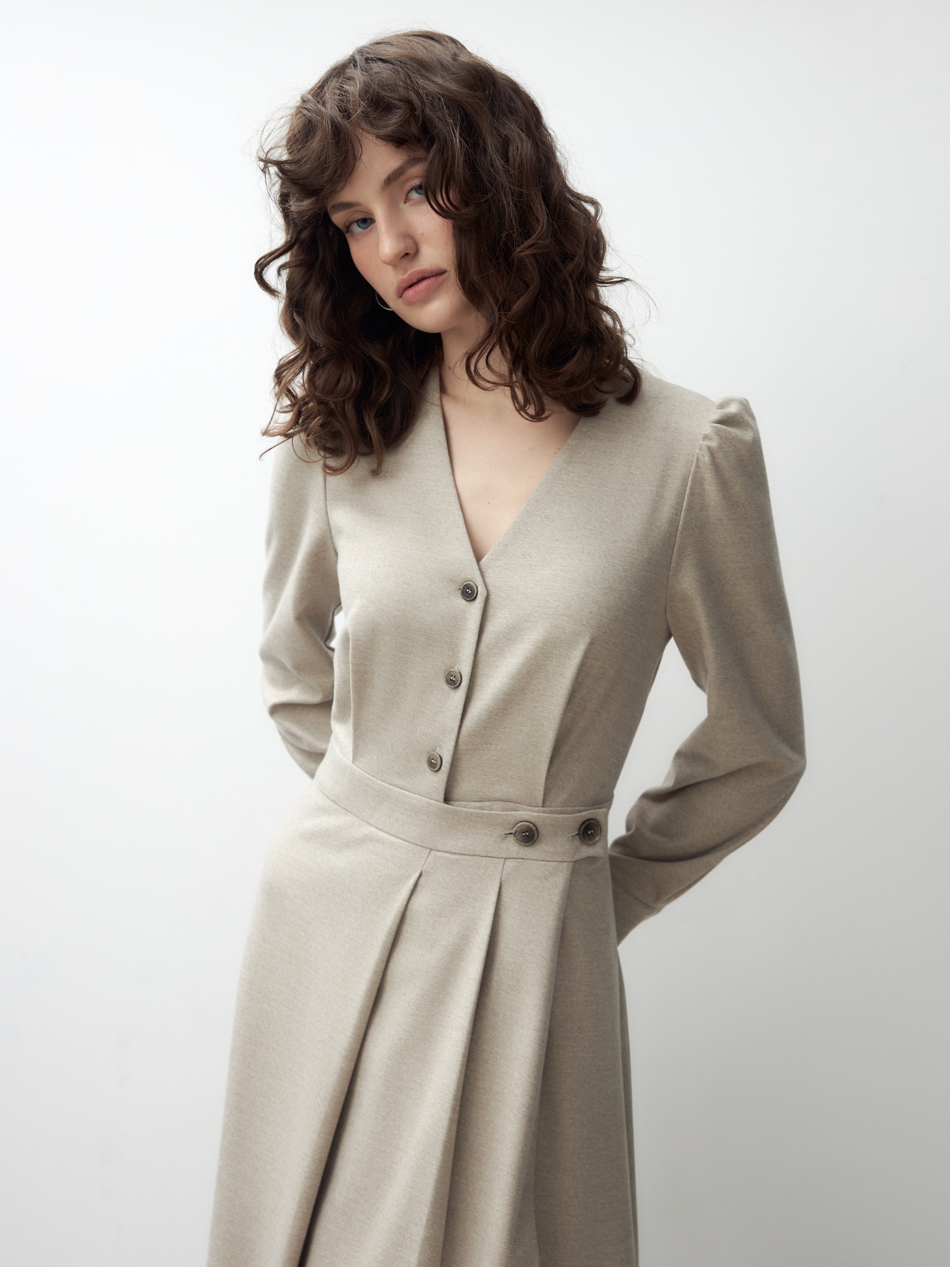 Романтичное приталенное платье на запах выполнено из костюмной ткани в светло-бежевом цвете. Платье с V-образным вырезом на пуговицах и поясом на талии. Юбка платья на запах со складками крепится на поясе с помощью пуговиц. Рукава втачные со сборкой по окату с манжетами. Платье на частичной подкладке.