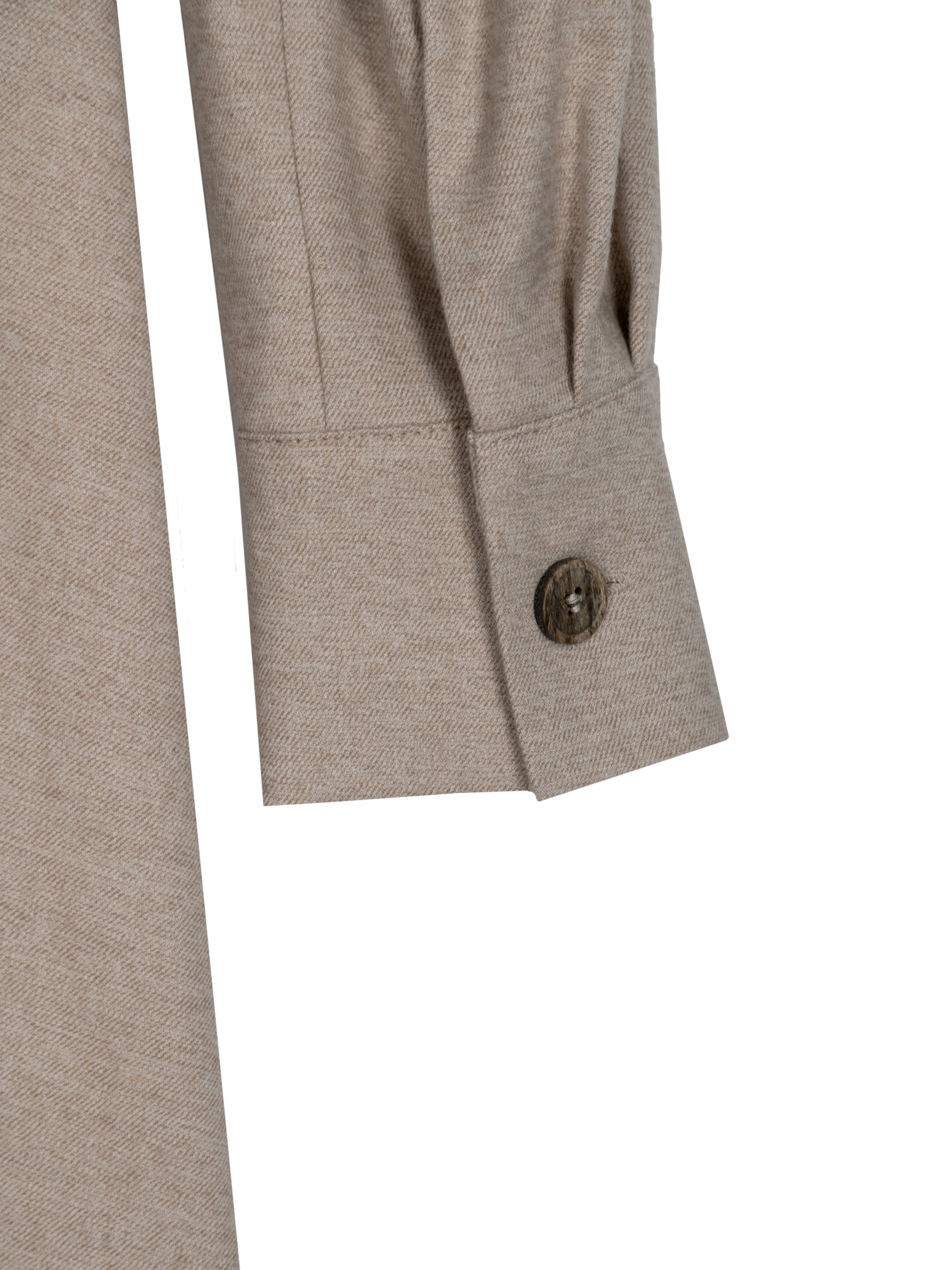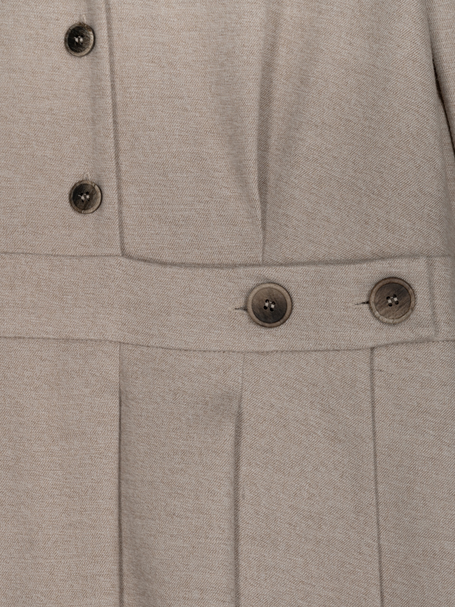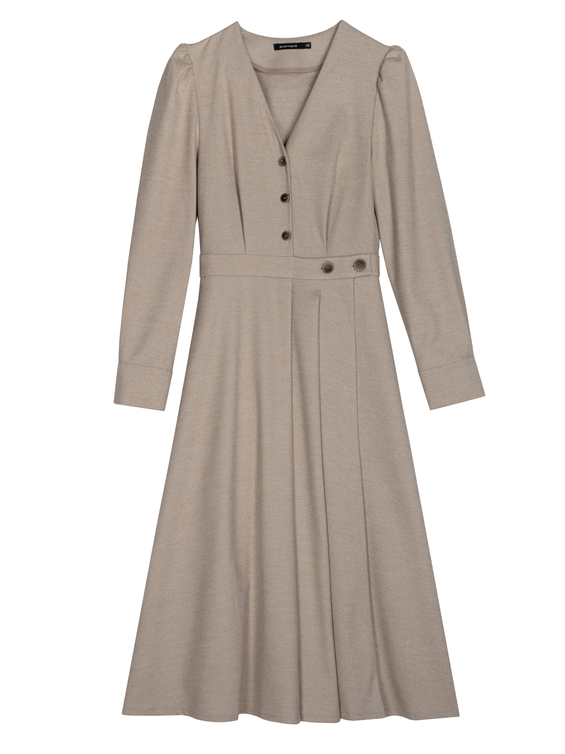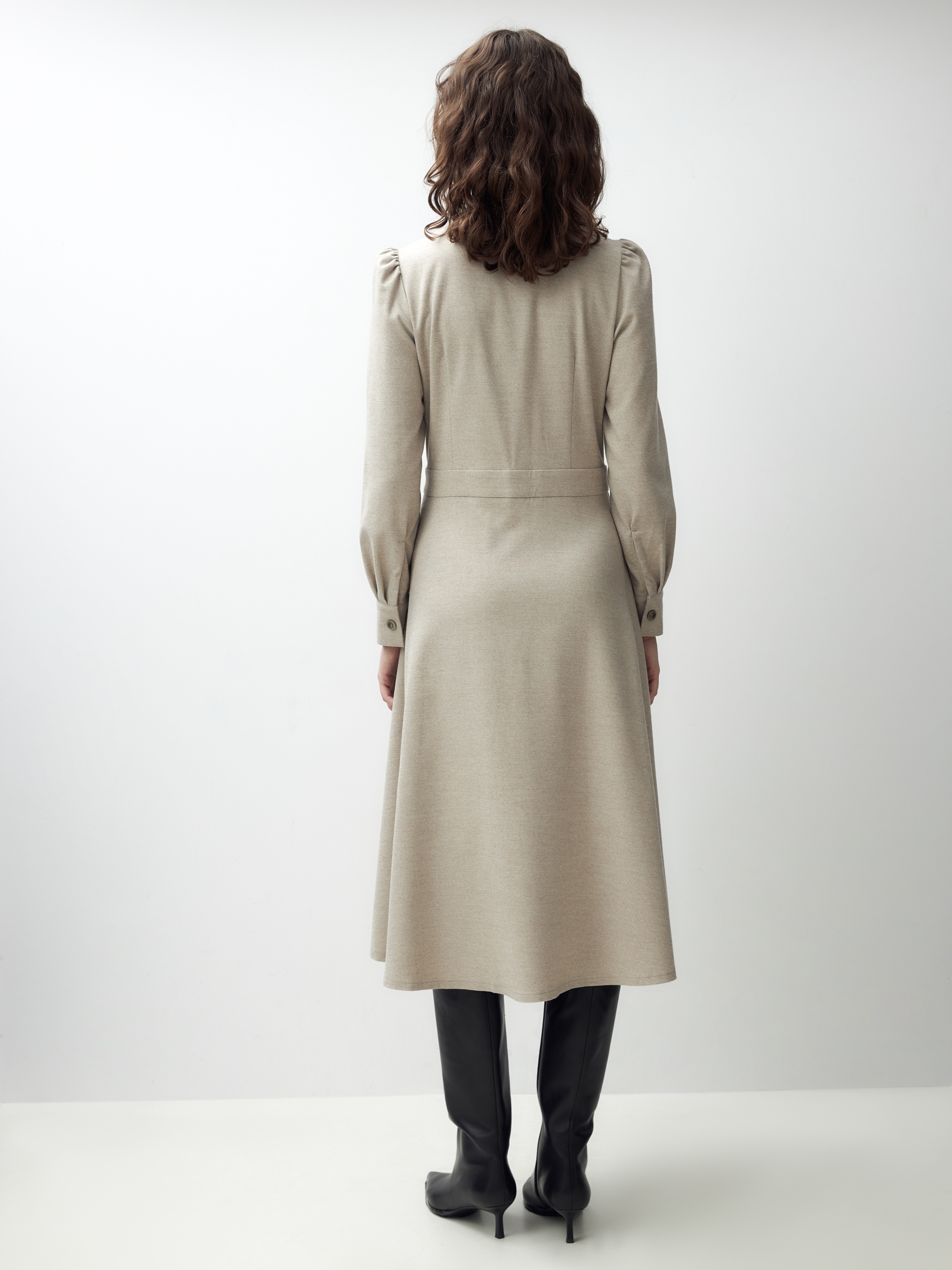 Романтичное приталенное платье на запах выполнено из костюмной ткани в светло-бежевом цвете. Платье с V-образным вырезом на пуговицах и поясом на талии. Юбка платья на запах со складками крепится на поясе с помощью пуговиц. Рукава втачные со сборкой по окату с манжетами. Платье на частичной подкладке.