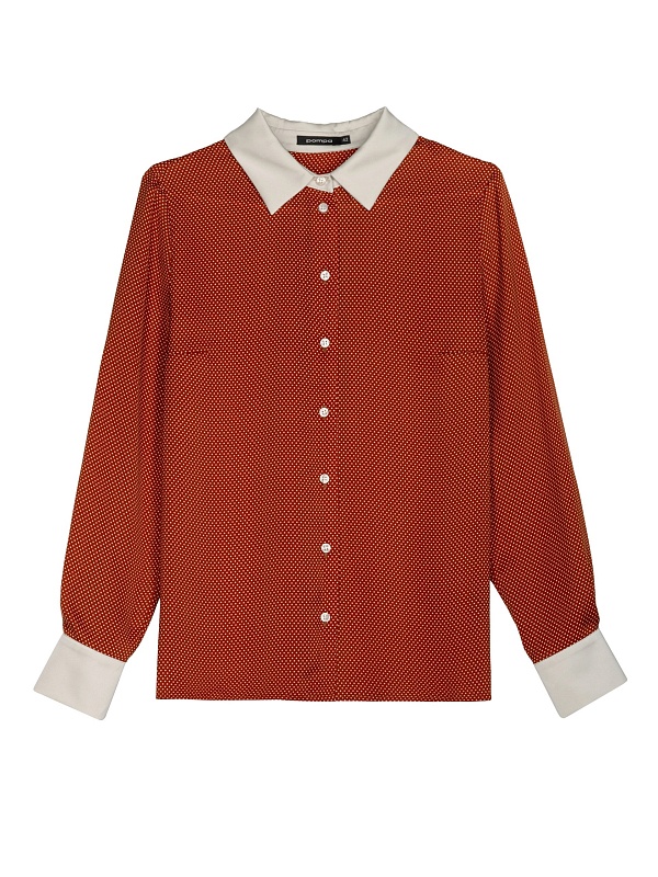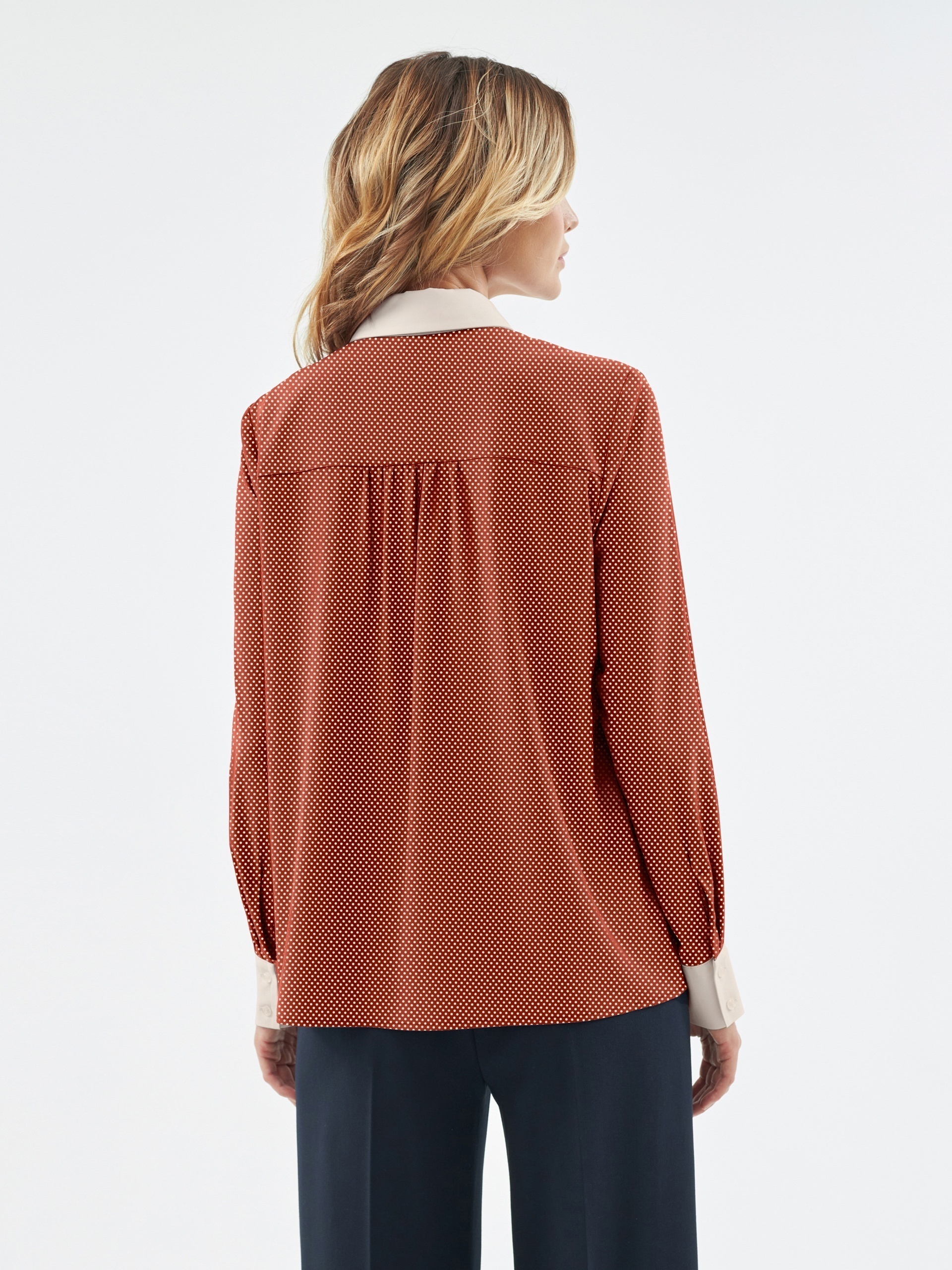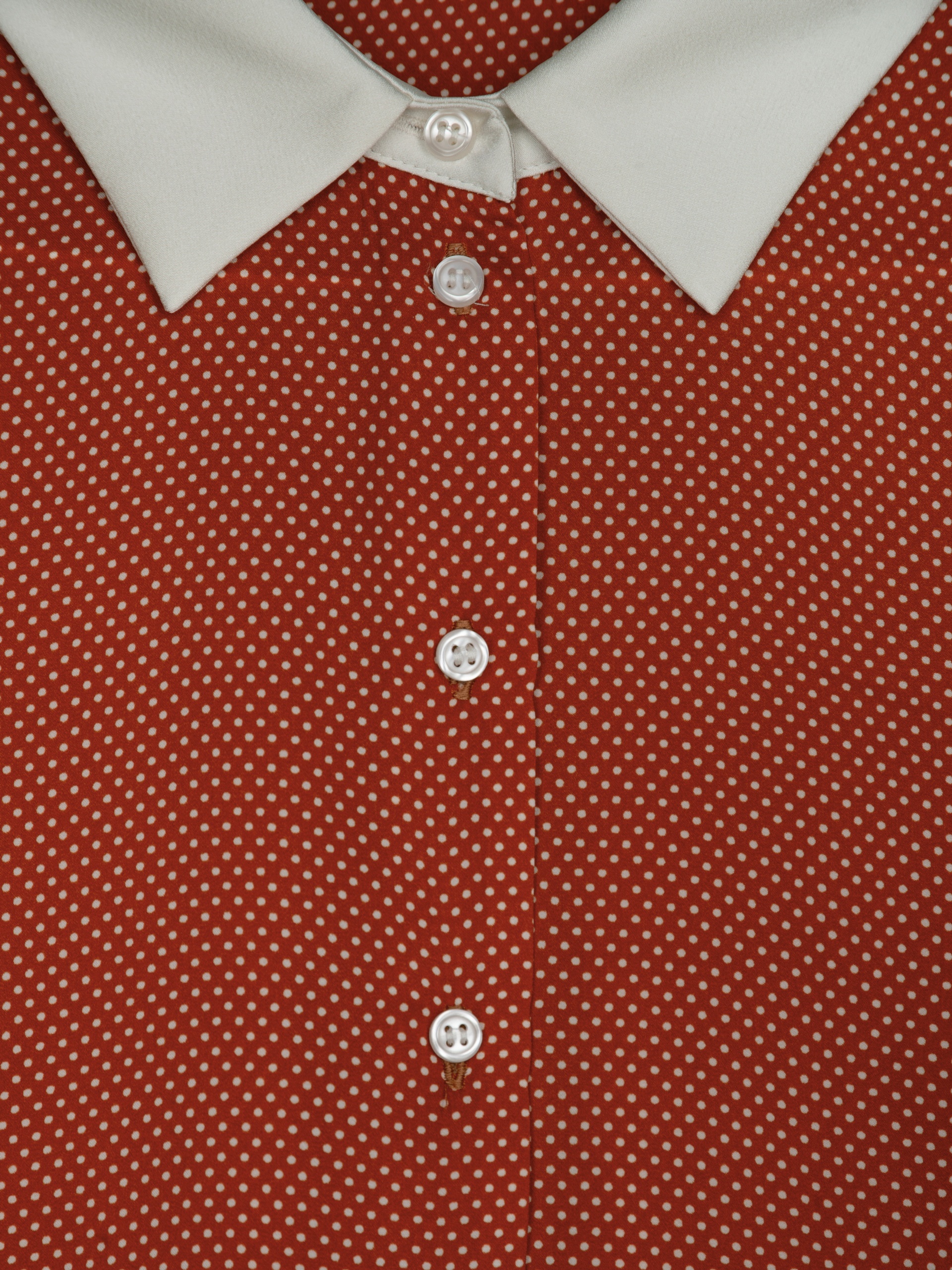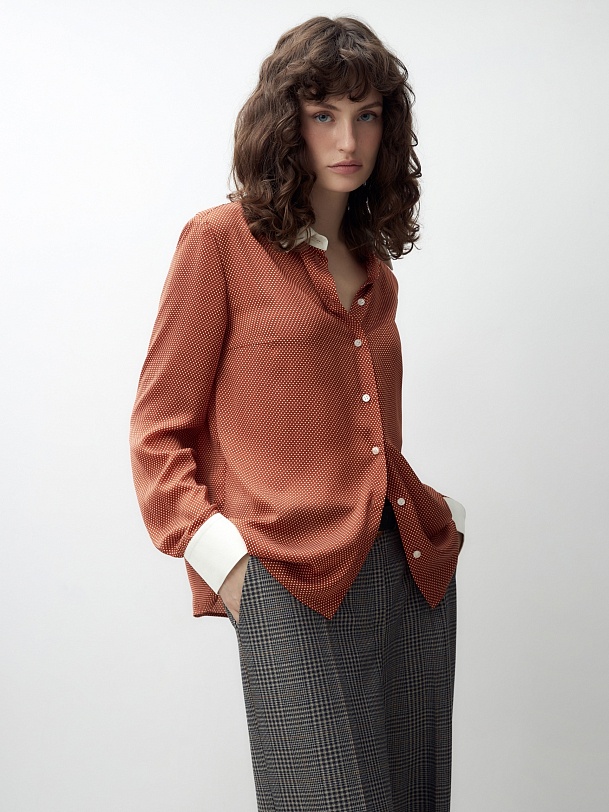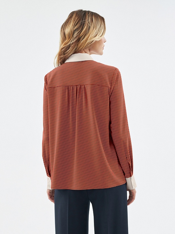 Романтичная прямая блуза классического силуэта из плательной ткани кирпичного цвета с мелким принтом "polka dot". Воротник и манжеты выполнены из контрастной ткани. Застежка на пуговицы. По спинке кокетка со сборкой.