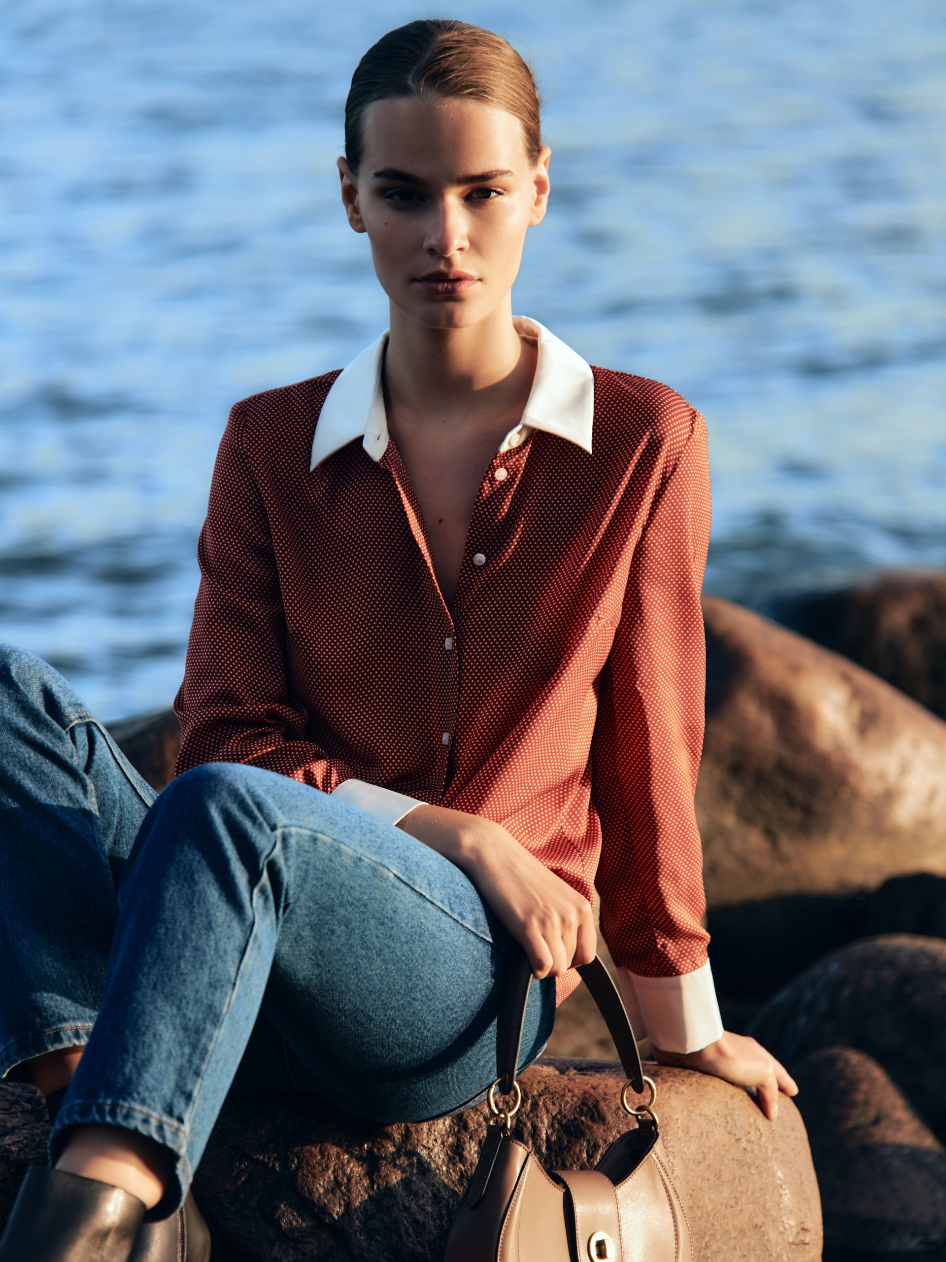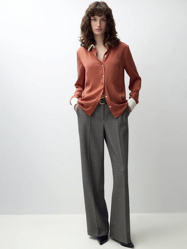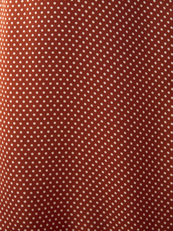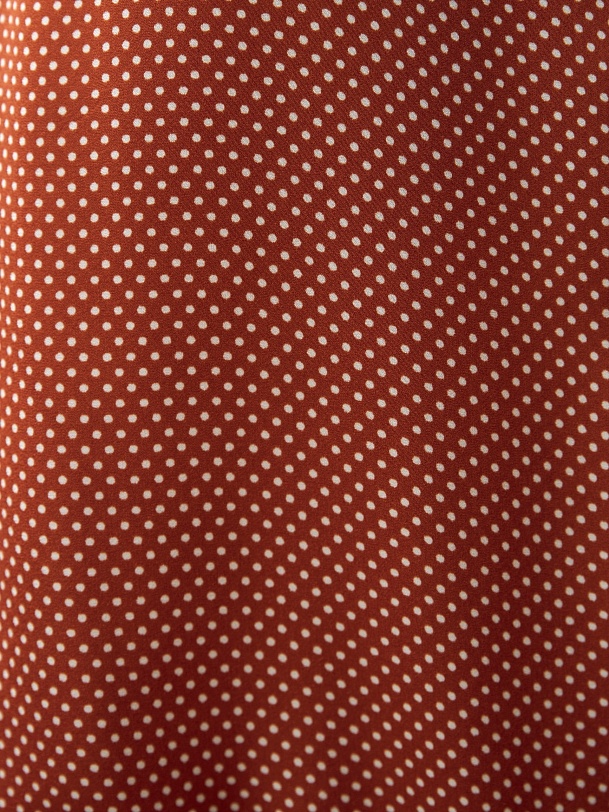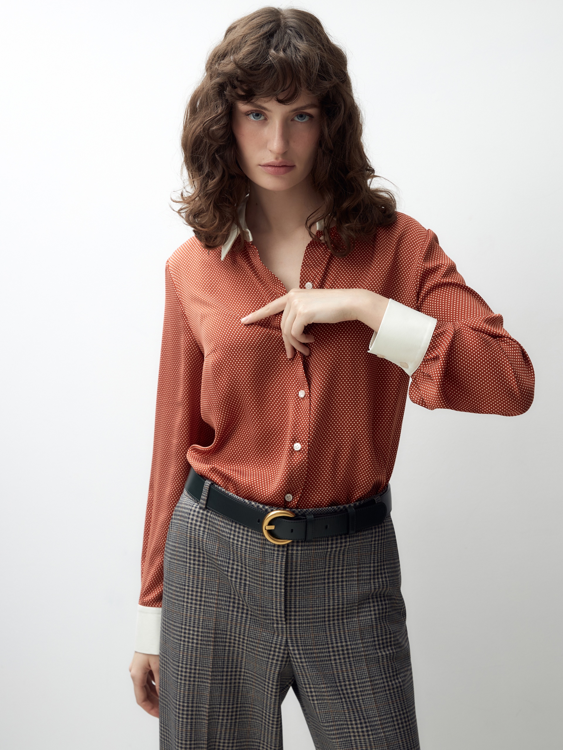 Романтичная прямая блуза классического силуэта из плательной ткани кирпичного цвета с мелким принтом "polka dot". Воротник и манжеты выполнены из контрастной ткани. Застежка на пуговицы. По спинке кокетка со сборкой.