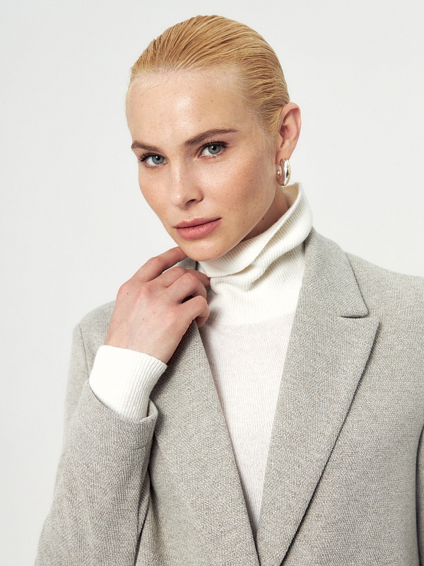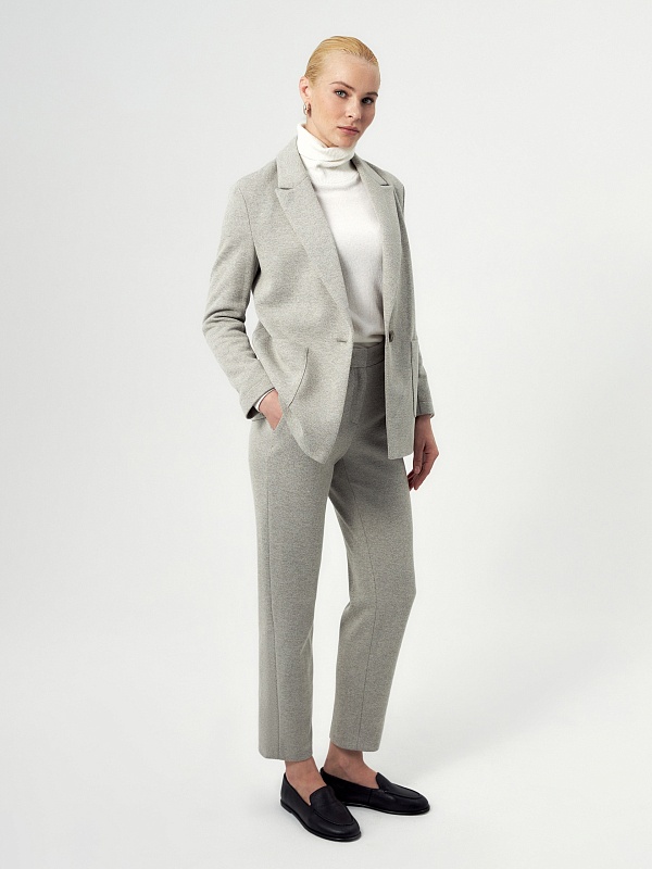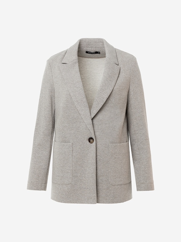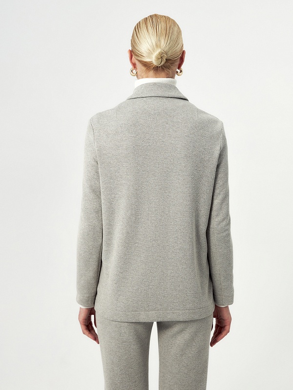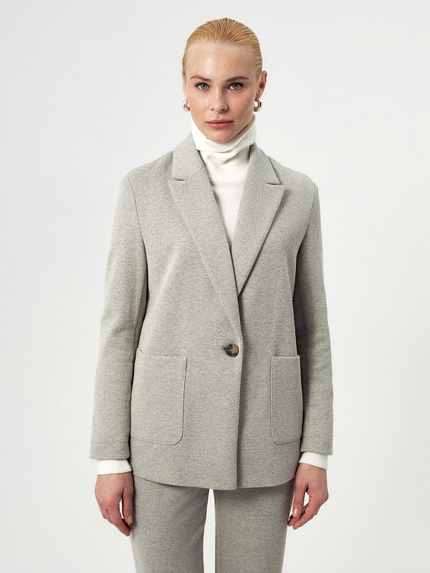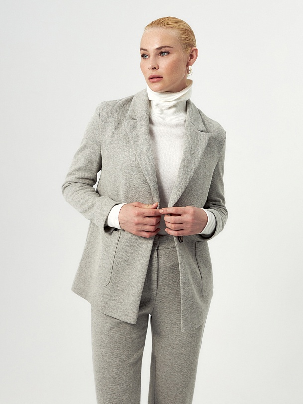 Прямой однобортный жакет в стиле smart casual на одной пуговице с английским воротником из трикотажной ткани с эффектом "елочки". Жакет отлично сочетается с брюками из одной ткани.