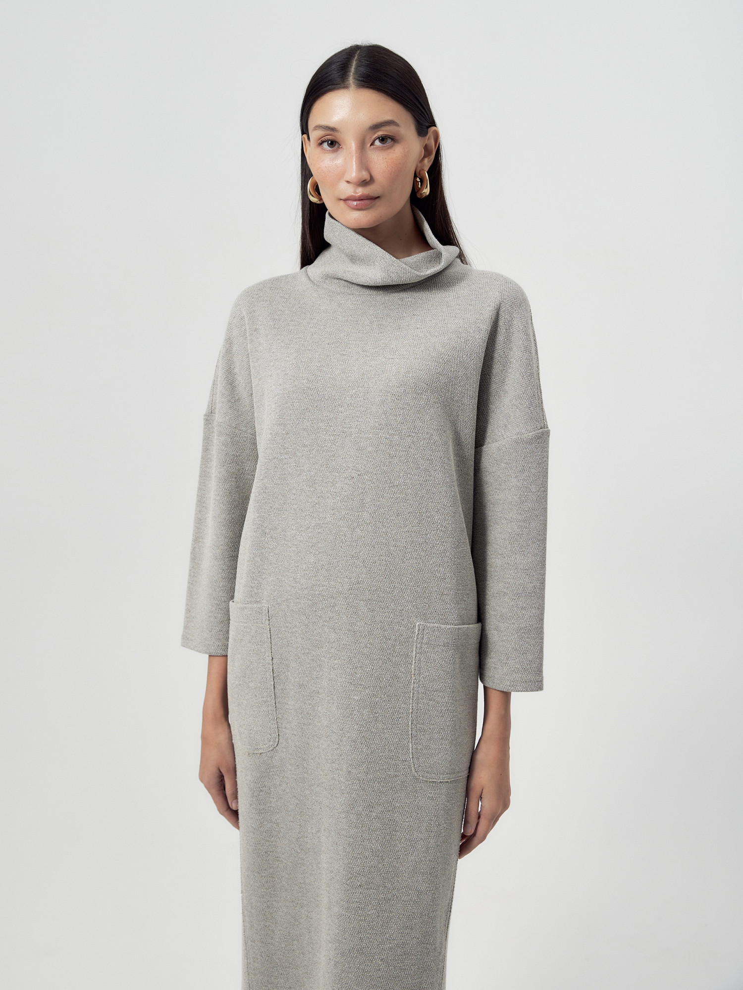 Платье свободного силуэта с накладными карманами и рельефами, переведенными на полочку, что придает фигуре визуальную стройность. Выполнено из трикотажной ткани с эффектом "елочки".