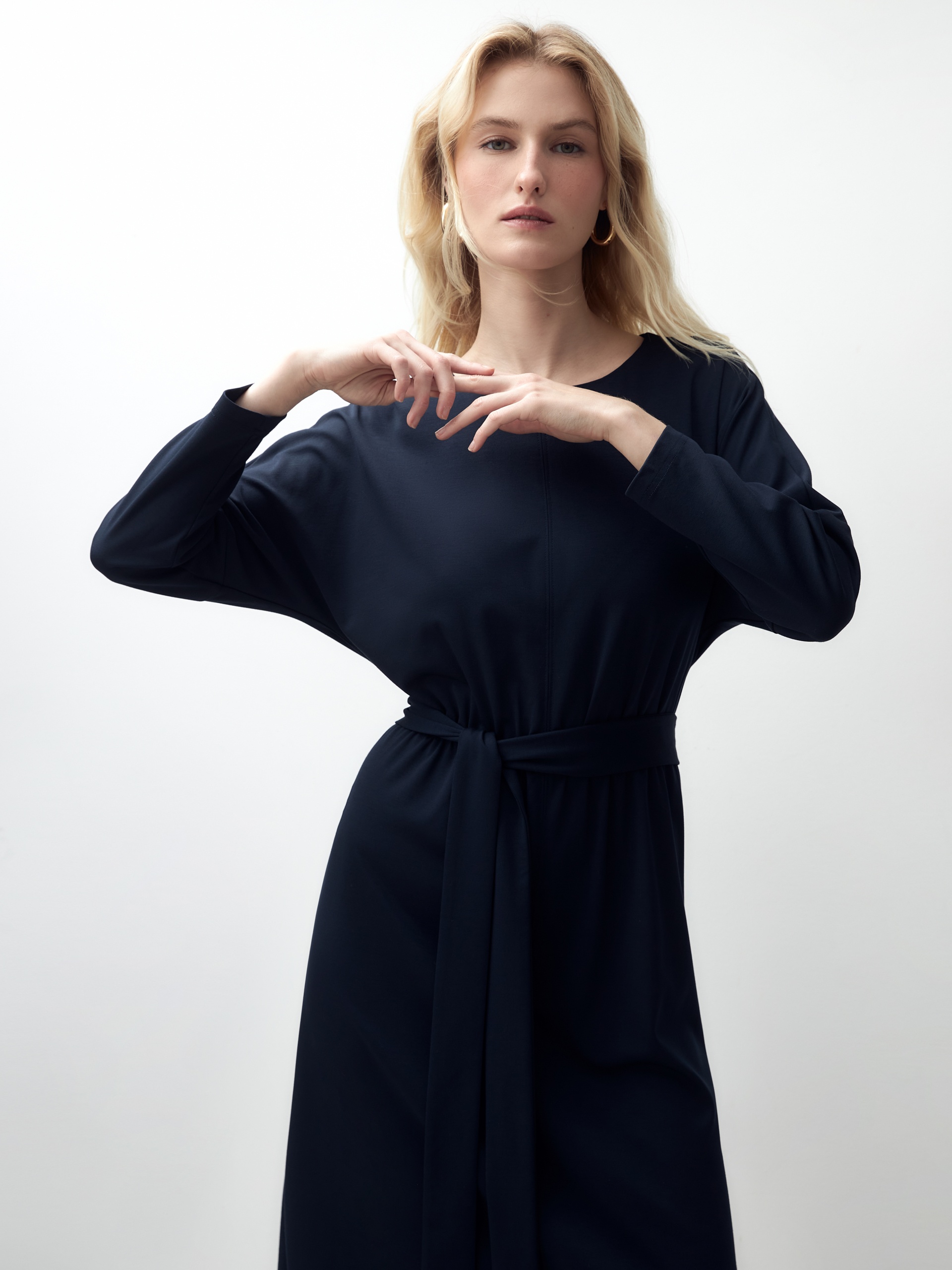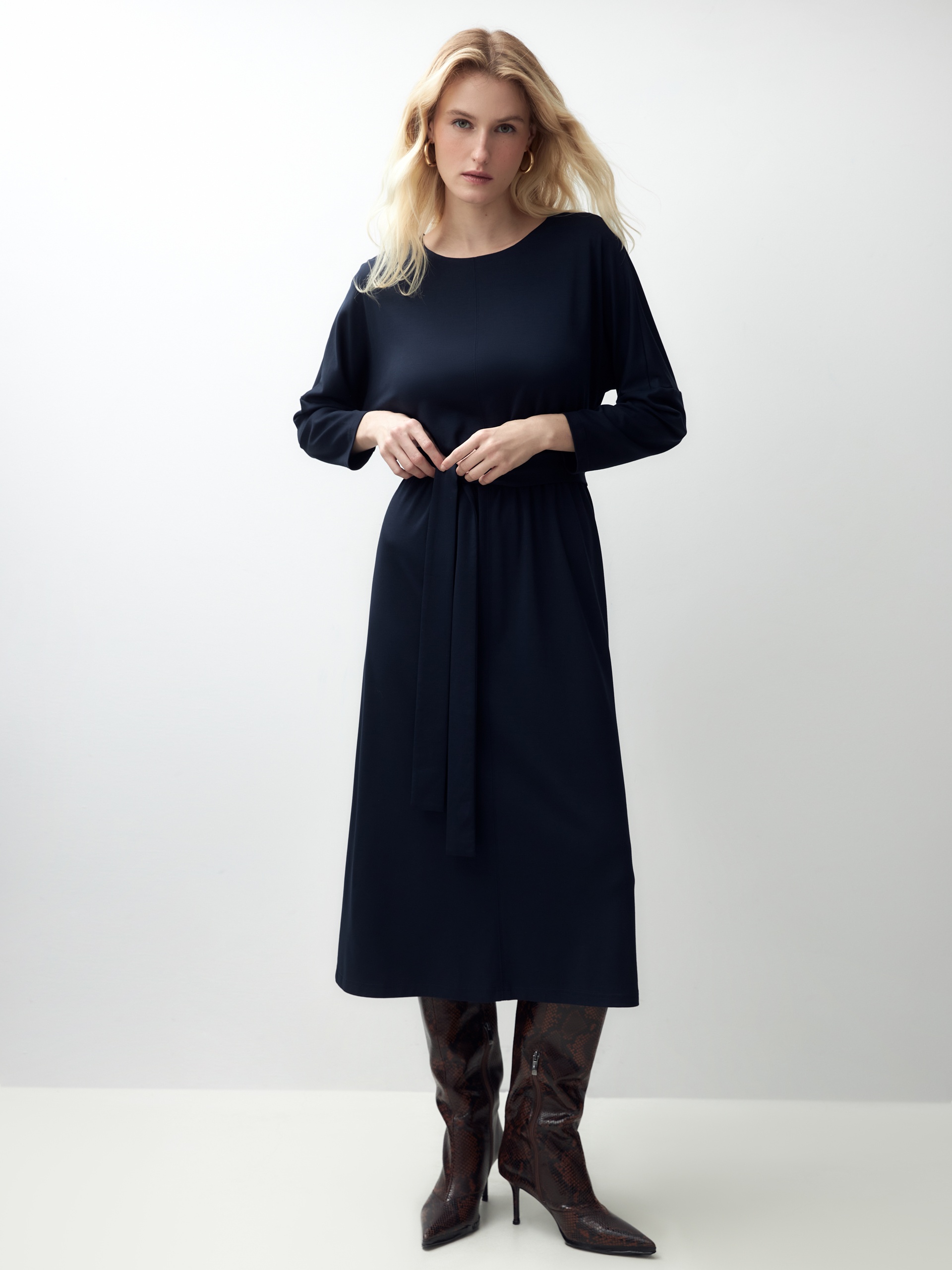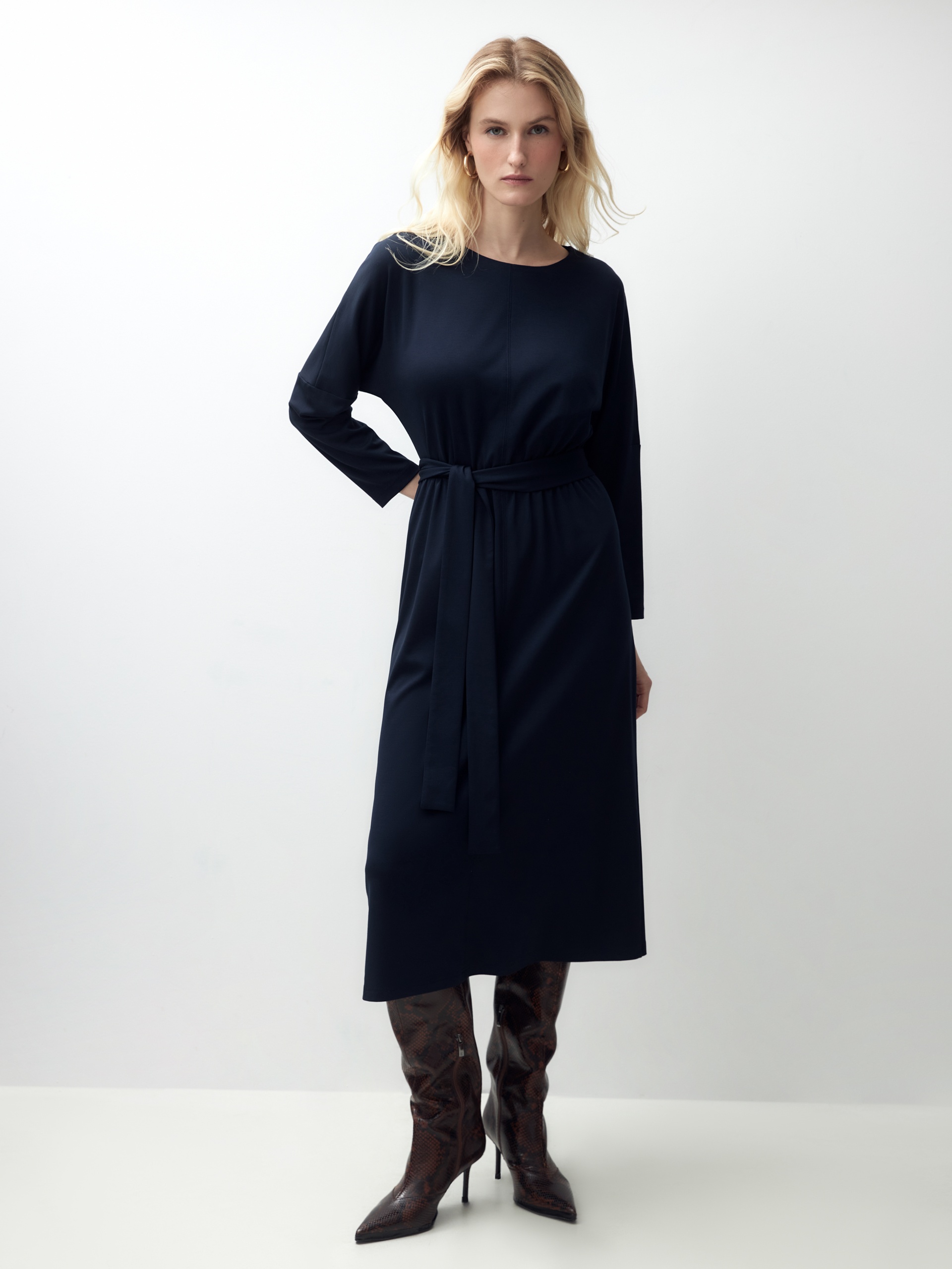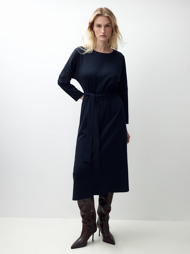 Свободное платье с поясом из трикотажа
