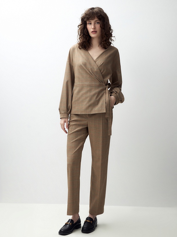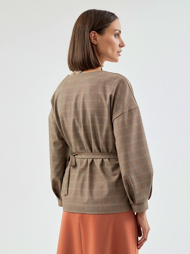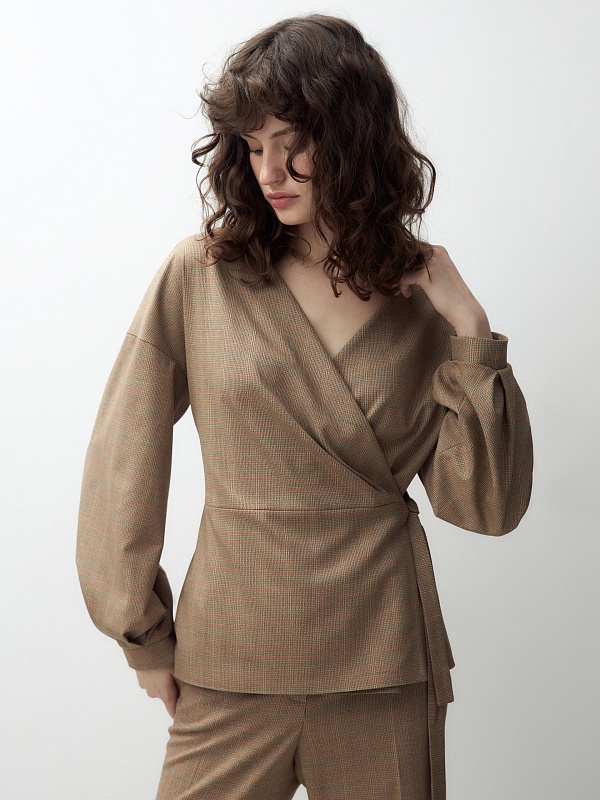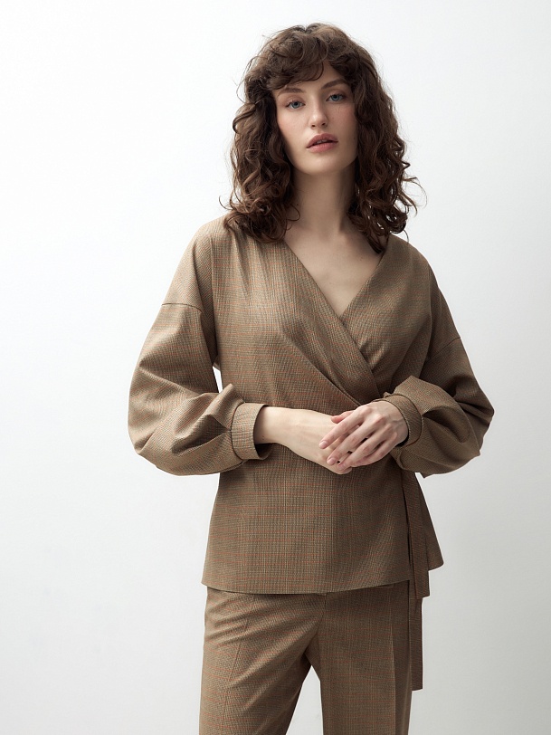 Приталенный жакет на запах с V-образным вырезом с тонким поясом из основной ткани. Спущенное мягкое плечо с рукавом на небольшом манжете и сборкой по низу. Жакет выполнен из костюмной вискозной ткани в бежево-золотистую клетку. Такой мягкий жакет составит идеальный образ с юбкой миди на запах.
