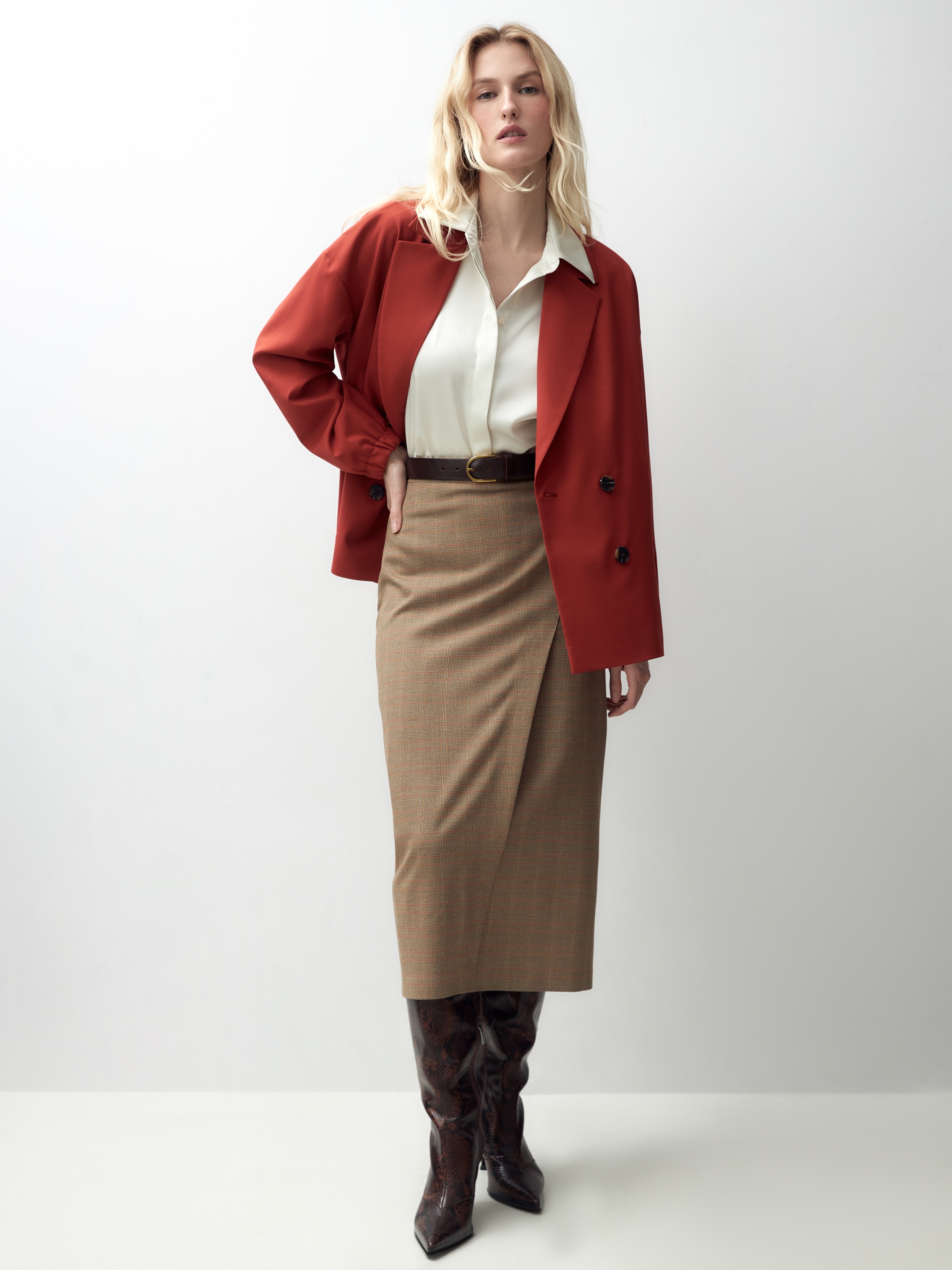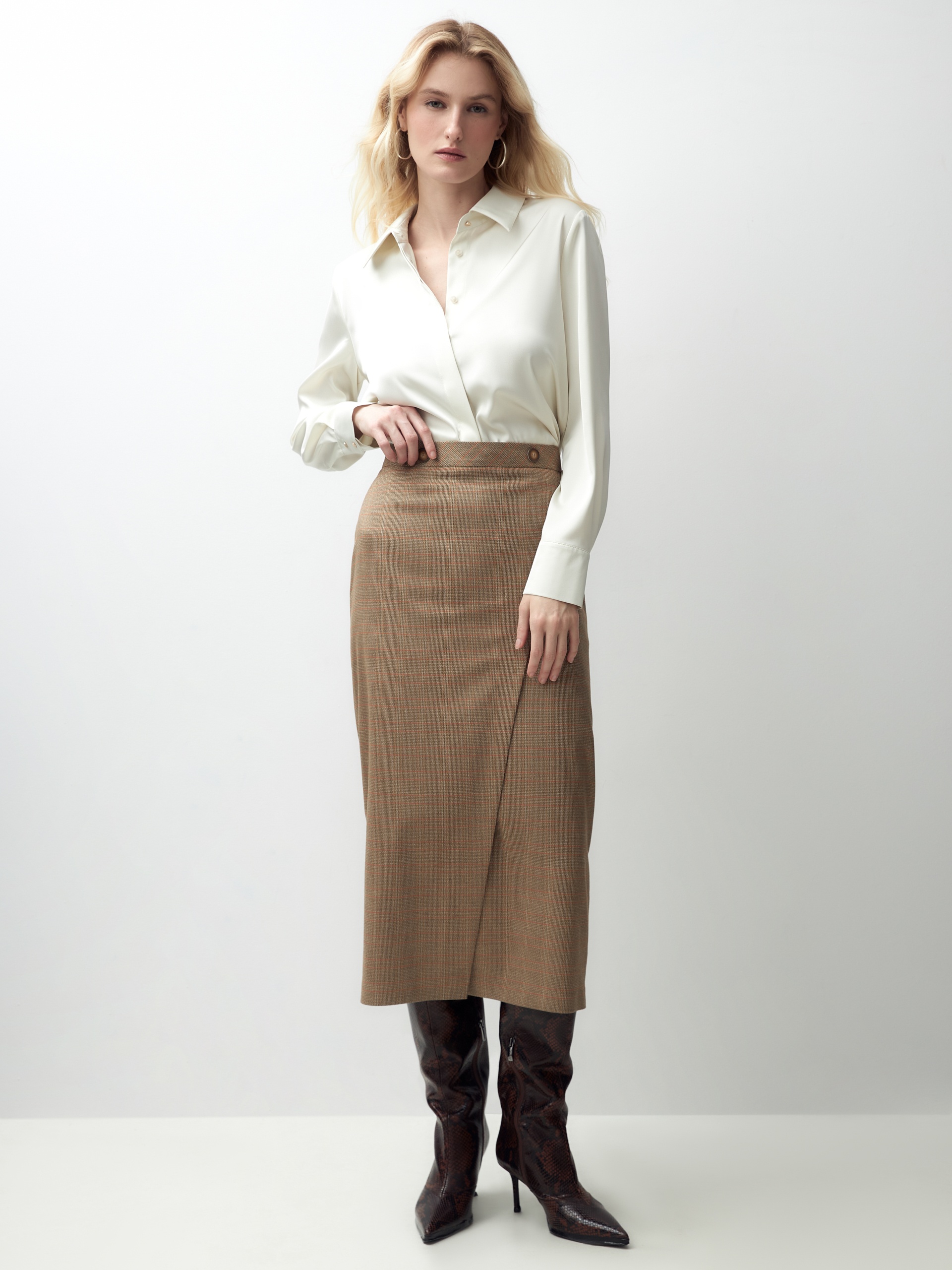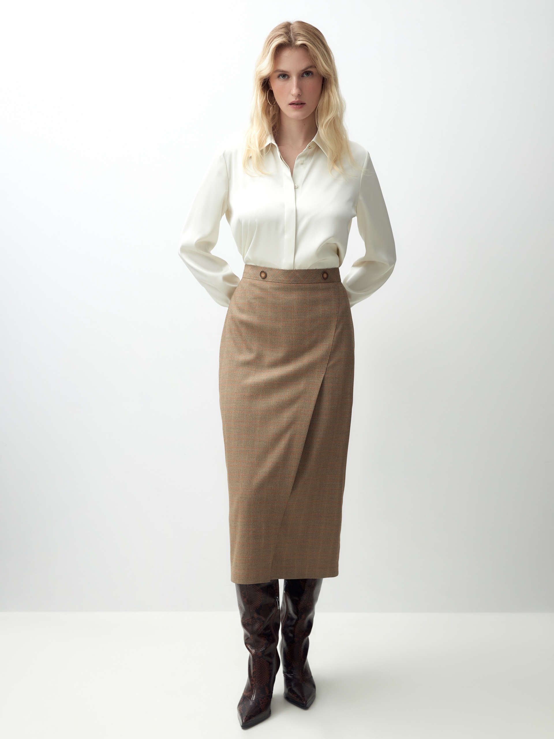 Прилегающая юбка с имитацией запаха на притачном поясе с декоративными пуговицами. Юбка длиной миди выполнена из костюмной ткани в бежево-золотистую клетку.