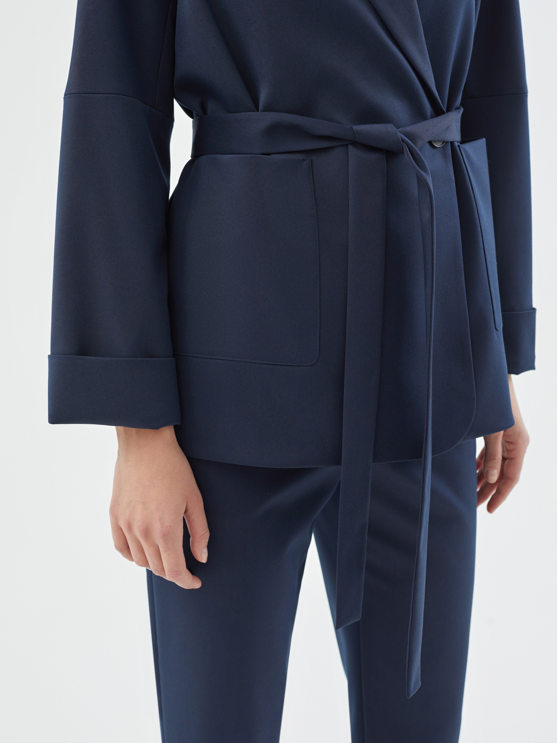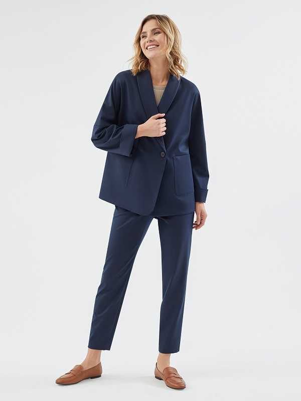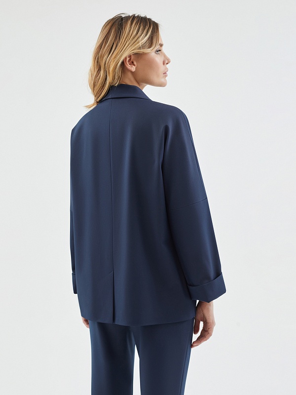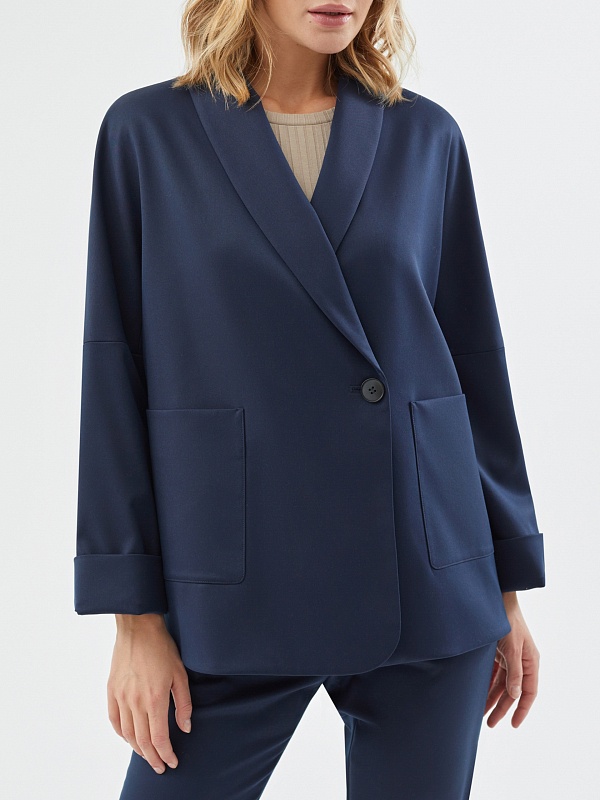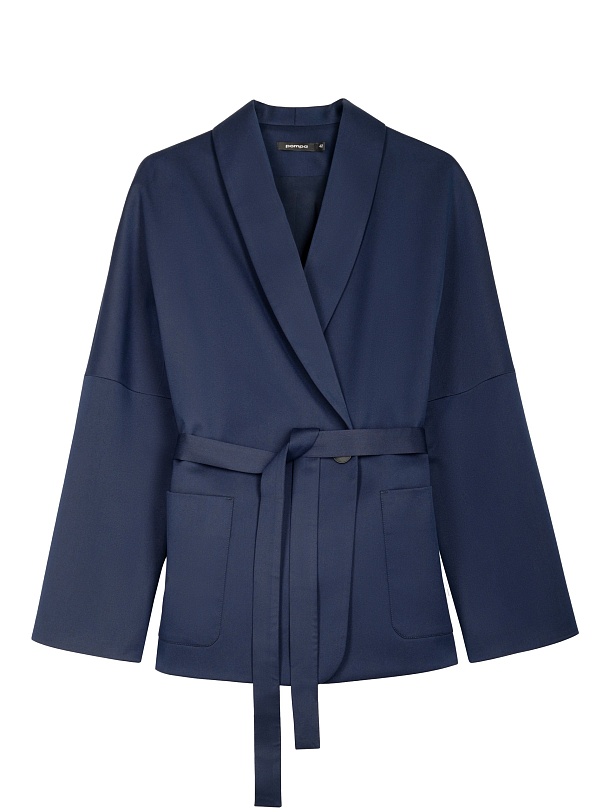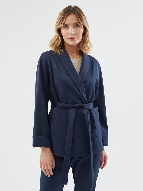 Жакет на подкладке из костюмной ткани прямого силуэта в черно-синем цвете. Модель имеет V-образный вырез, воротник-шаль и рукав кимоно. Спереди два крупных накладных кармана и застежка на пуговицу. В комплект входит пояс из основной ткани для создания более приталенного силуэта.