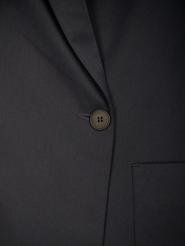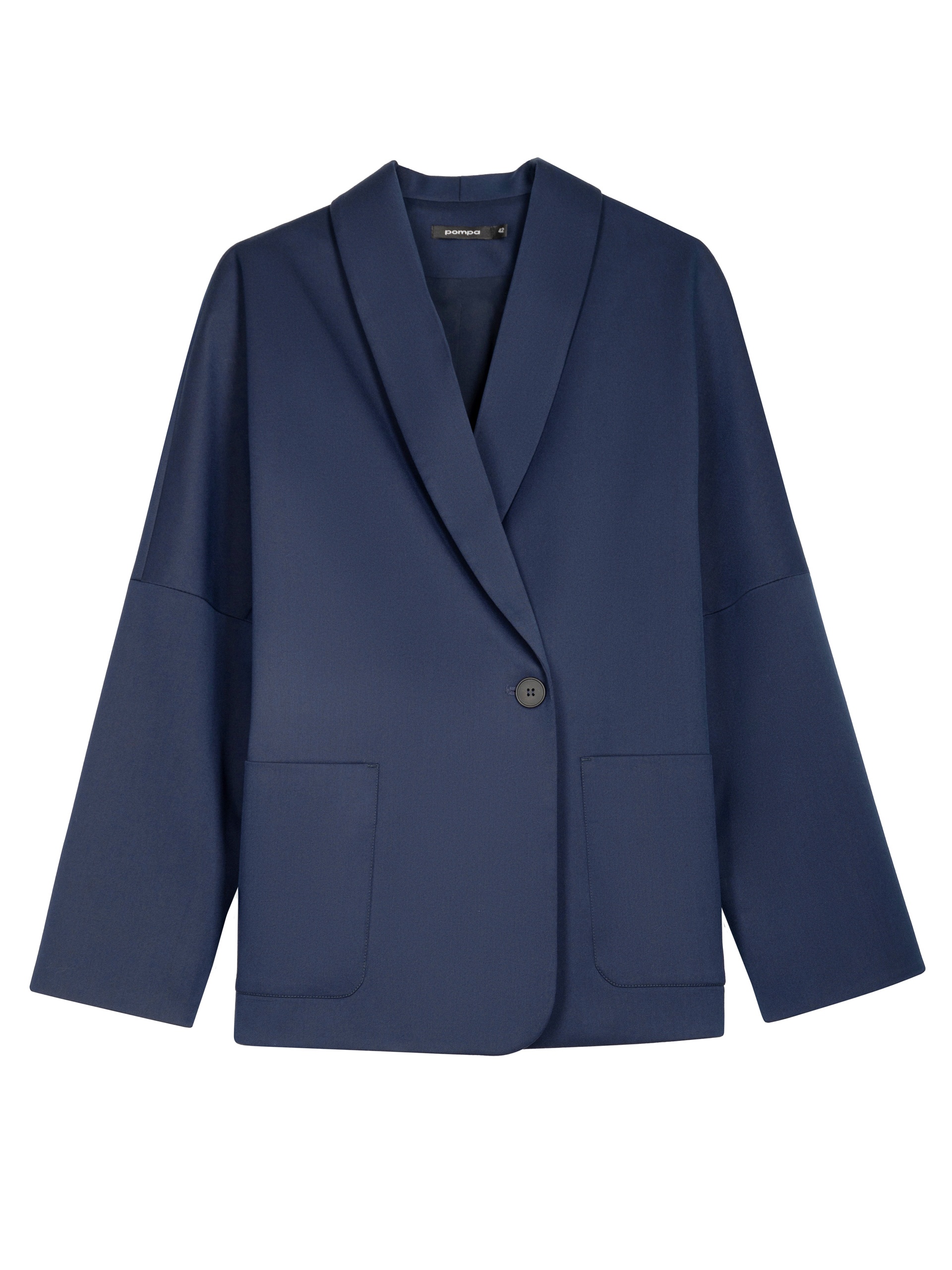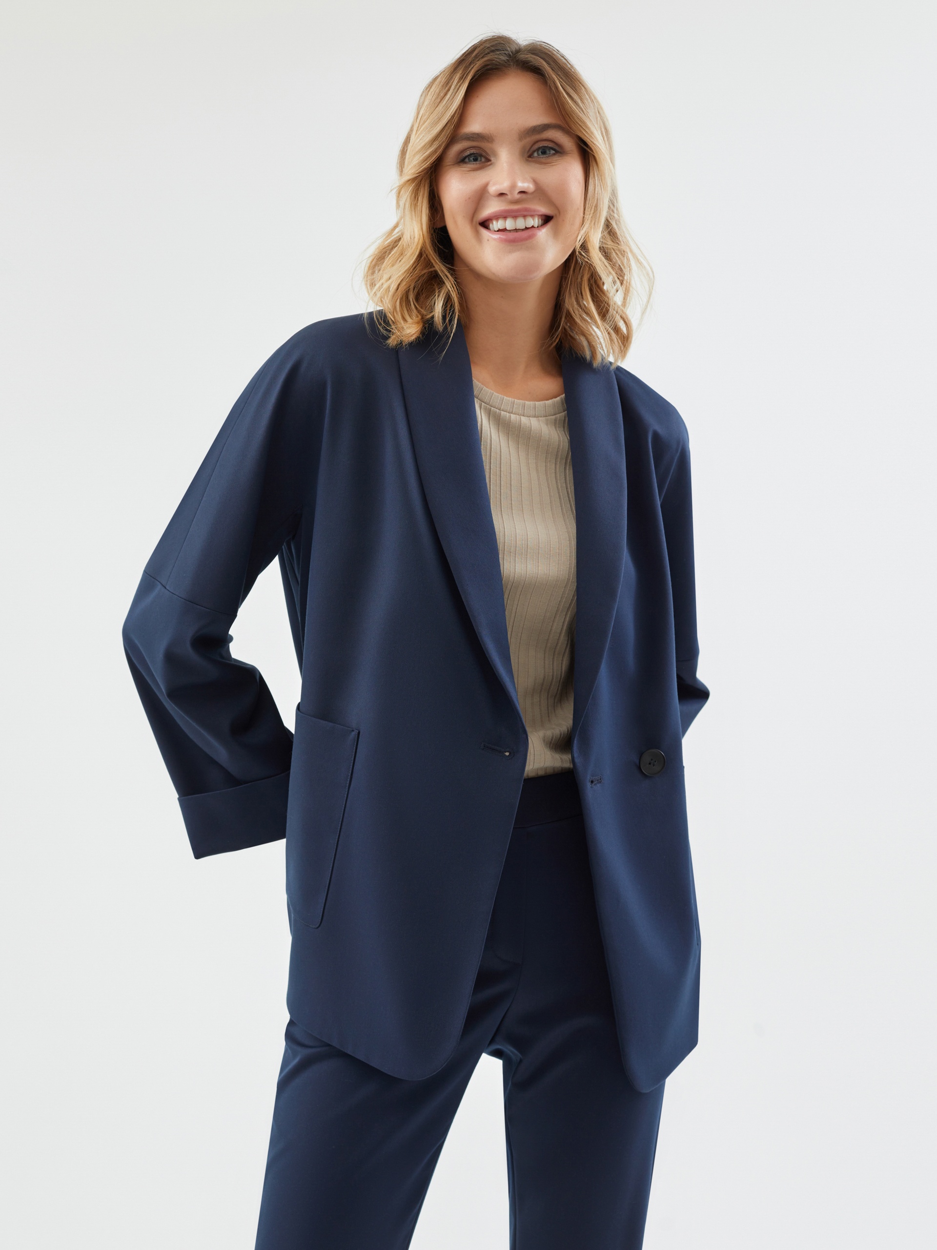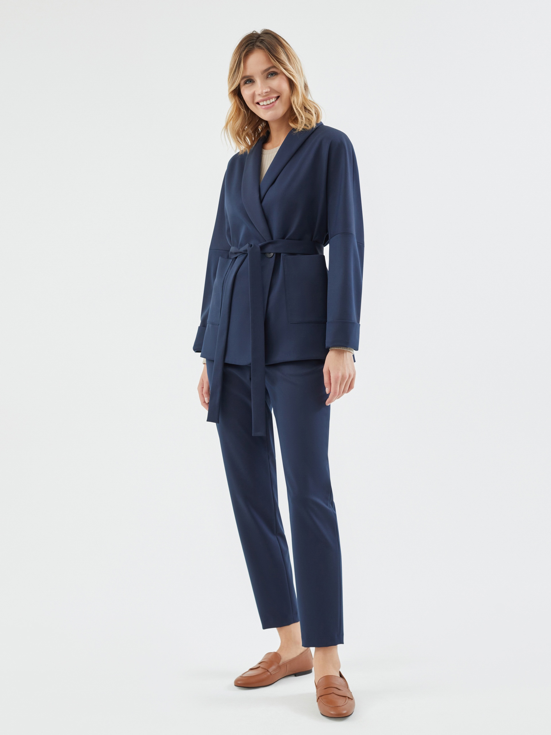 Жакет на подкладке из костюмной ткани прямого силуэта в черно-синем цвете. Модель имеет V-образный вырез, воротник-шаль и рукав кимоно. Спереди два крупных накладных кармана и застежка на пуговицу. В комплект входит пояс из основной ткани для создания более приталенного силуэта.