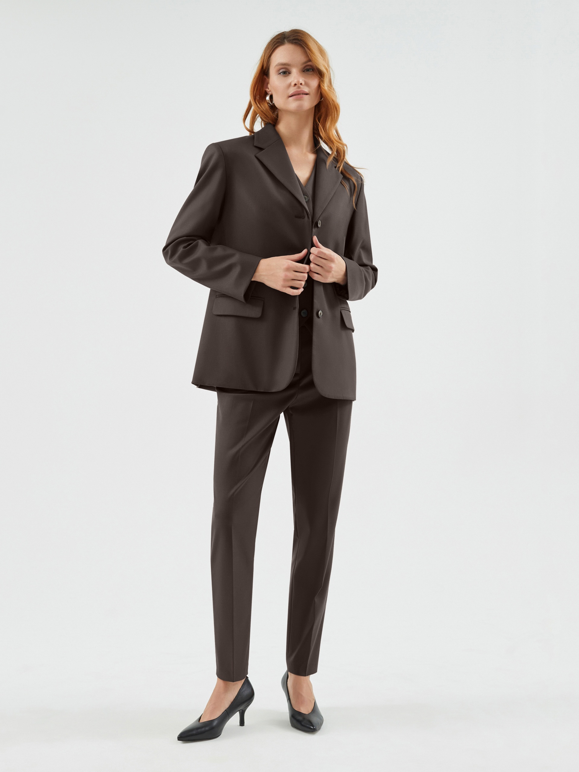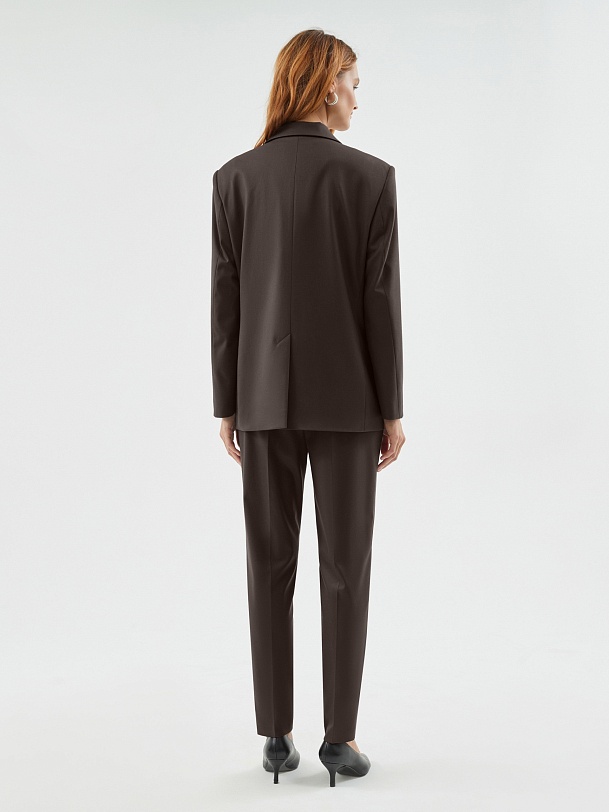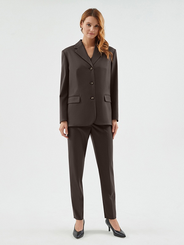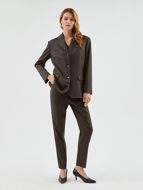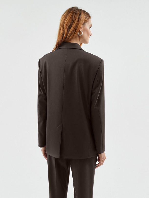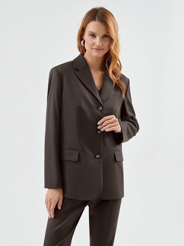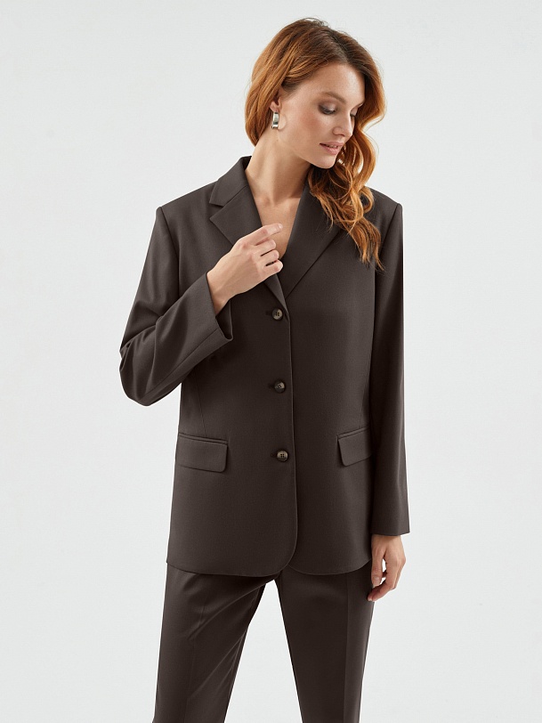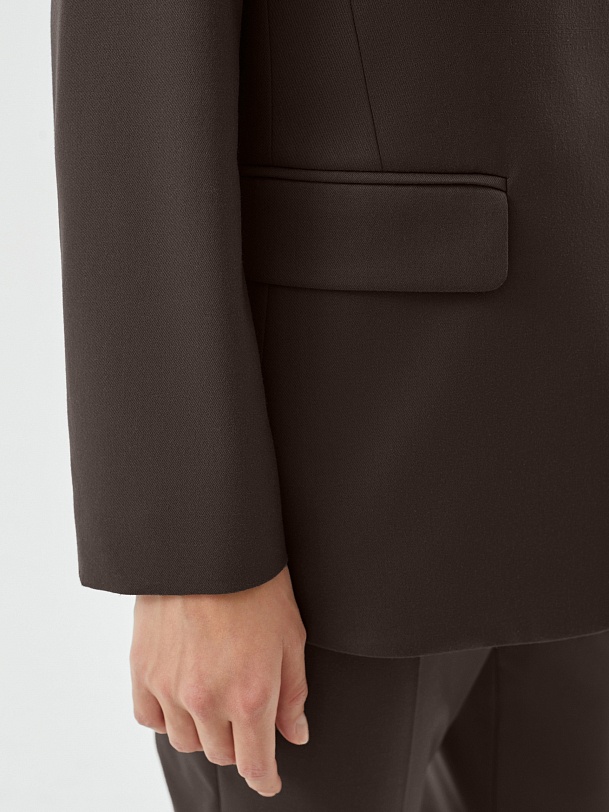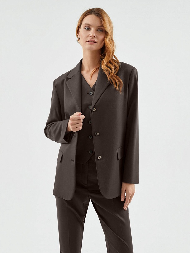 Однобортный жакет полуприталенного силуэта с акцентной линией плеча из костюмной вискозной ткани в благородном шоколадном цвете. Жакет на трех пуговицах с небольшим английским воротником и карманами с клапанами. Жакет составит идеальный комплект с брюками и жилетом из одной ткани.