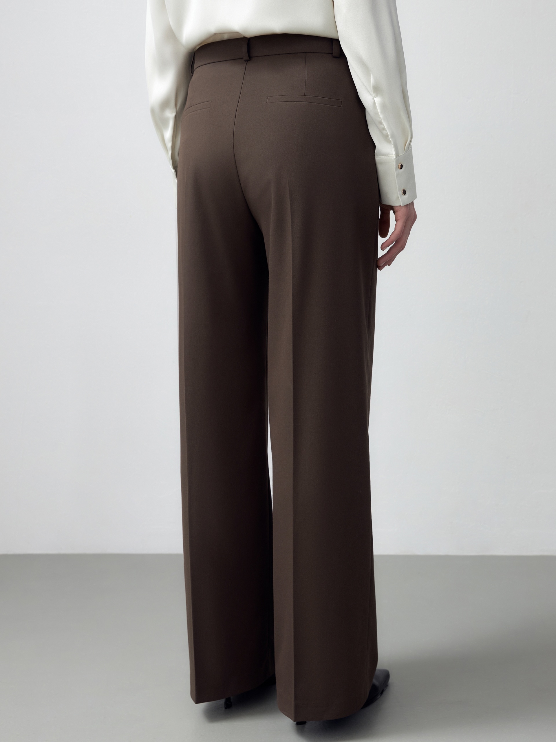 Прямые брюки на средней посадке из костюмной ткани в шоколадном цвете. Брюки со стрелками на притачном поясе со шлевками и рабочими карманами по бокам. Застежка спереди на молнию и крючок. Сзади прорезные карманы с листочками.
