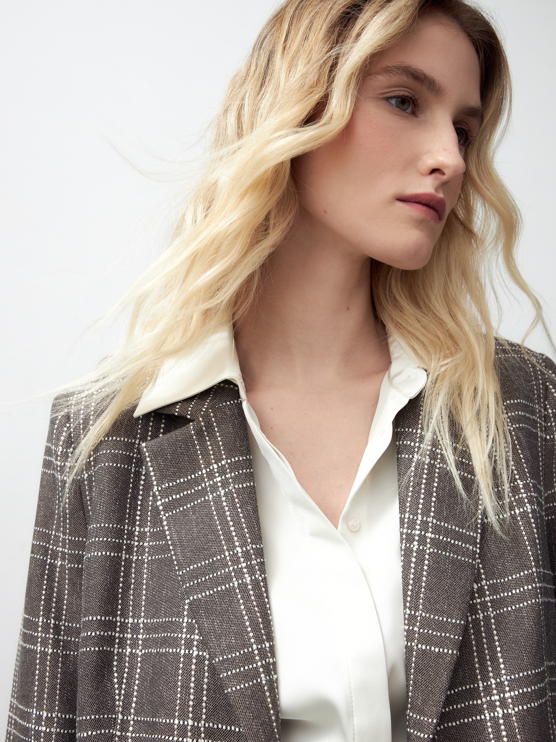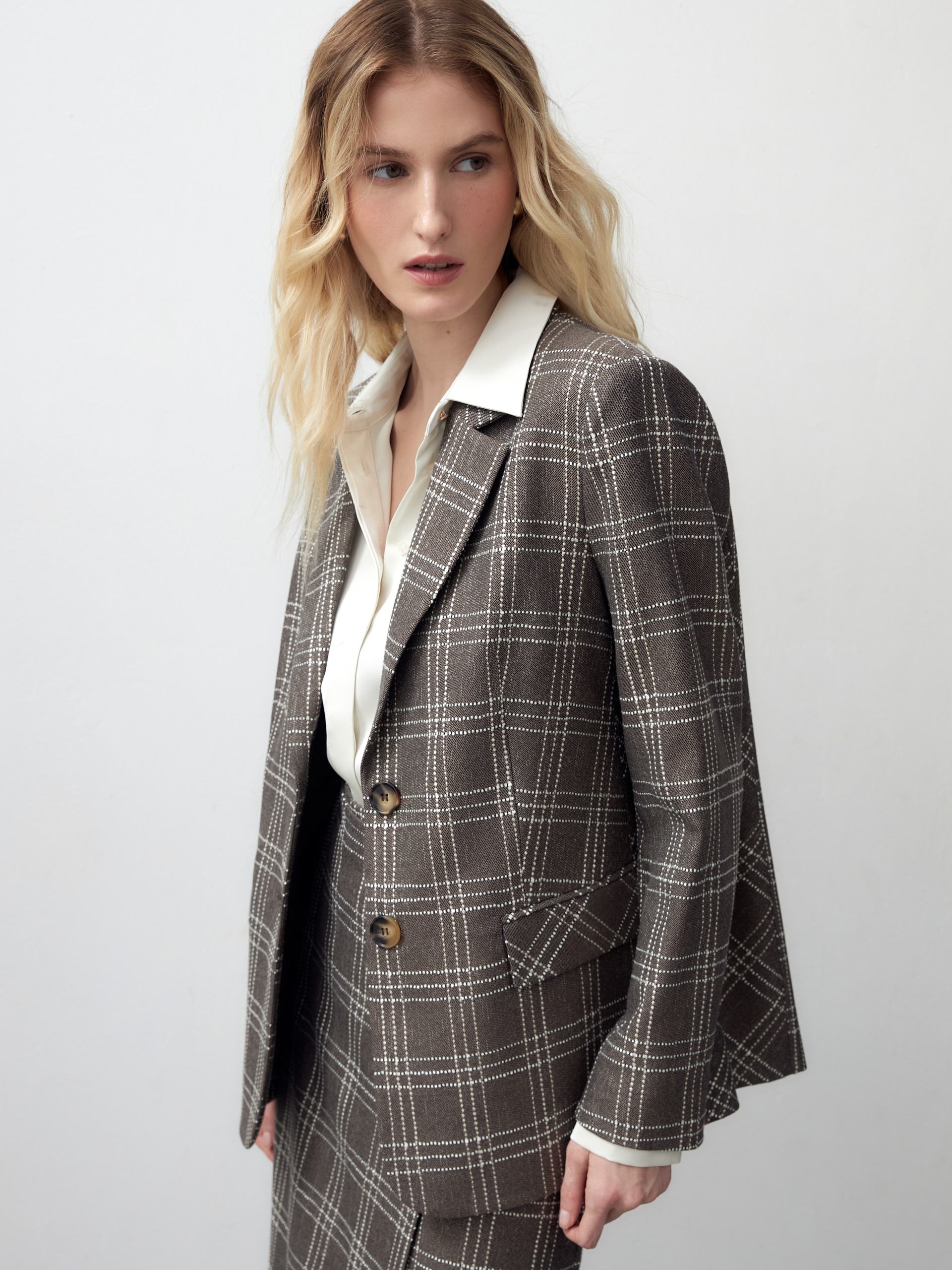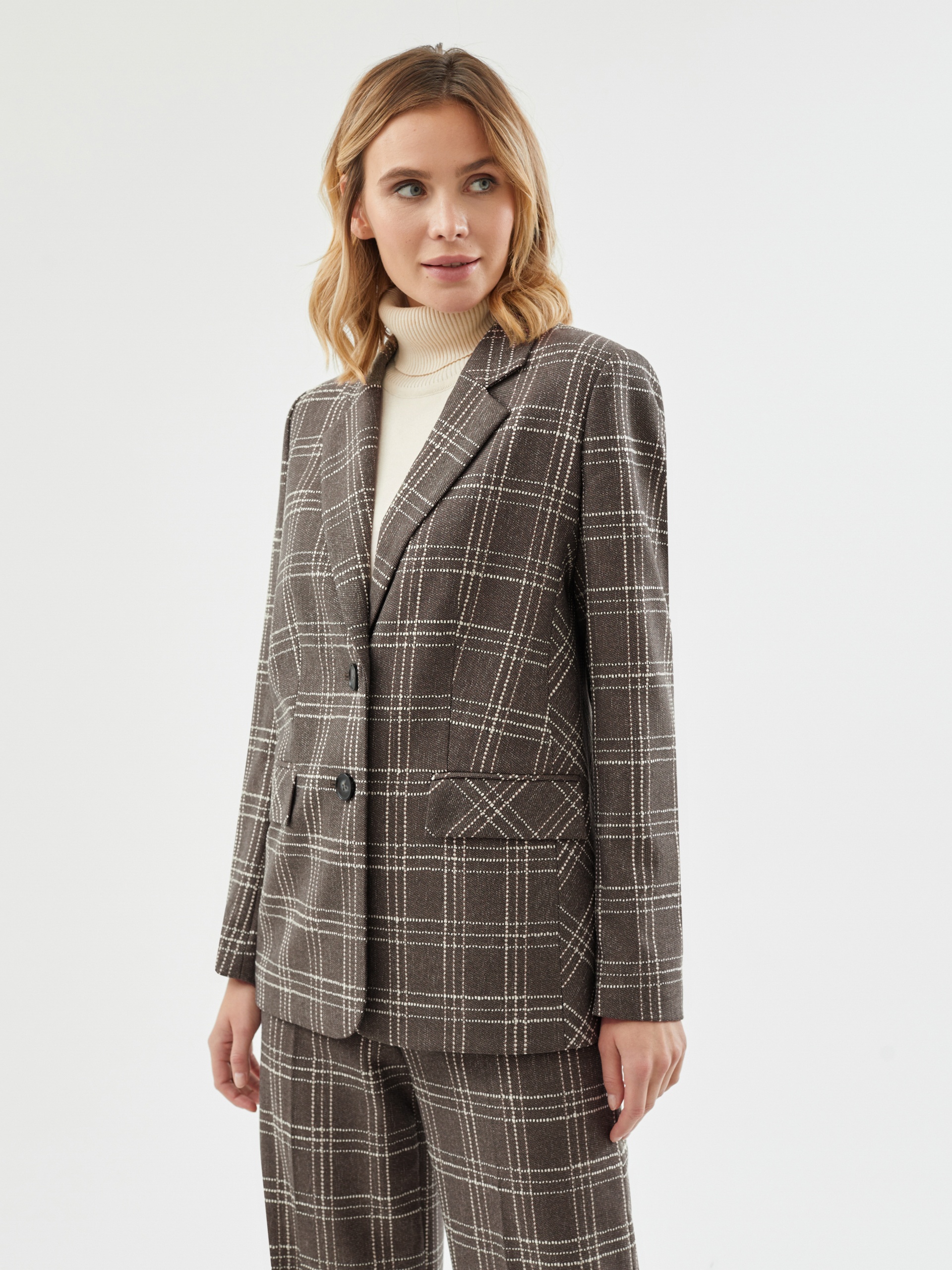 Классический прямой однобортный жакет из фактурной ткани в клетку на двух пуговицах. Жакет полностью на подкладке с прорезными карманами и клапанами.