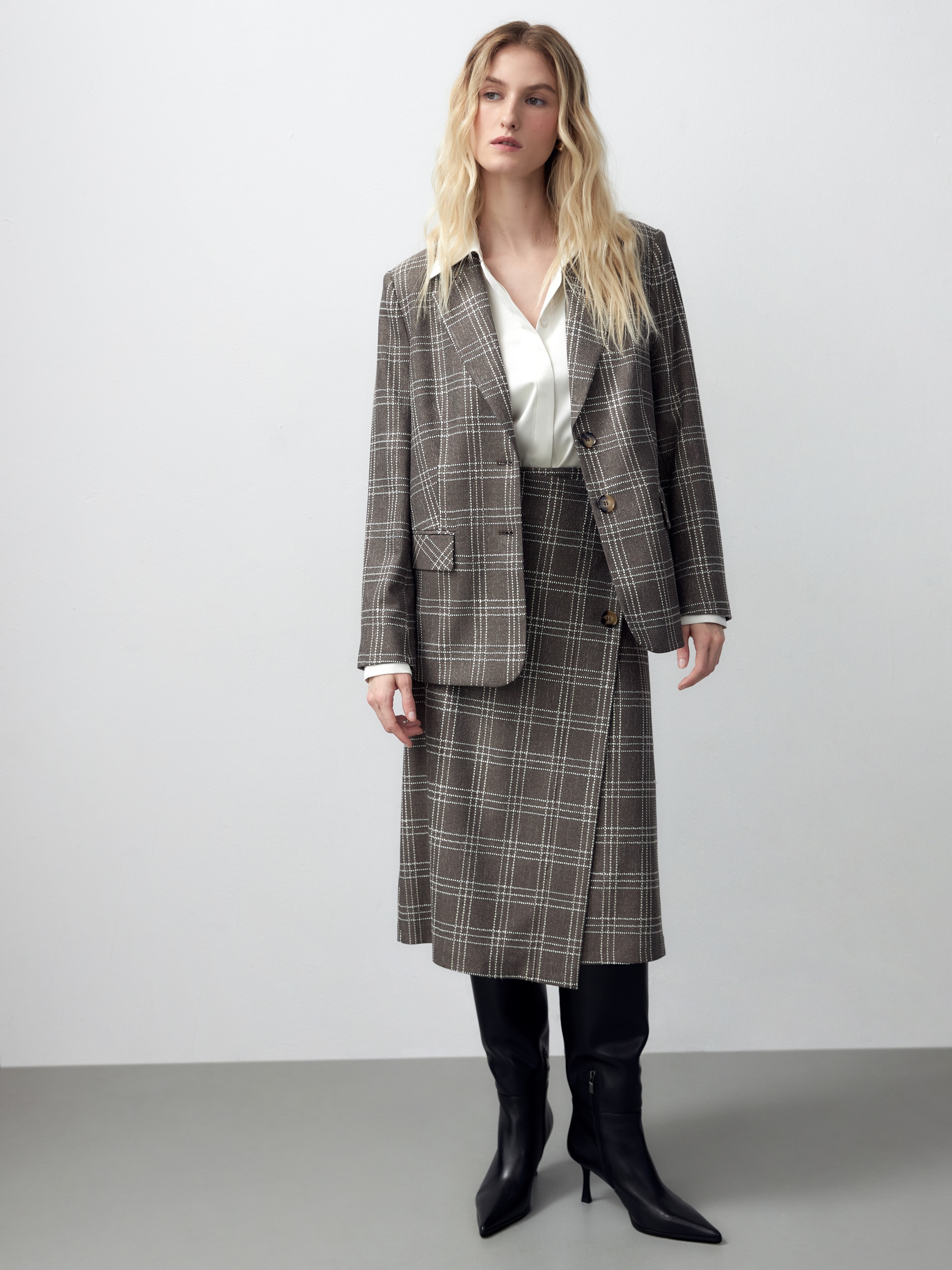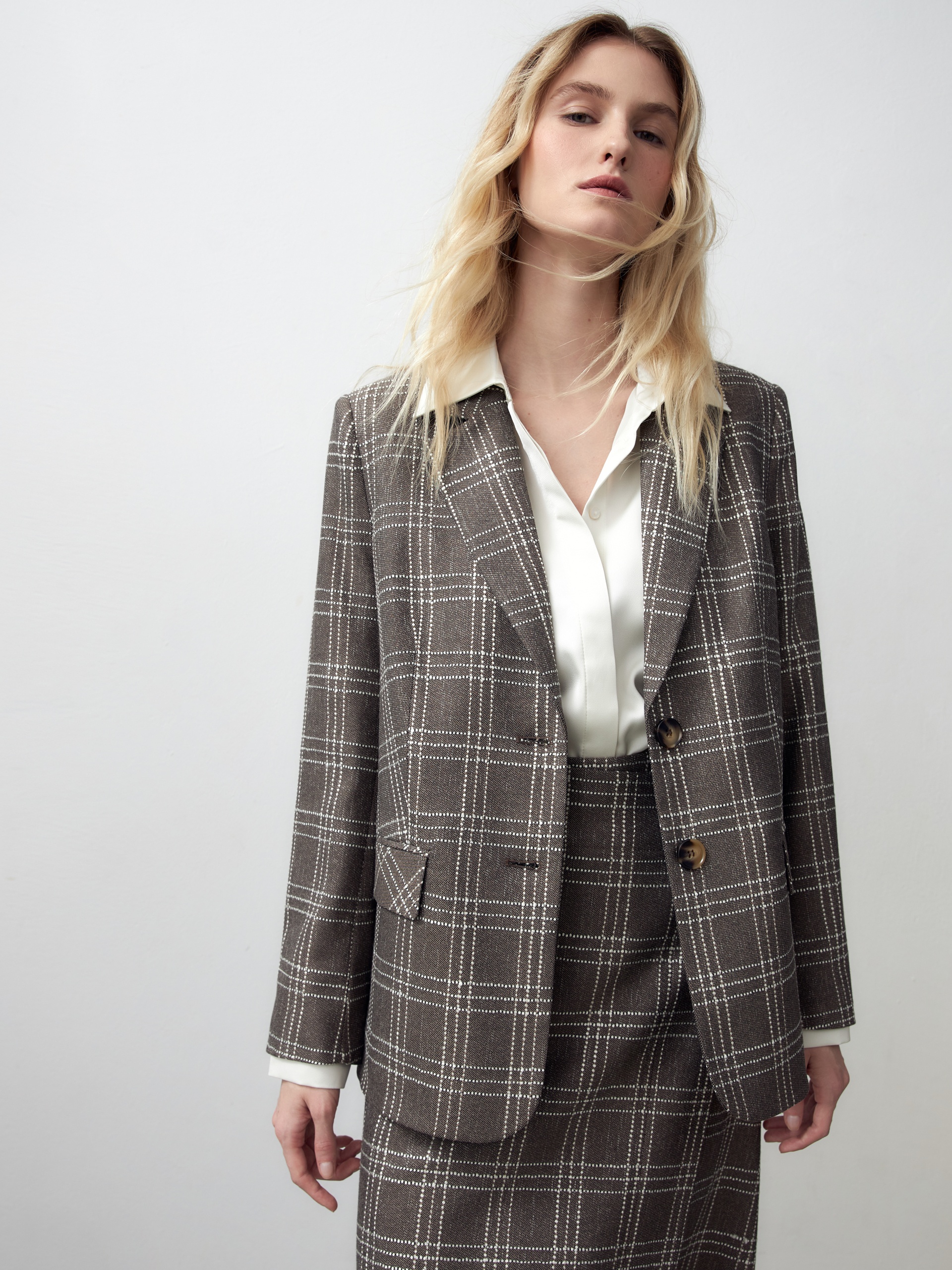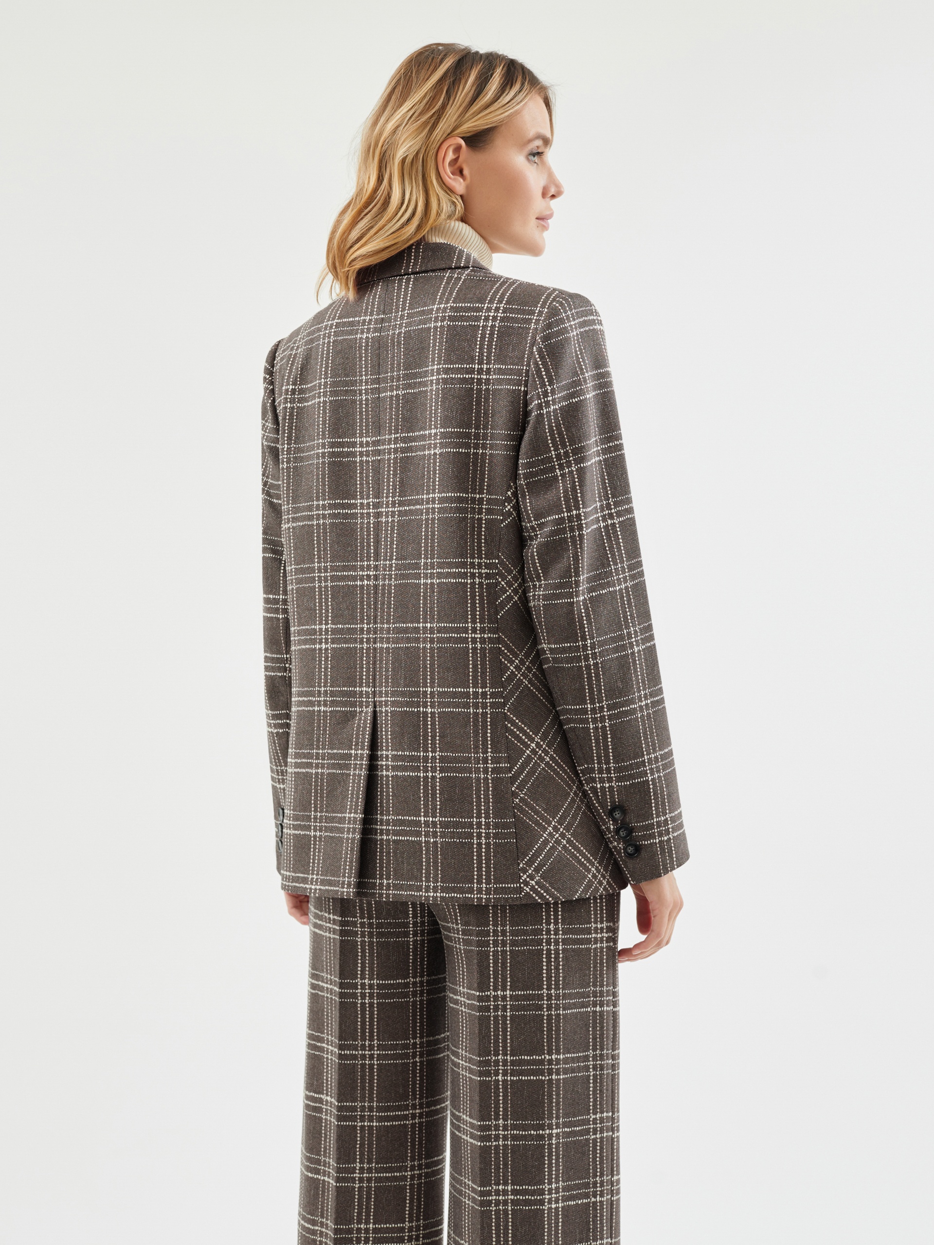 Классический прямой однобортный жакет из фактурной ткани в клетку на двух пуговицах. Жакет полностью на подкладке с прорезными карманами и клапанами.