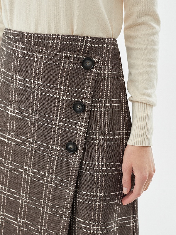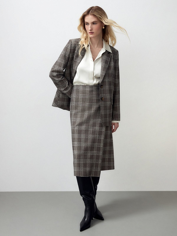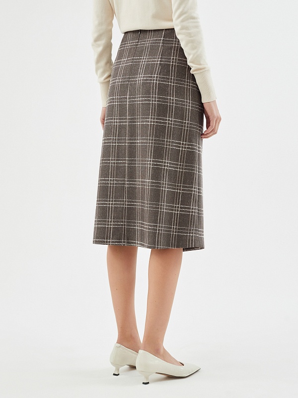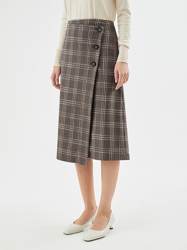 Юбка в клетку из фактурной костюмной ткани в клетку прямого силуэта без подкладки. Спереди декоративная имитация запаха на три пуговицы, потайная молния в боковом шве. Эта модель будет идеально сочетаться с трикотажными топами.