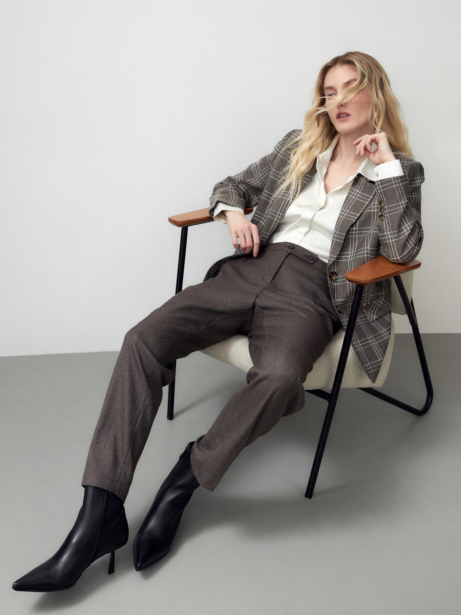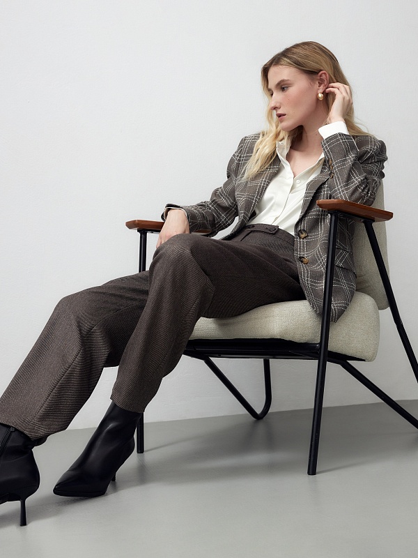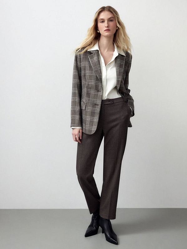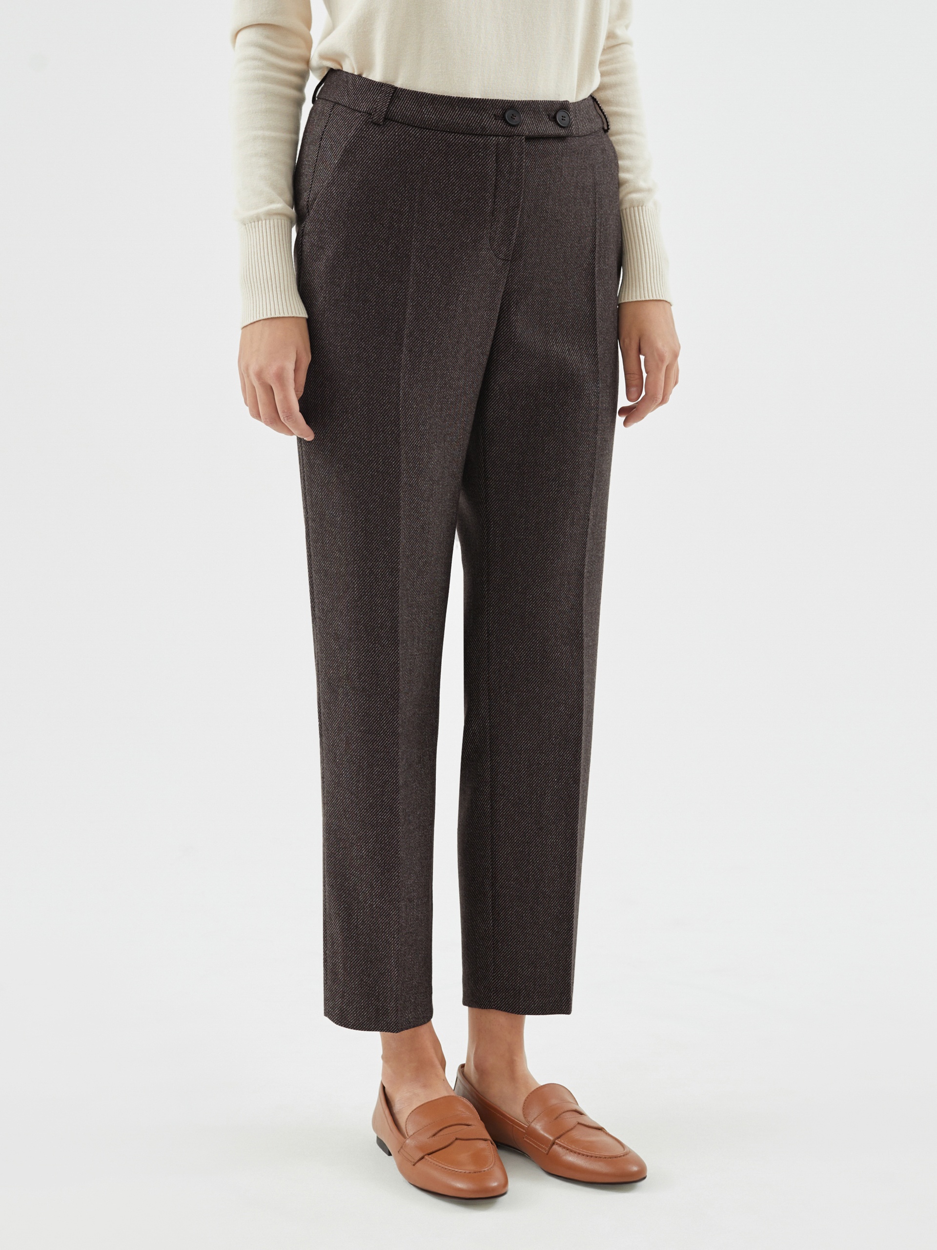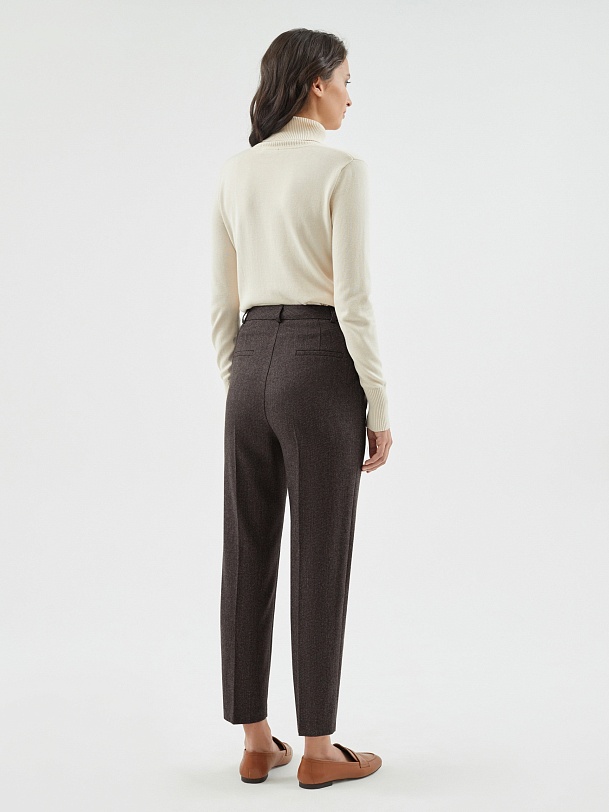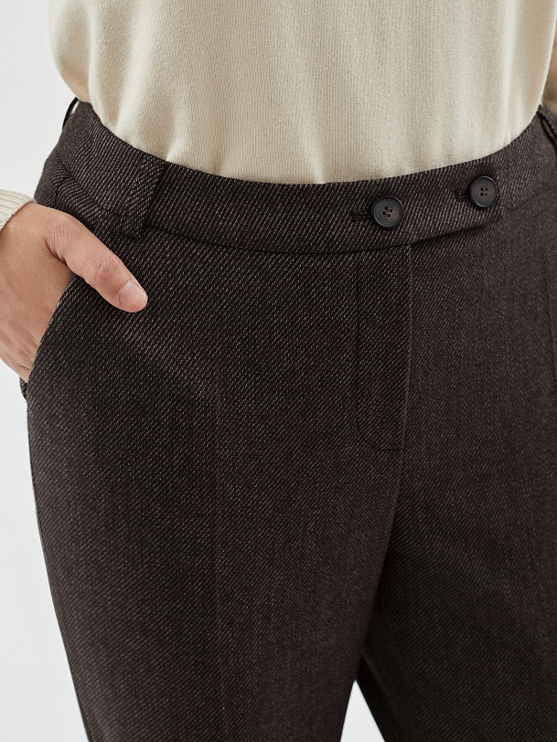 Брюки длины 7/8 полуприлегающего силуэта из костюмной ткани на притачном поясе с застежкой на две пуговицы. Модель имеет два функциональных кармана по бокам и два прорезных кармана на задней части брюк.