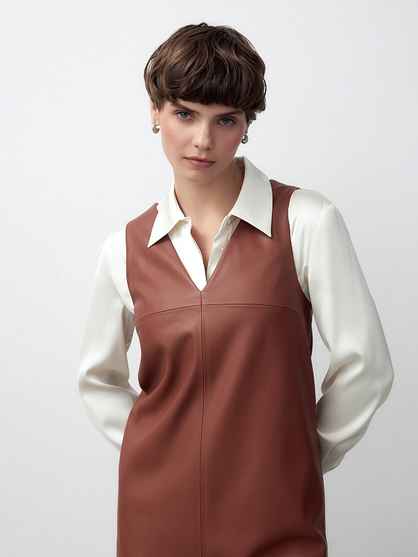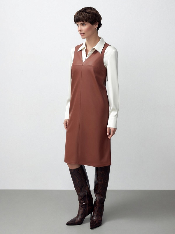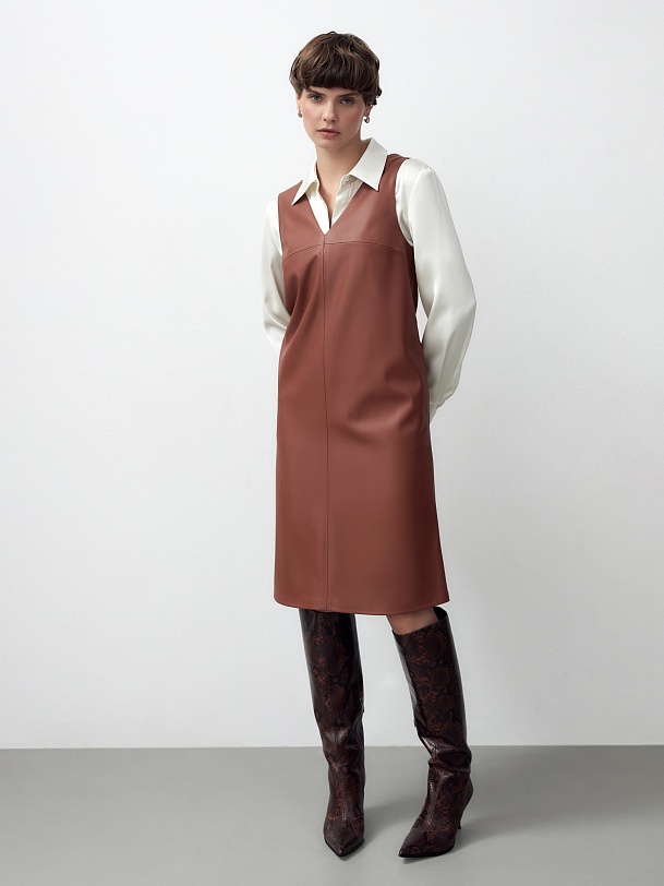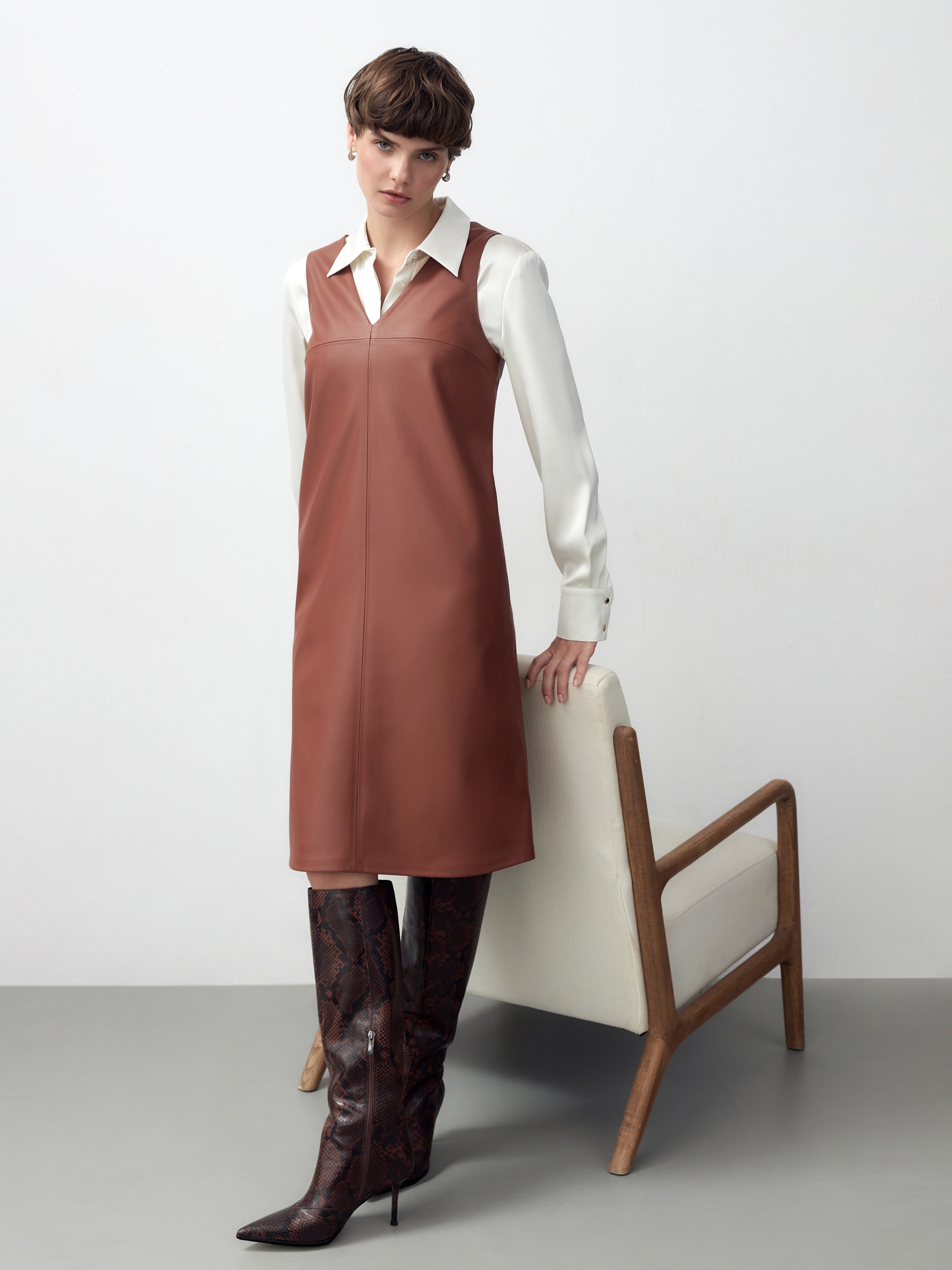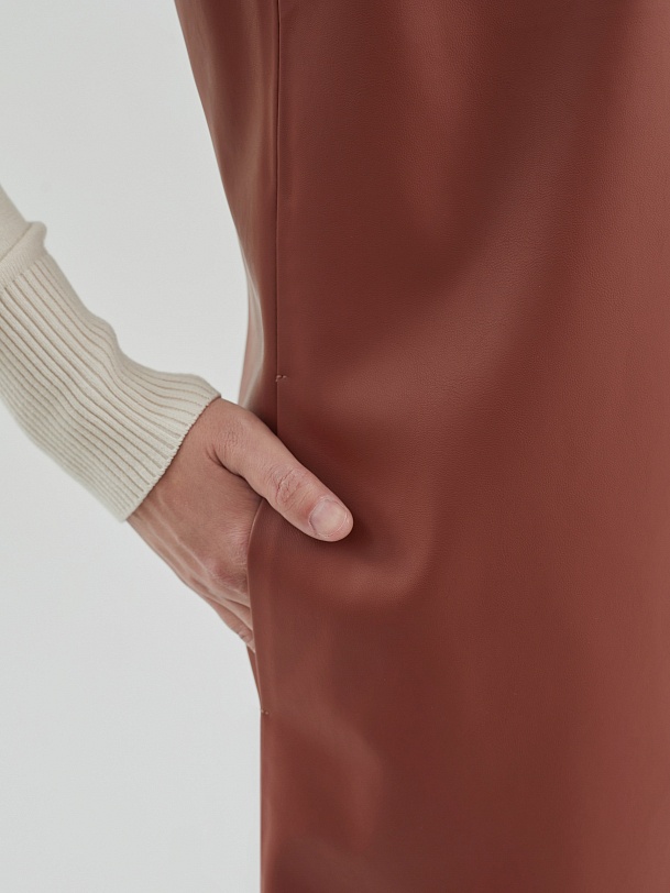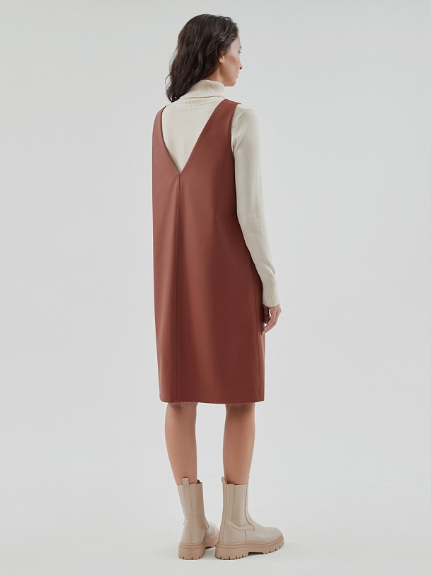 Платье мини из экокожи в благородном терракотовом цвете с глубоким V-образным вырезом спереди и сзади, не плотно прилегает к телу, поэтому его можно легко носить с тонкими джемперми и блузами. Платье на подкладке.
