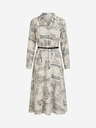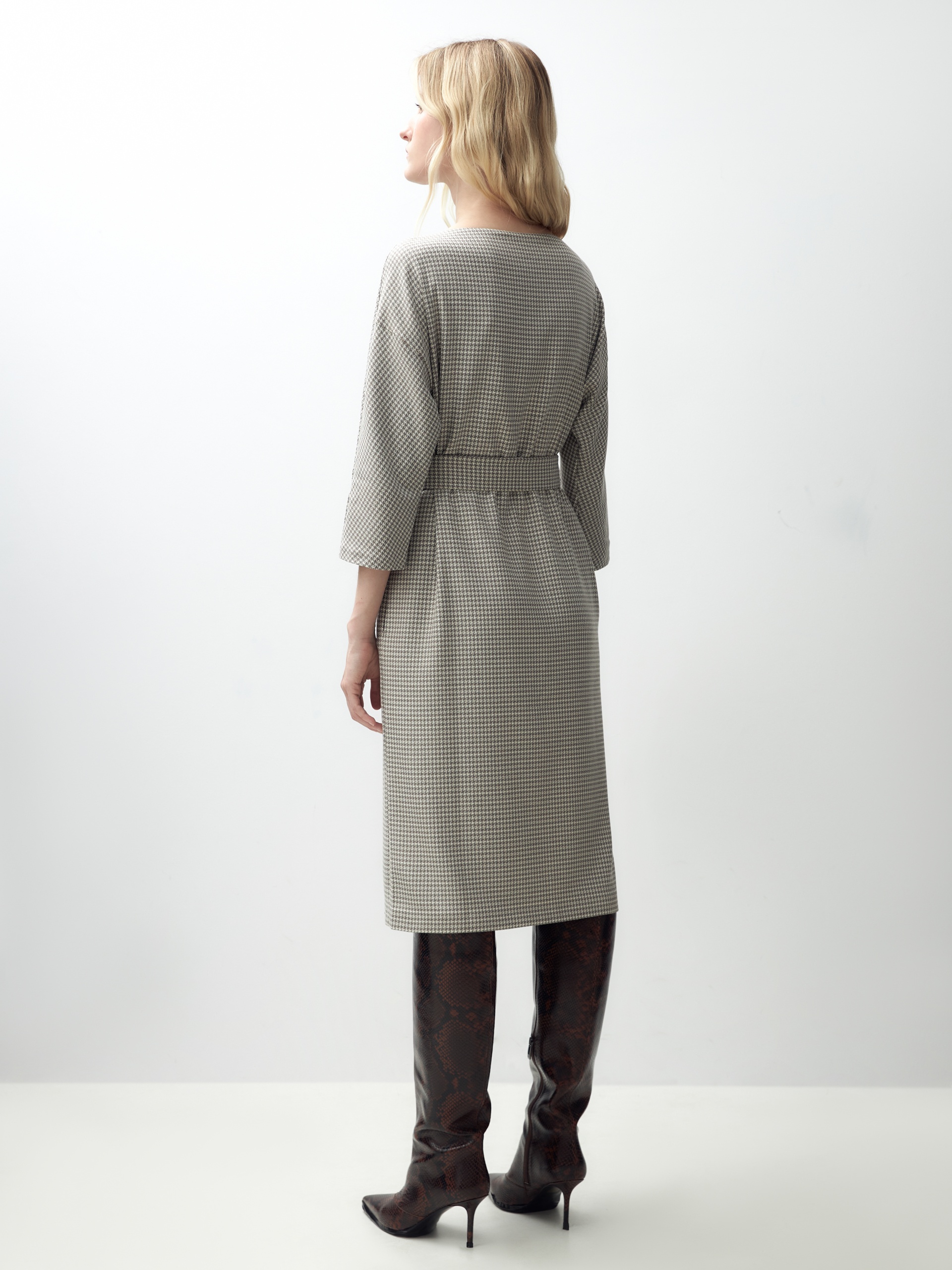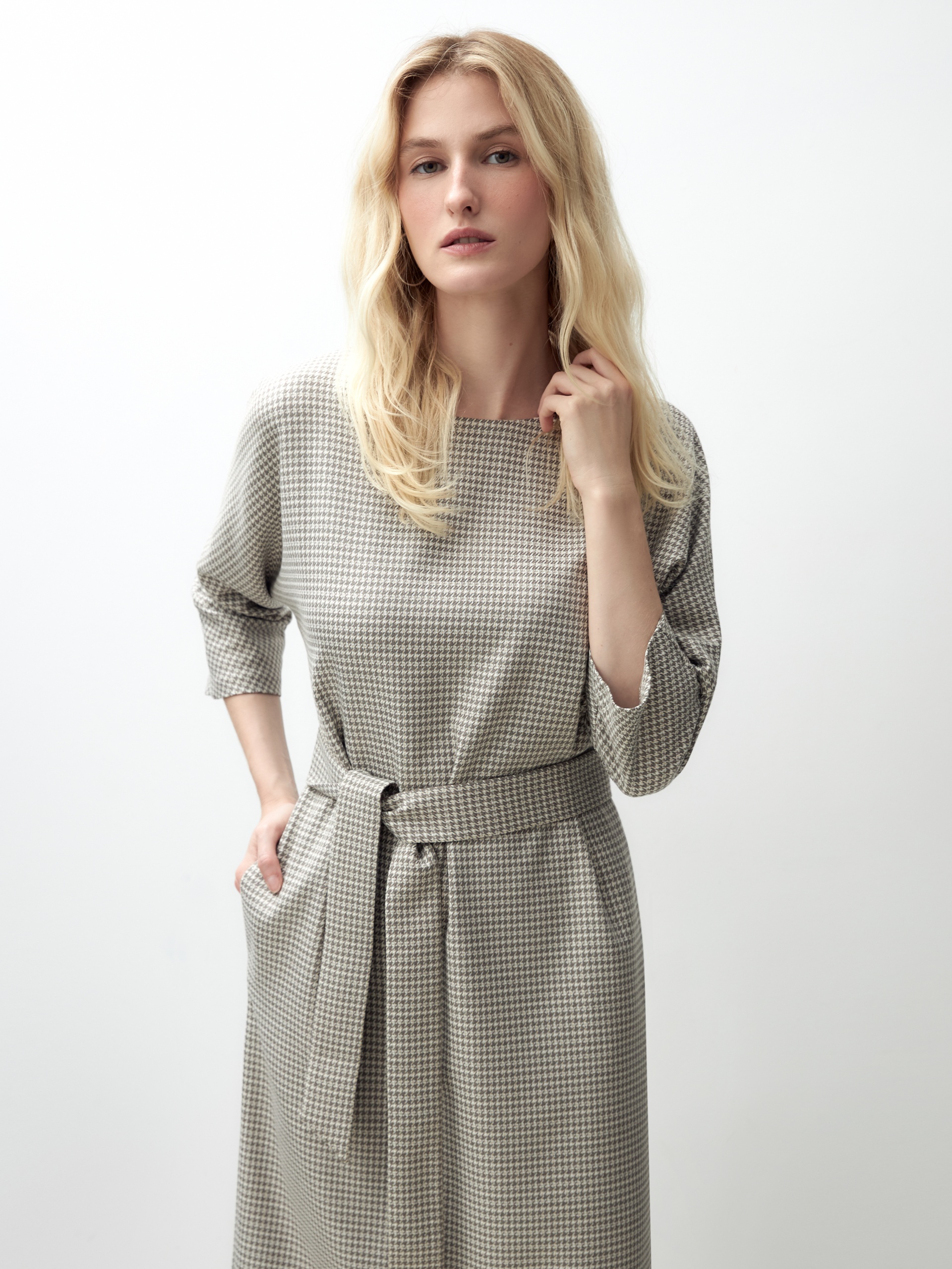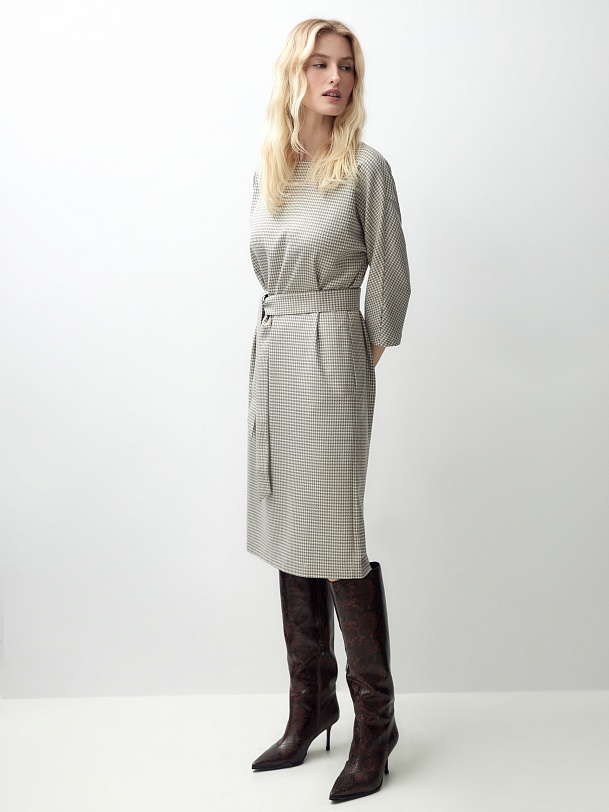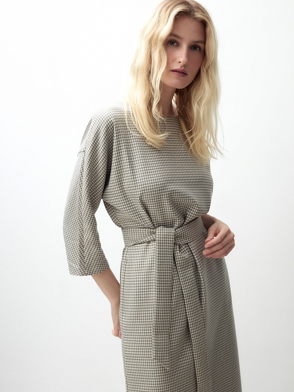 Платье прямого силуэта из костюмной ткани в принте пье-де-пуль, цельнокроеным рукавом 7/8 и потайными карманами в боковых швах. В комплект входит пояс из основной ткани для создания более женственного приталенного силуэта.