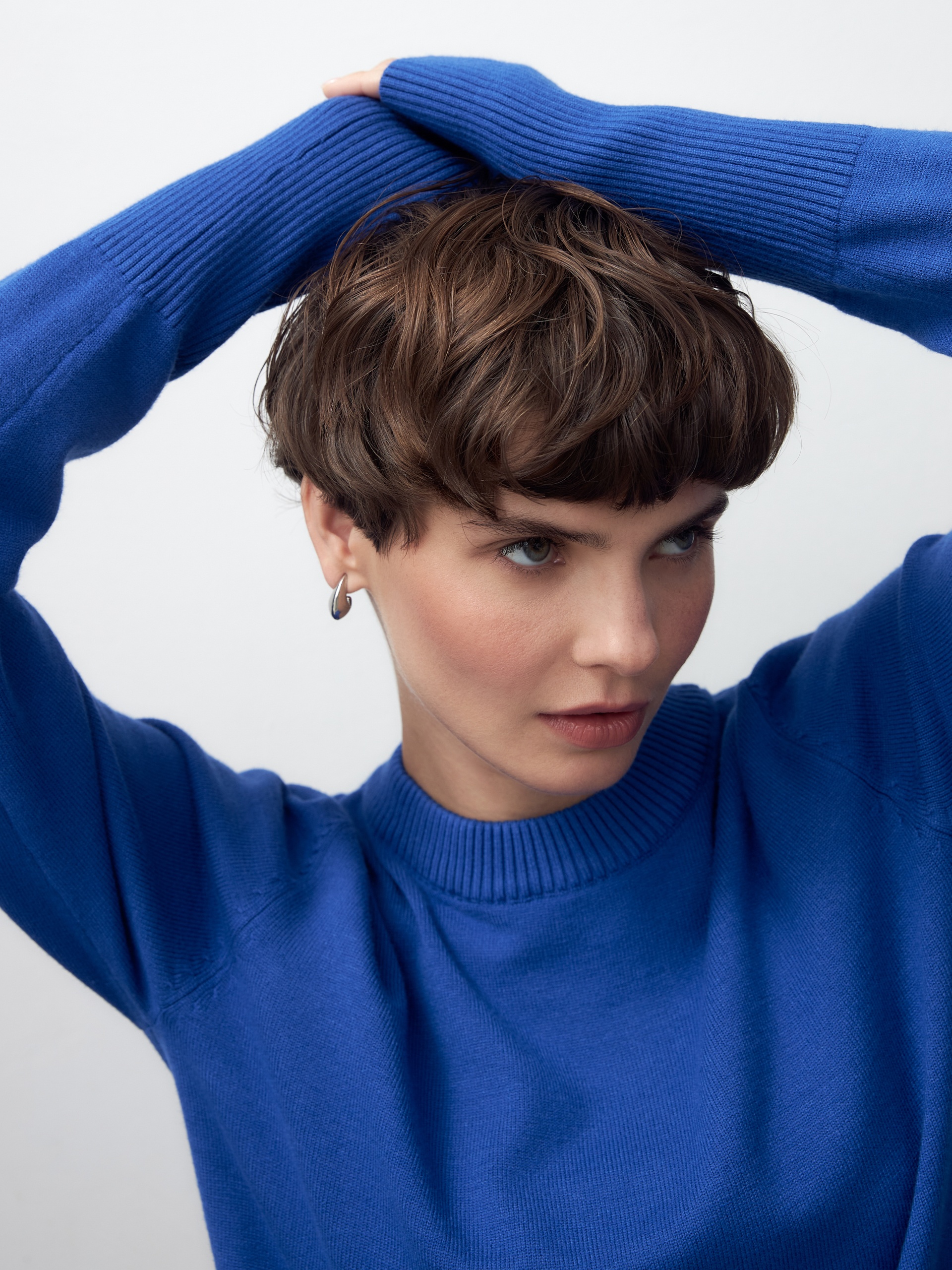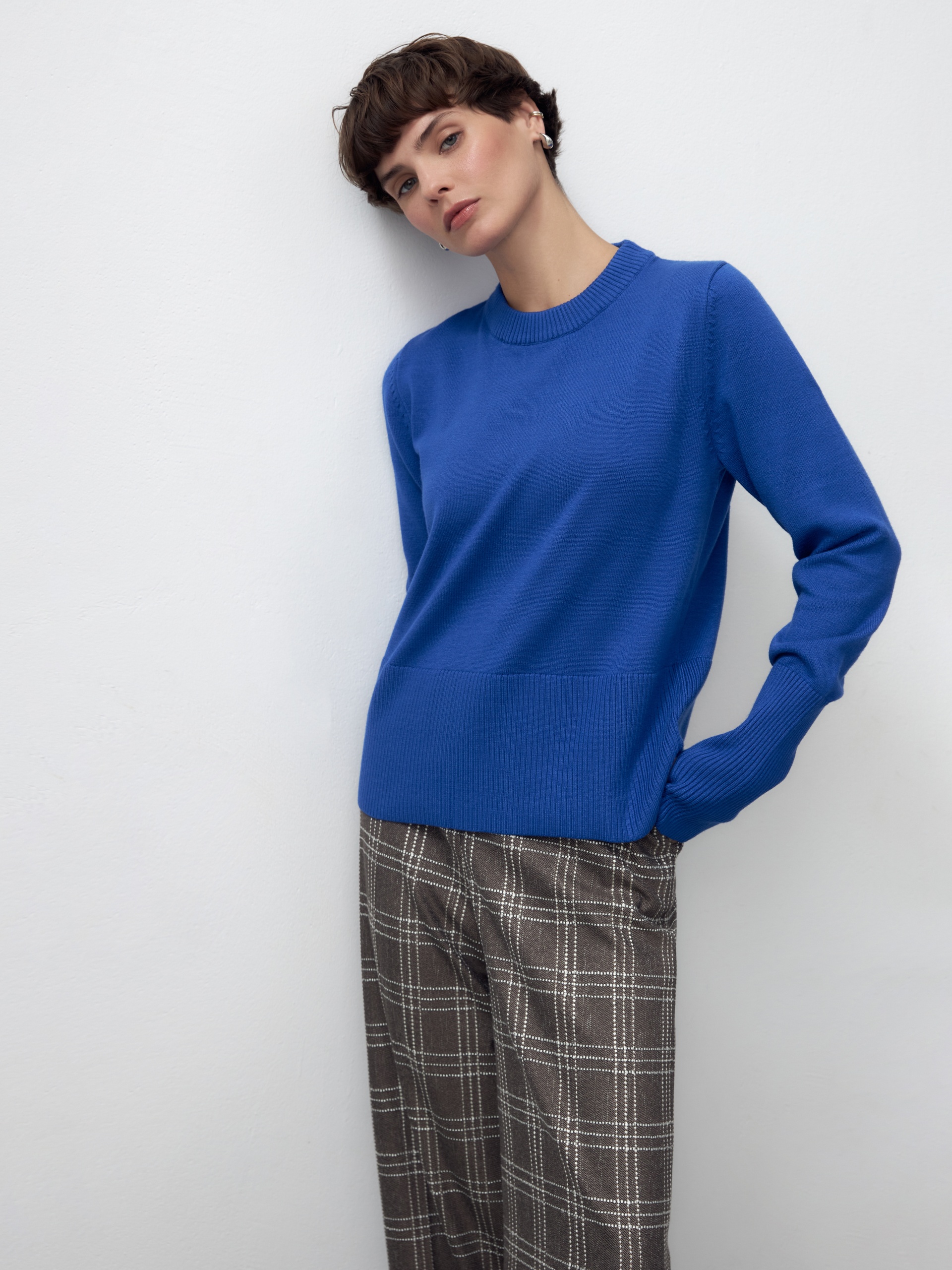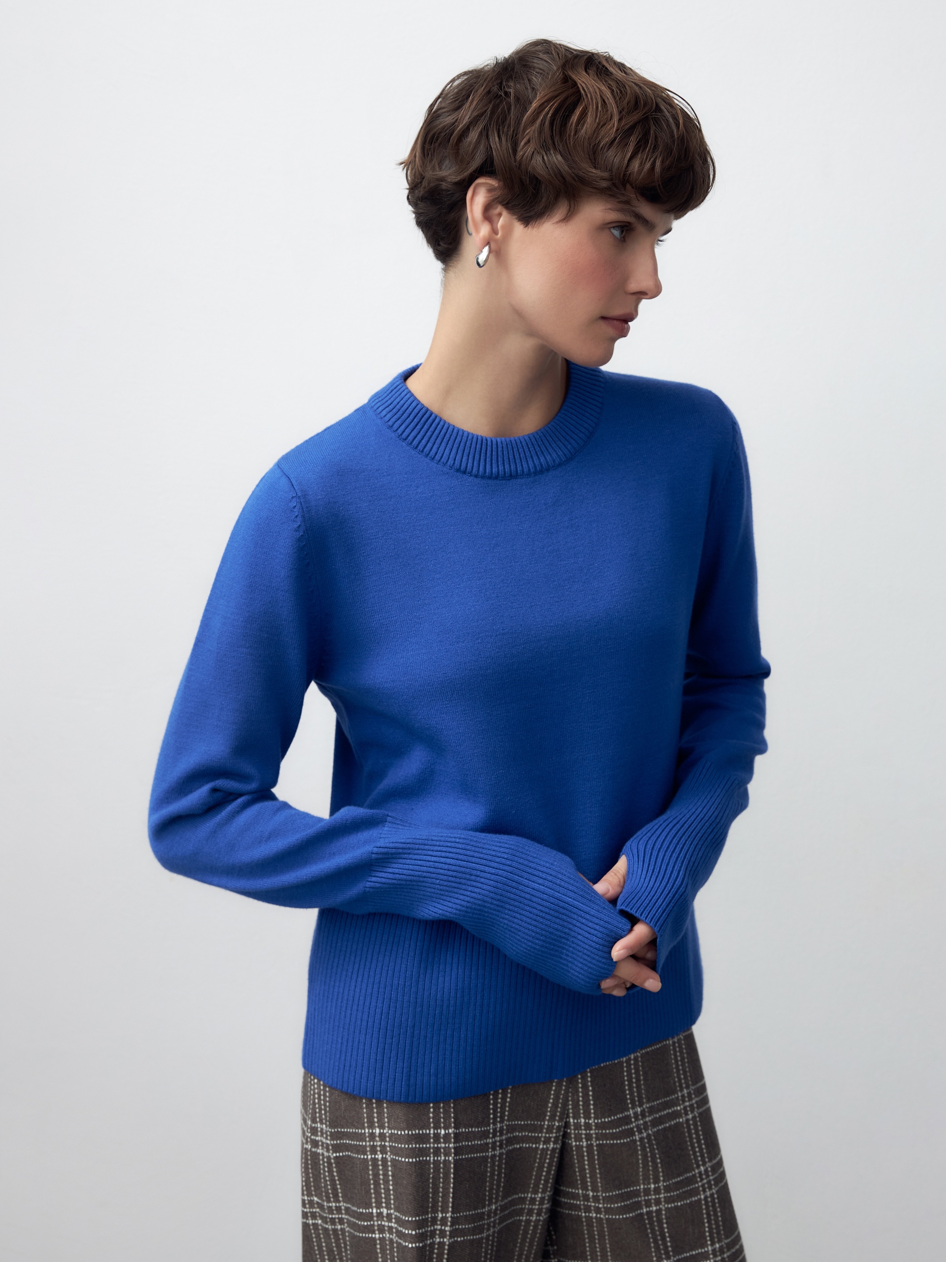 Базовый джемпер эффектного ярко-синего цвета придаст настроение игривости вашему повседневному образу, а такие милые детали, как разрезы на манжетах для большого пальца, согреют ваши кисти рук в этот прохладный период....