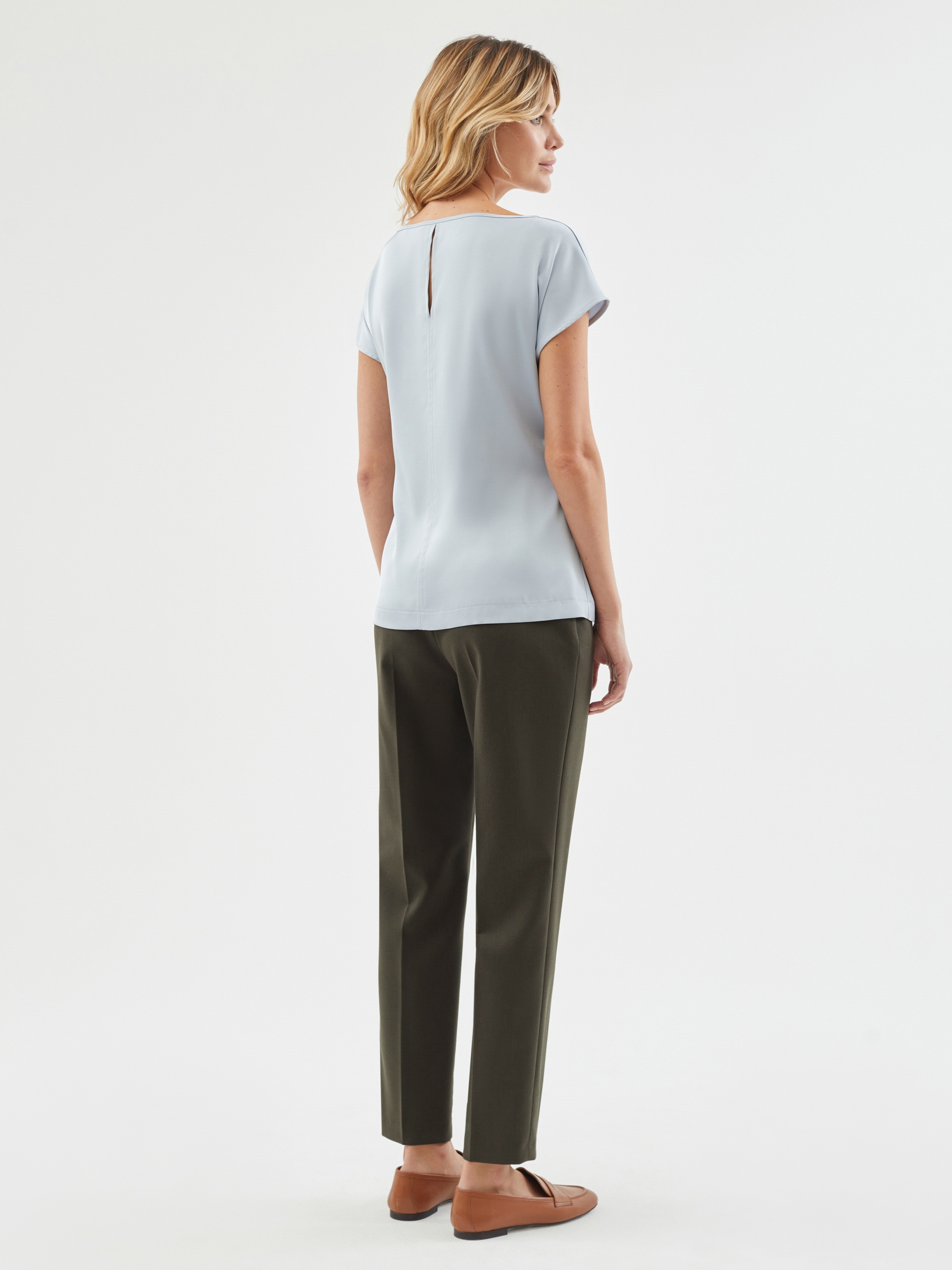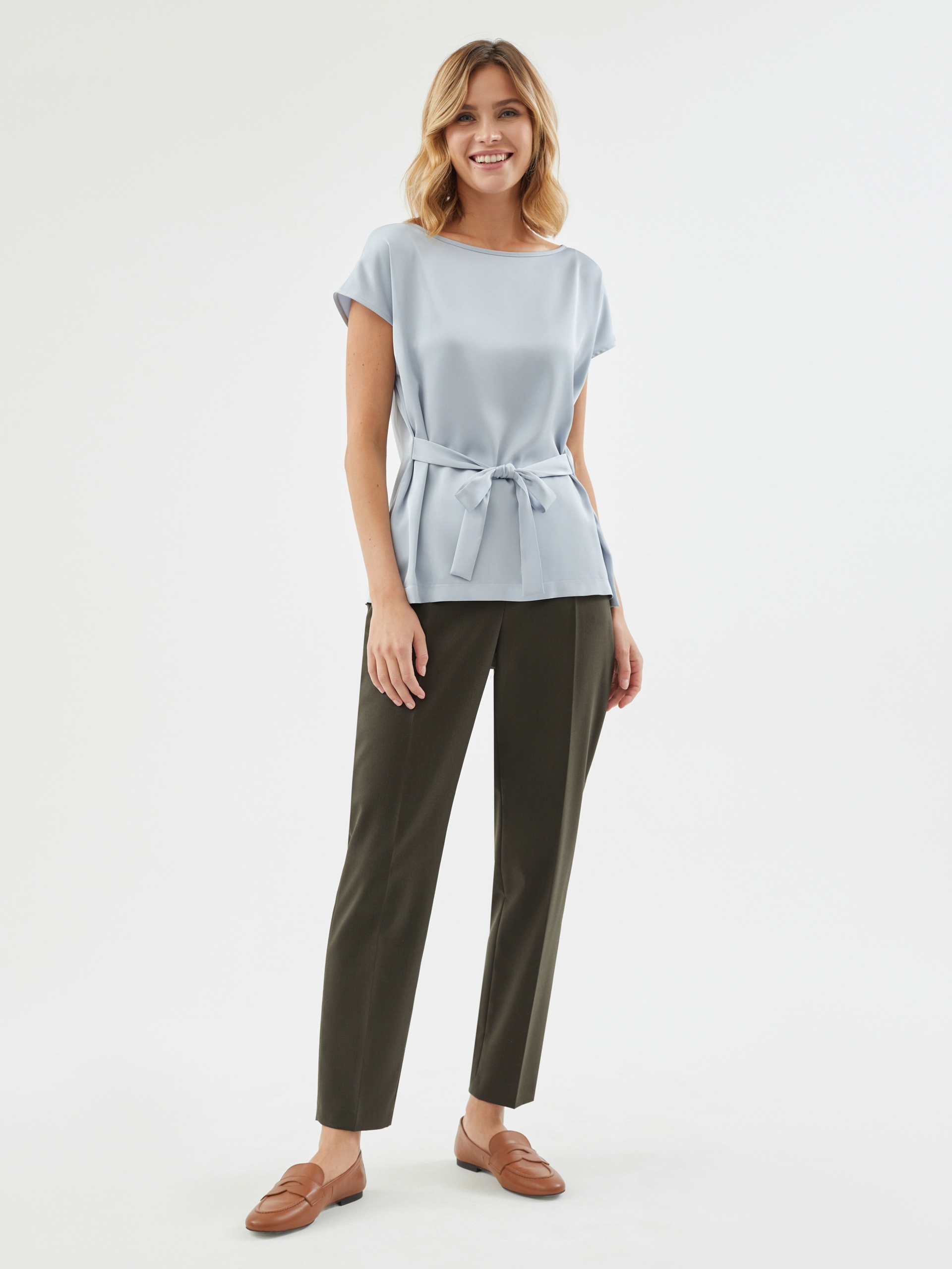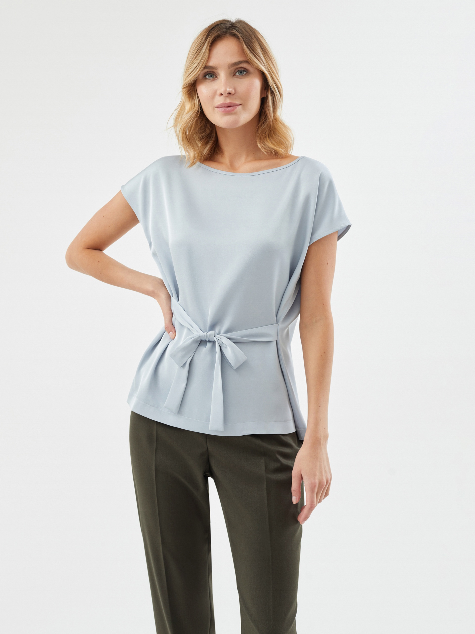 Свободная блуза из блузочной ткани в светло-голубом цвете, вырез горловины лодочка, на спине капля с пуговицей. Спущенное плечо с рукавом-кимоно. В боковых швах пояс из основной ткани для создания приталенного силуэта. Блуза идеально сочетается с брюками и юбками.