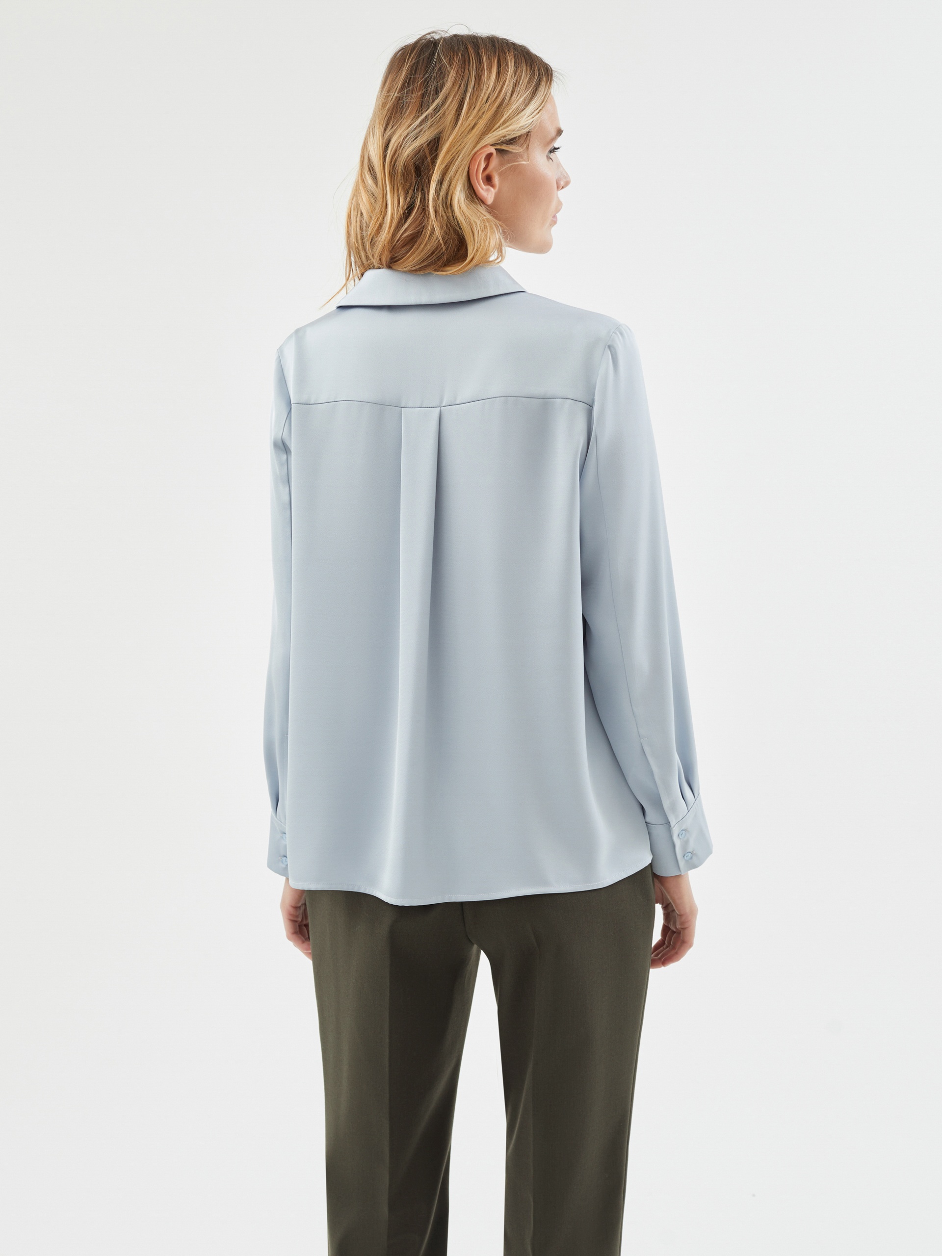 Свободная блуза в светло-голубом цвете с отложным воротником и V-образным вырезом и складкой по полочке. Классический втачной рукав на манжете. Блуза идеально сочетается с брюками и юбками, а также станет хорошей базой под жакет.
