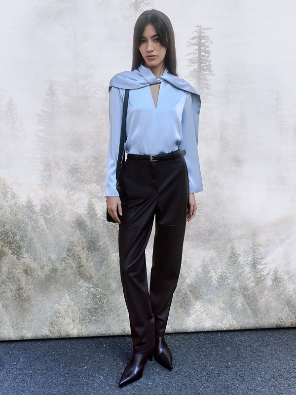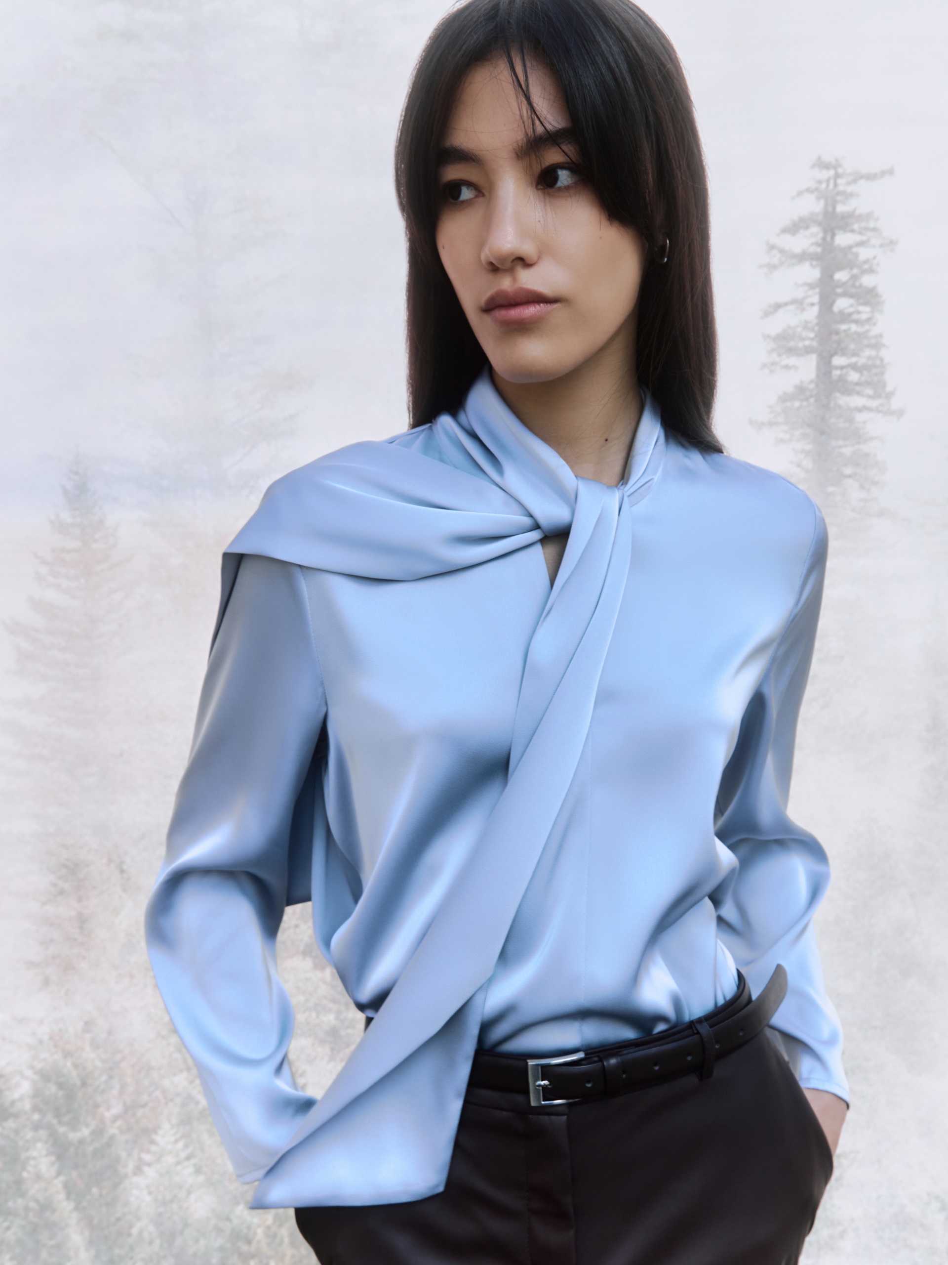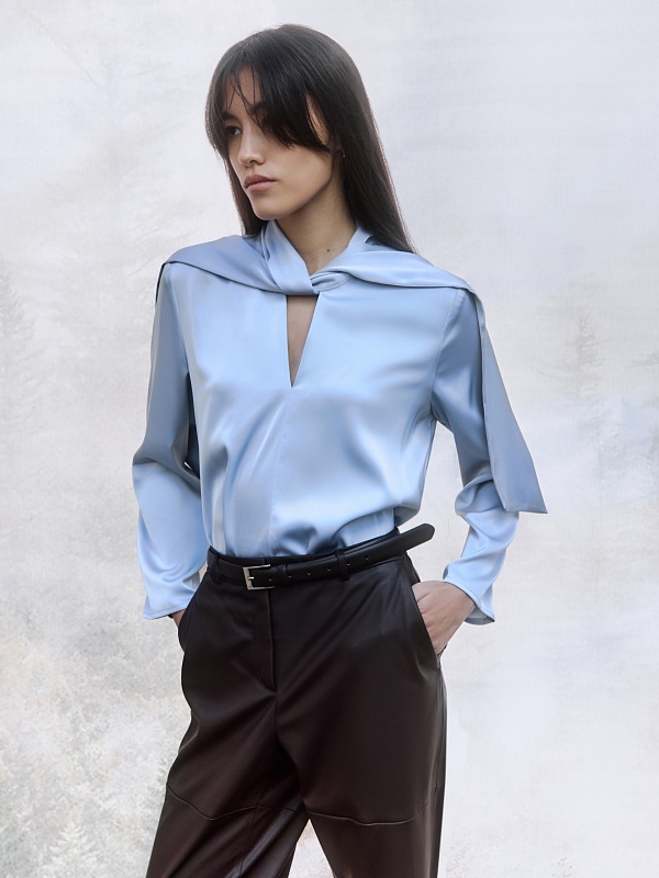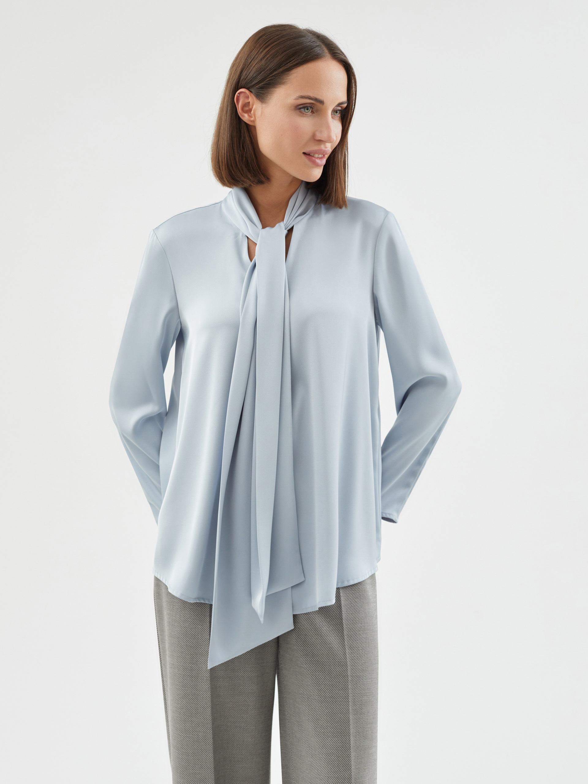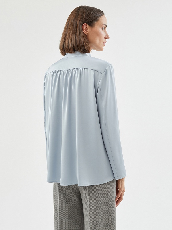 Романтичная прямая блуза в светло-голубом цвете с воротником-стойкой, переходящим в завязки для формирования банта или галстука. Классический втачной рукав прямой формы. На спинке кокетка со сборкой. Блуза идеально сочетается с брюками и юбками, а также станет хорошей базой под жакет.