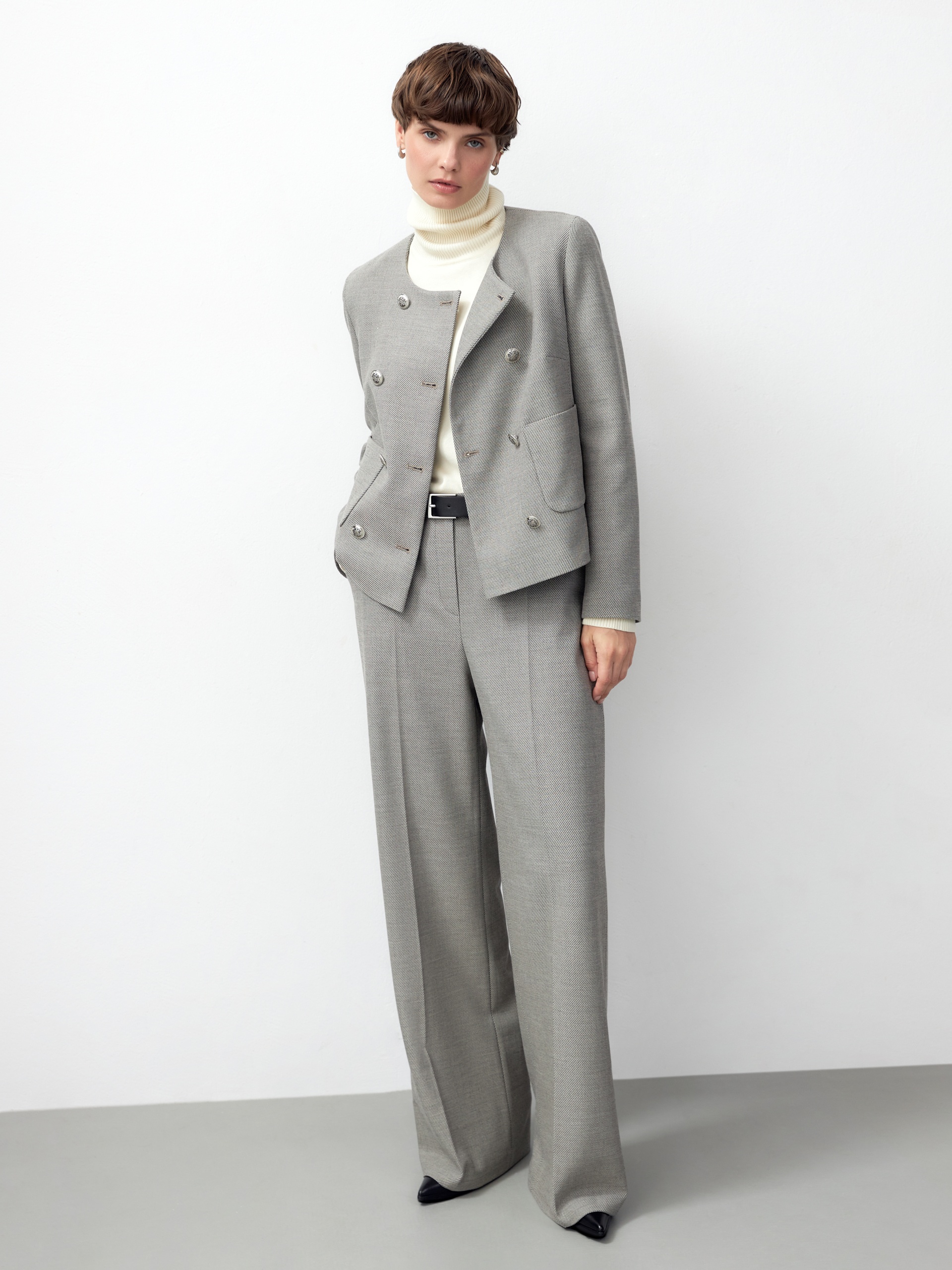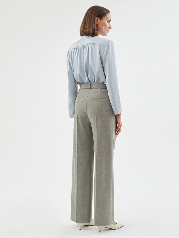 Прямые брюки свободного силуэта из фактурной костюмной ткани с добавлением вискозы. Имеют два функциональных кармана по бокам и два прорезных кармана сзади. Брюки идеально сочетаются с жакетом из одного цветового блока.