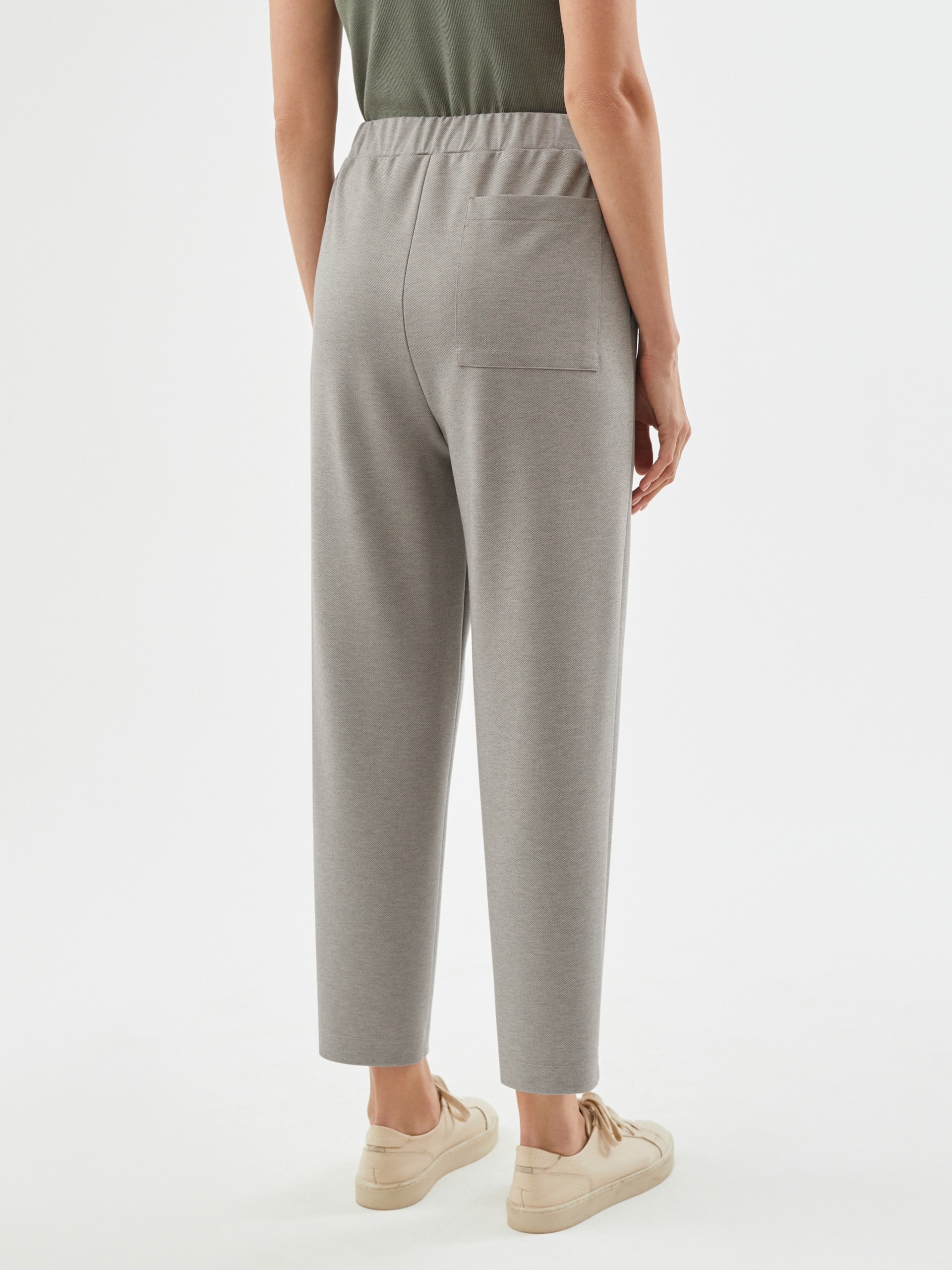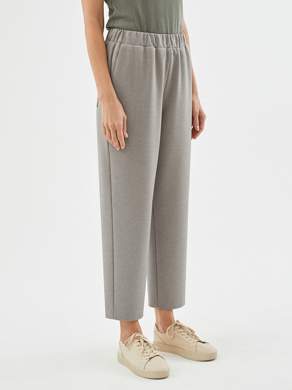 Брюки на мягком поясе, из приятного к телу трикотажа, зауженные к низу, будут органично смотреться и с классической обувью, и со спортивной.