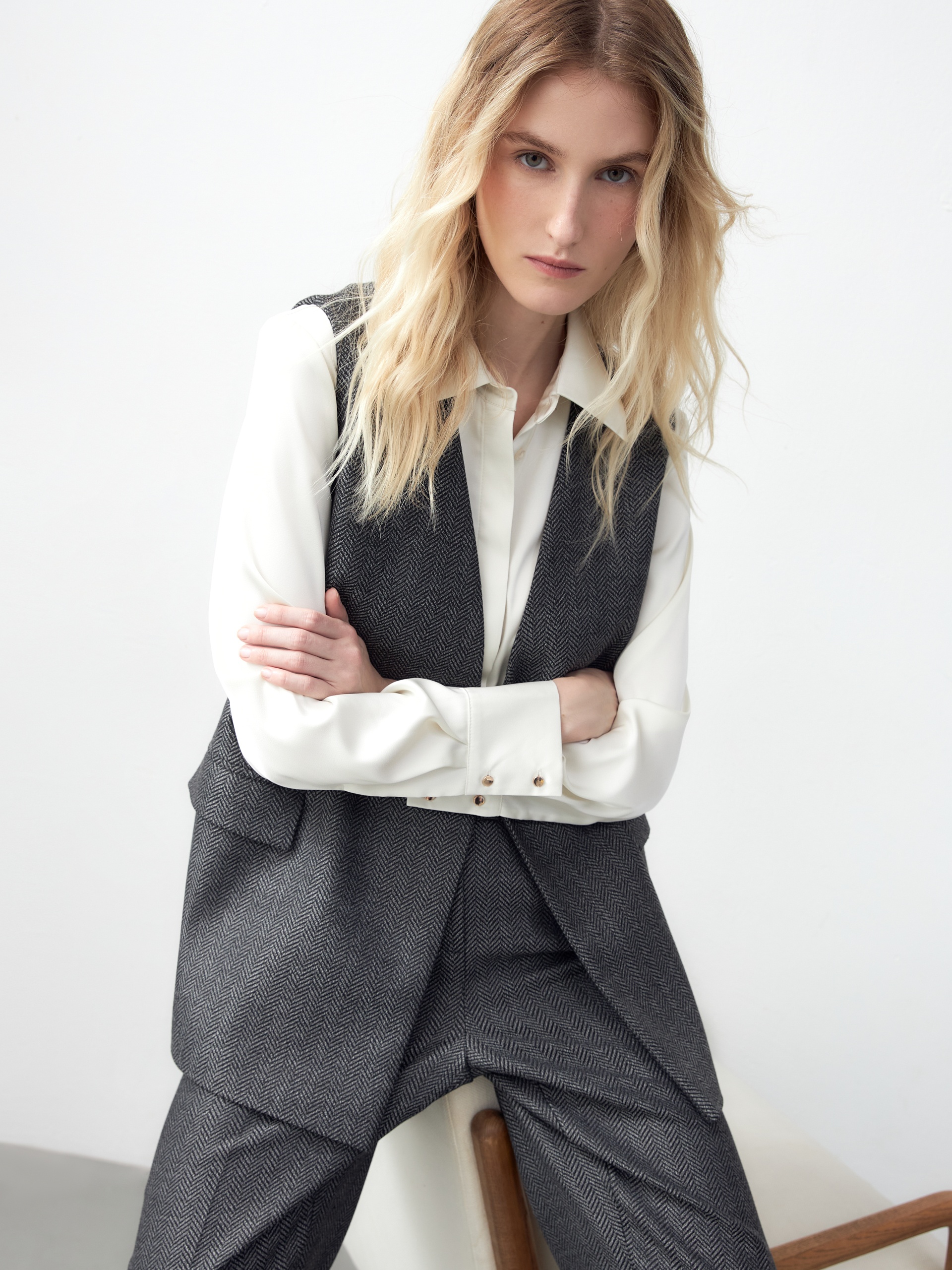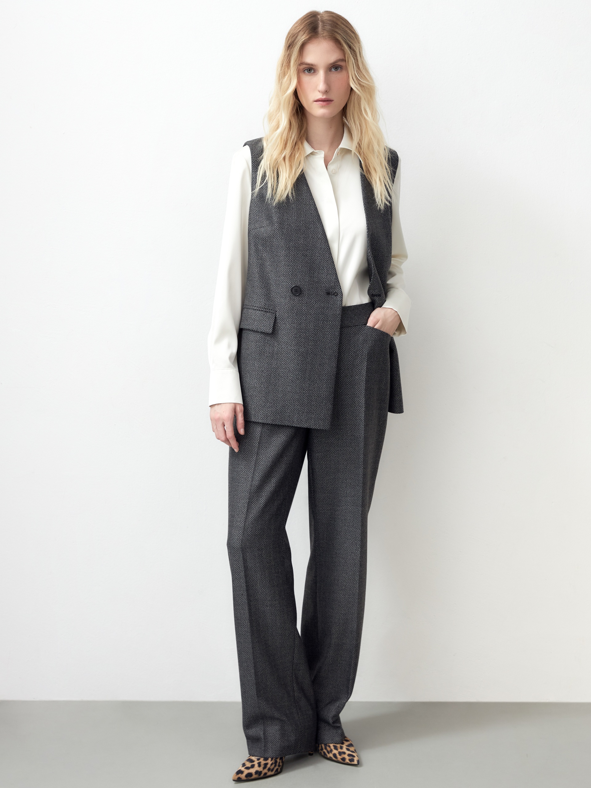 Свободный двубортный жилет из костюмной фактурной ткани в черно-белом принте "елочка". Жилет свободного силуэта с прорезными карманами с клапанами. Жилет полностью на подкладке....