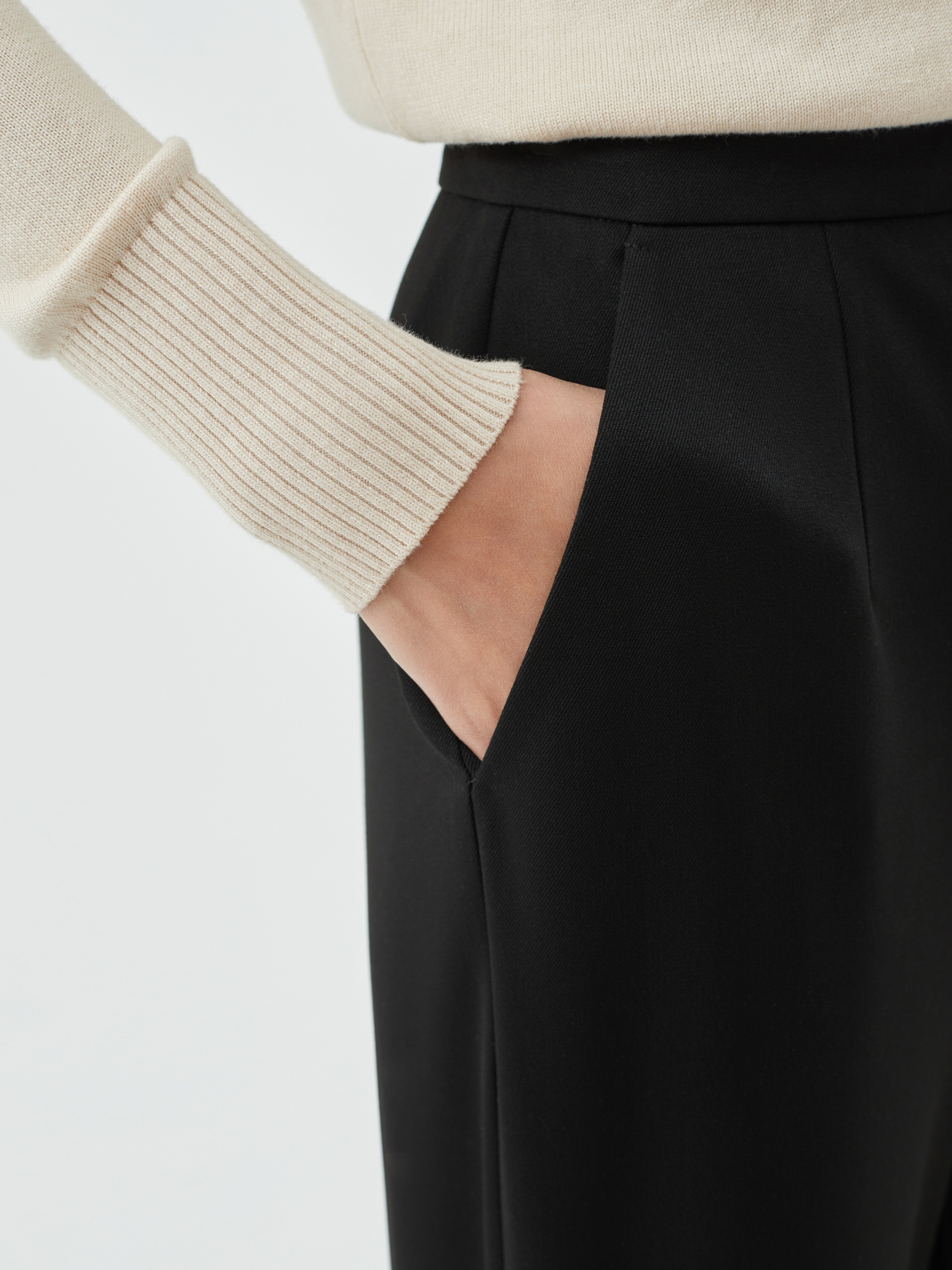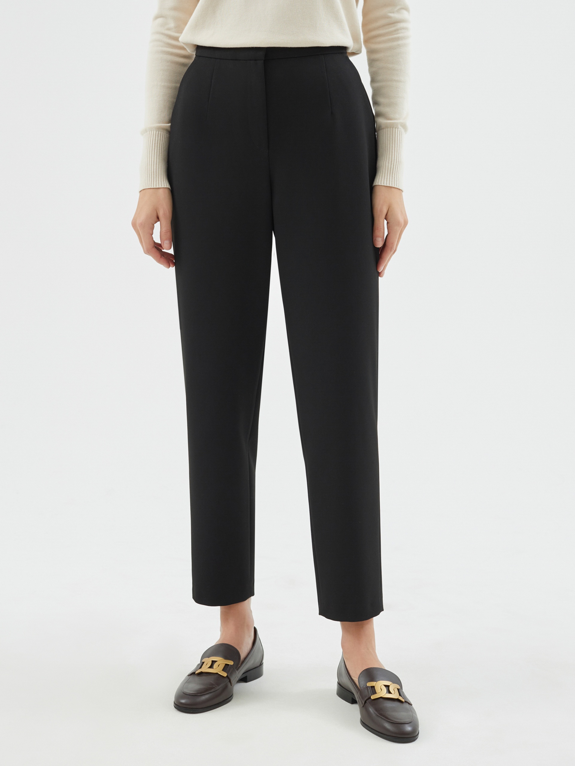 Брюки из костюмной ткани. Силуэт - полуприлегающий, слегка заужен к низу. Длина по щиколотку. Создайте гармоничный образ с ботинками или ботильонами, которые слегка будут скрываться под брюками.