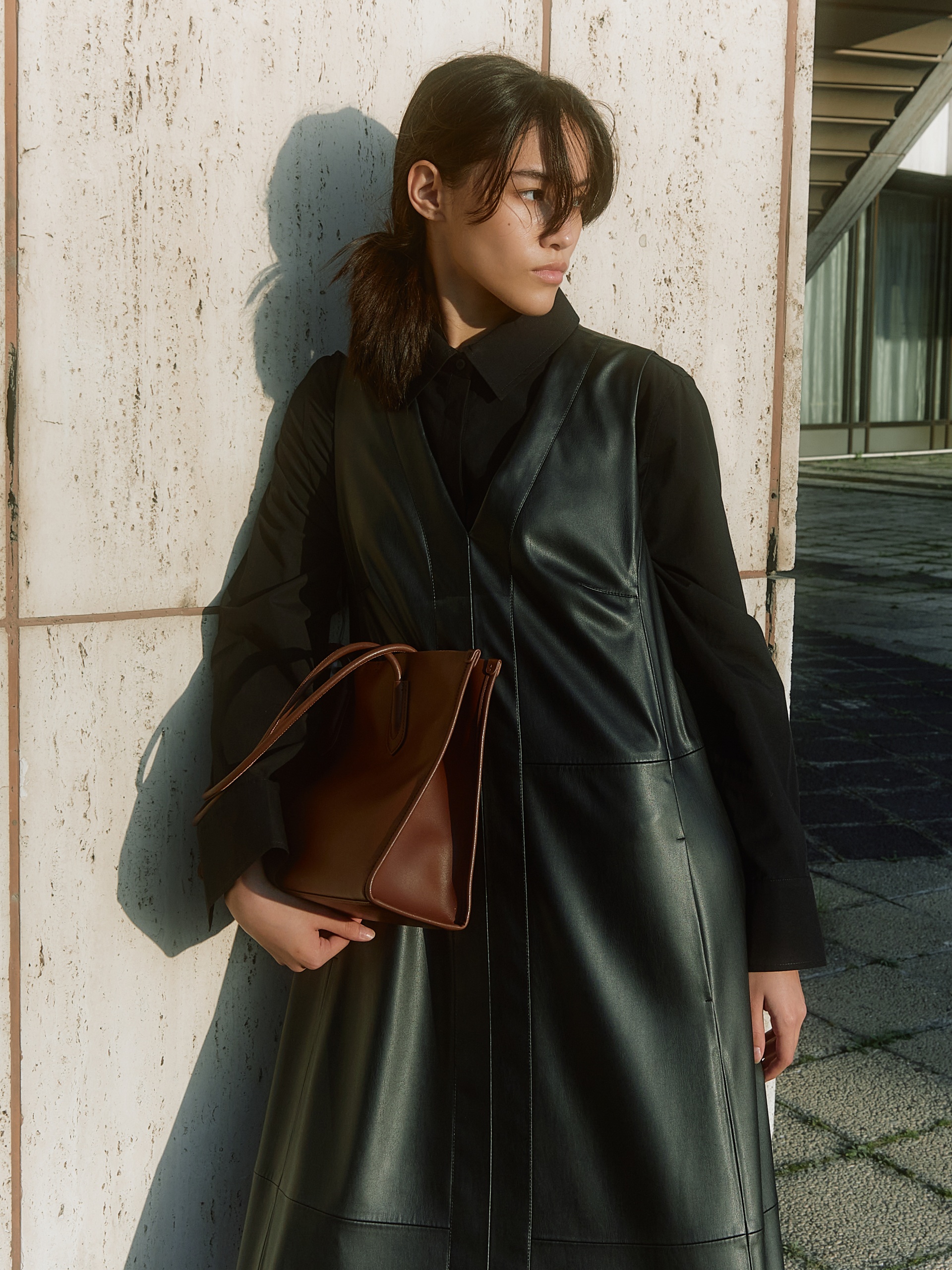 Трапециевидный сарафан из экокожи в черном цвете с широкими лямками и рельефами по всему платью. Карманы в швах.