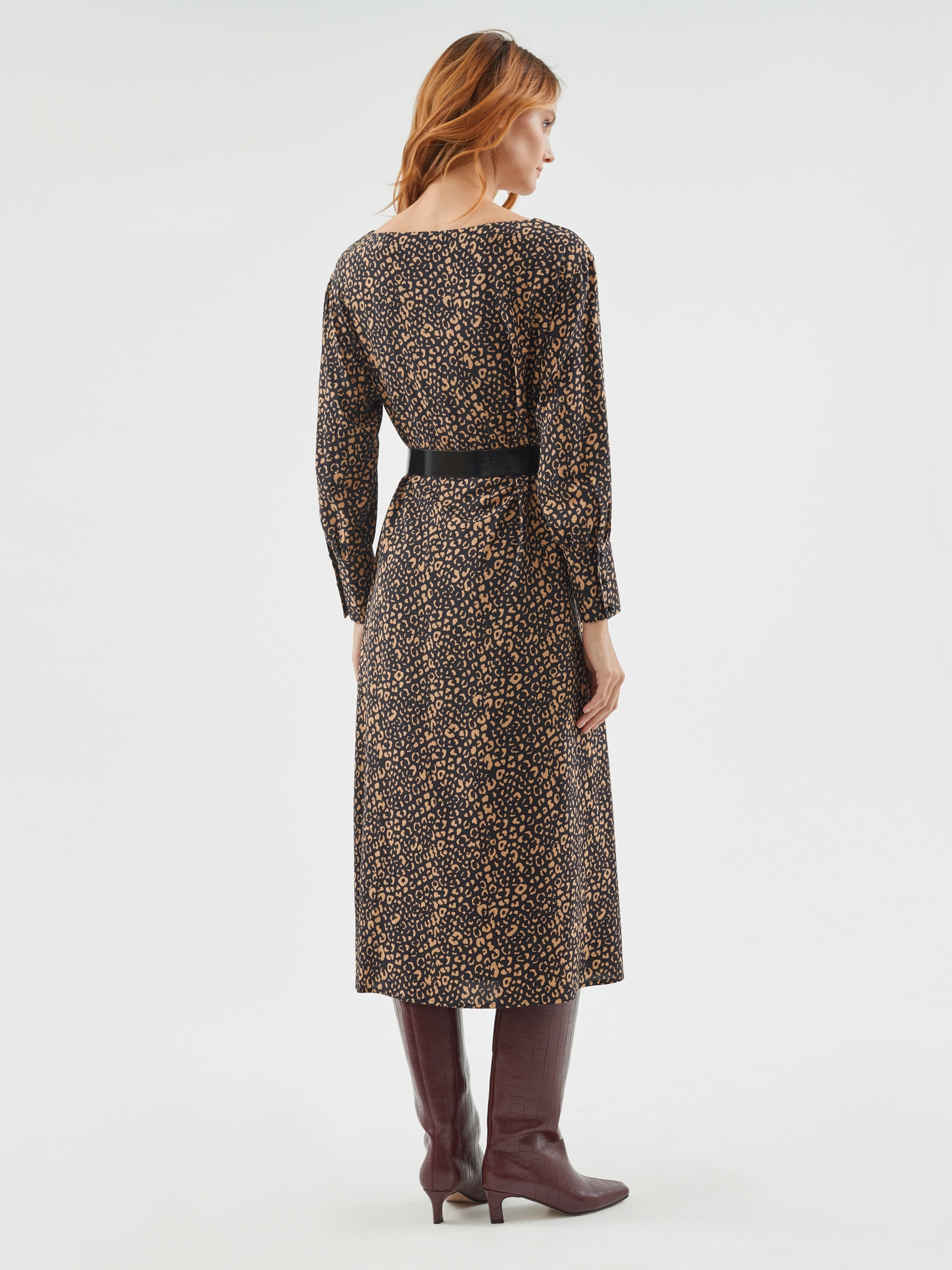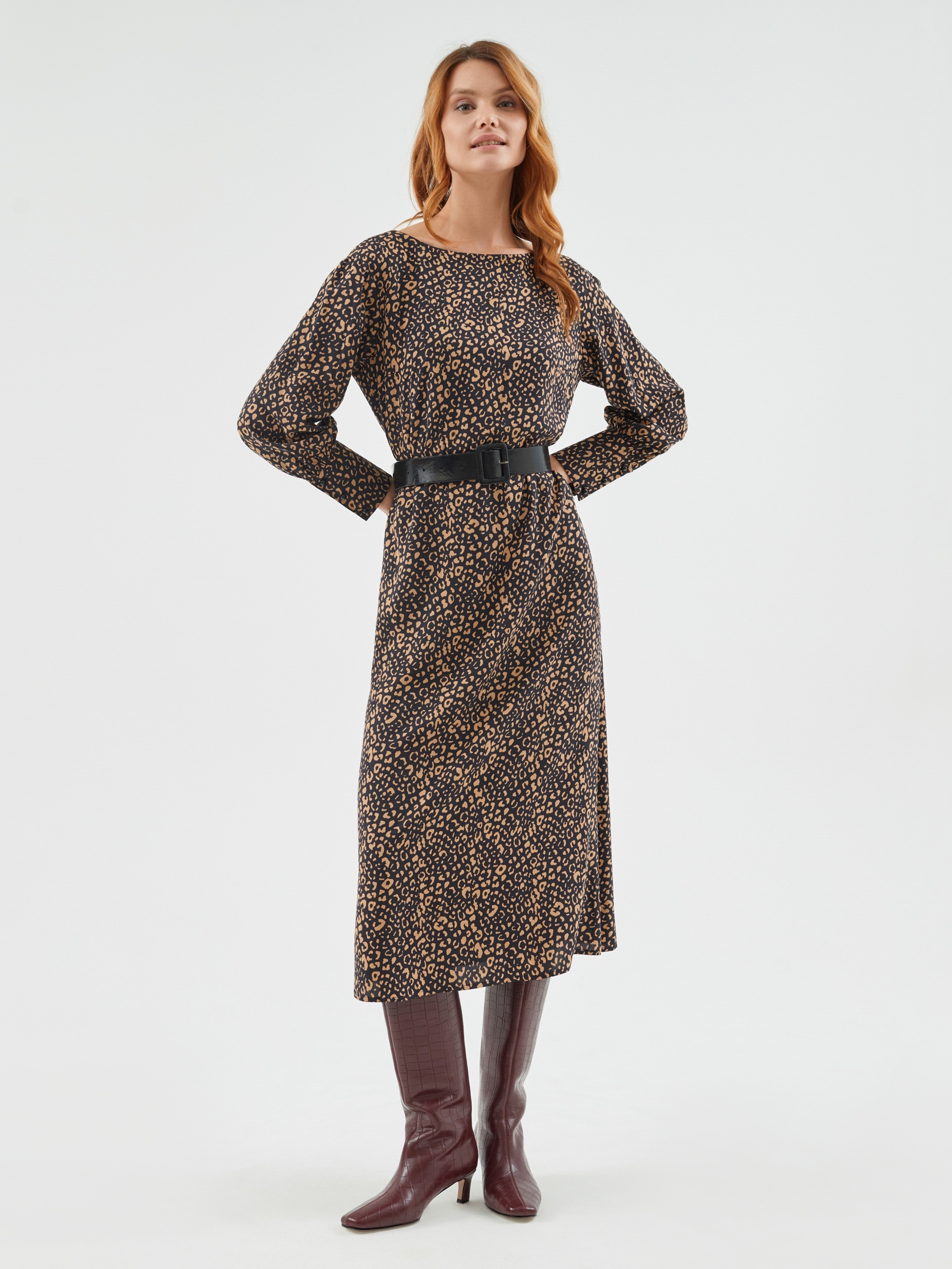 Платье прилегающего силуэта из вискозной ткани с анималистичным принтом. Длина миди. Вырез горловины лодочка, рукав втачной со спущенным плечом с широкими манжетами. В комплект входит черный пояс из экокожи.
