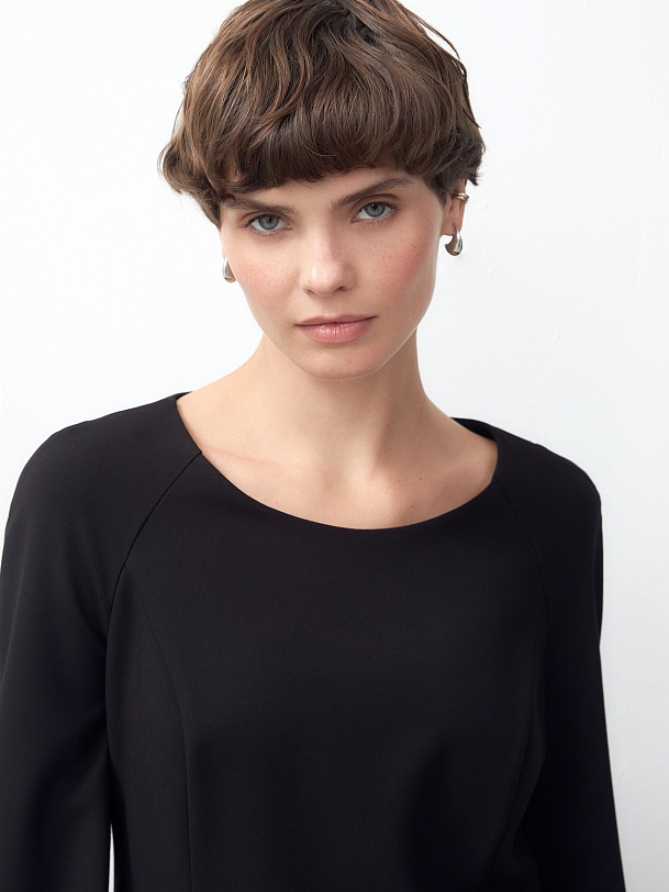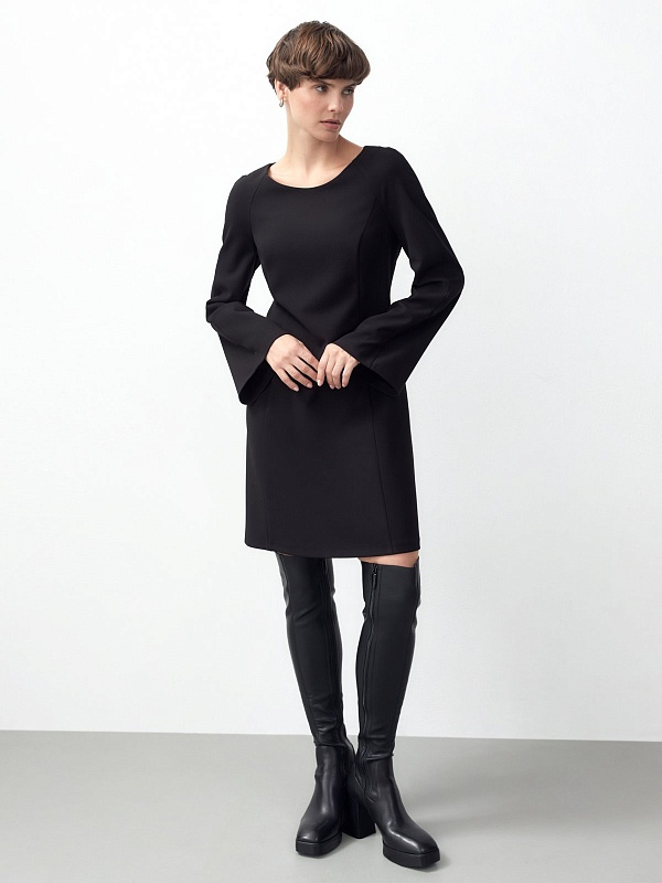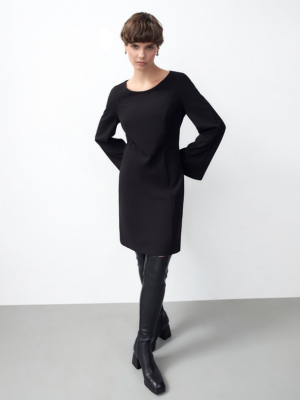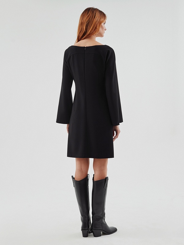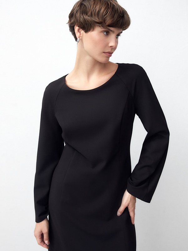 Черное платье из костюмной ткани с эффектной линией горловины и расширяющимися рукавами. Платье полуприлегающего силуэта с рельефами, рукав реглан. Отлично подойдет для прогулок по городу и неофициальных встреч.