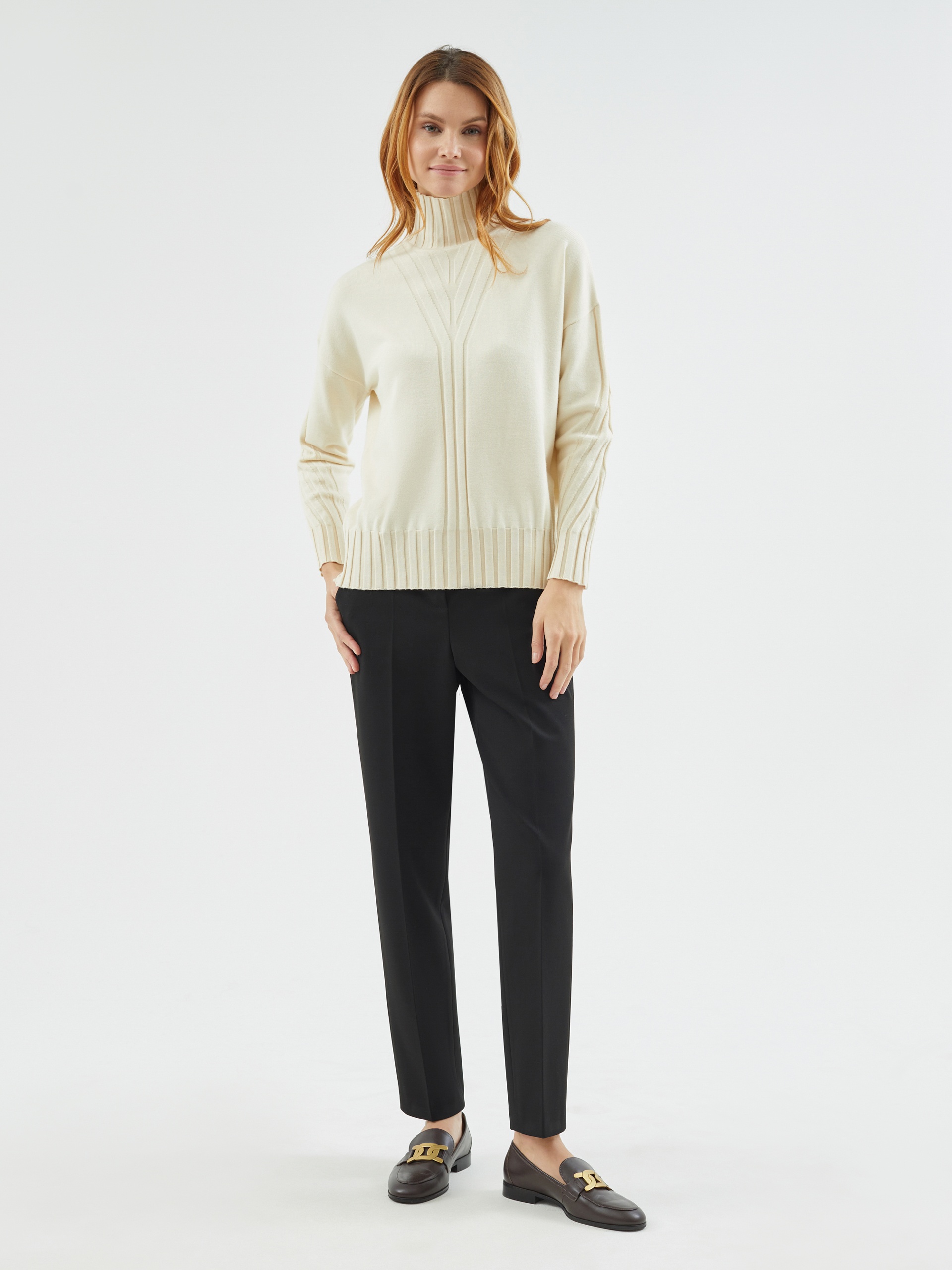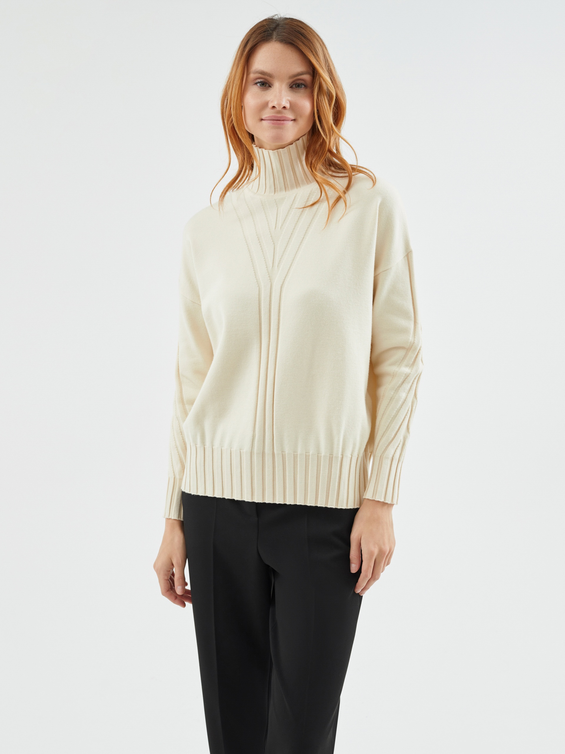 Мягкий свитер прямого силуэта в приятном молочном оттенке с вывязанными узорами по полочке и рукавам будет отлично согревать вас в холодные зимние дни.