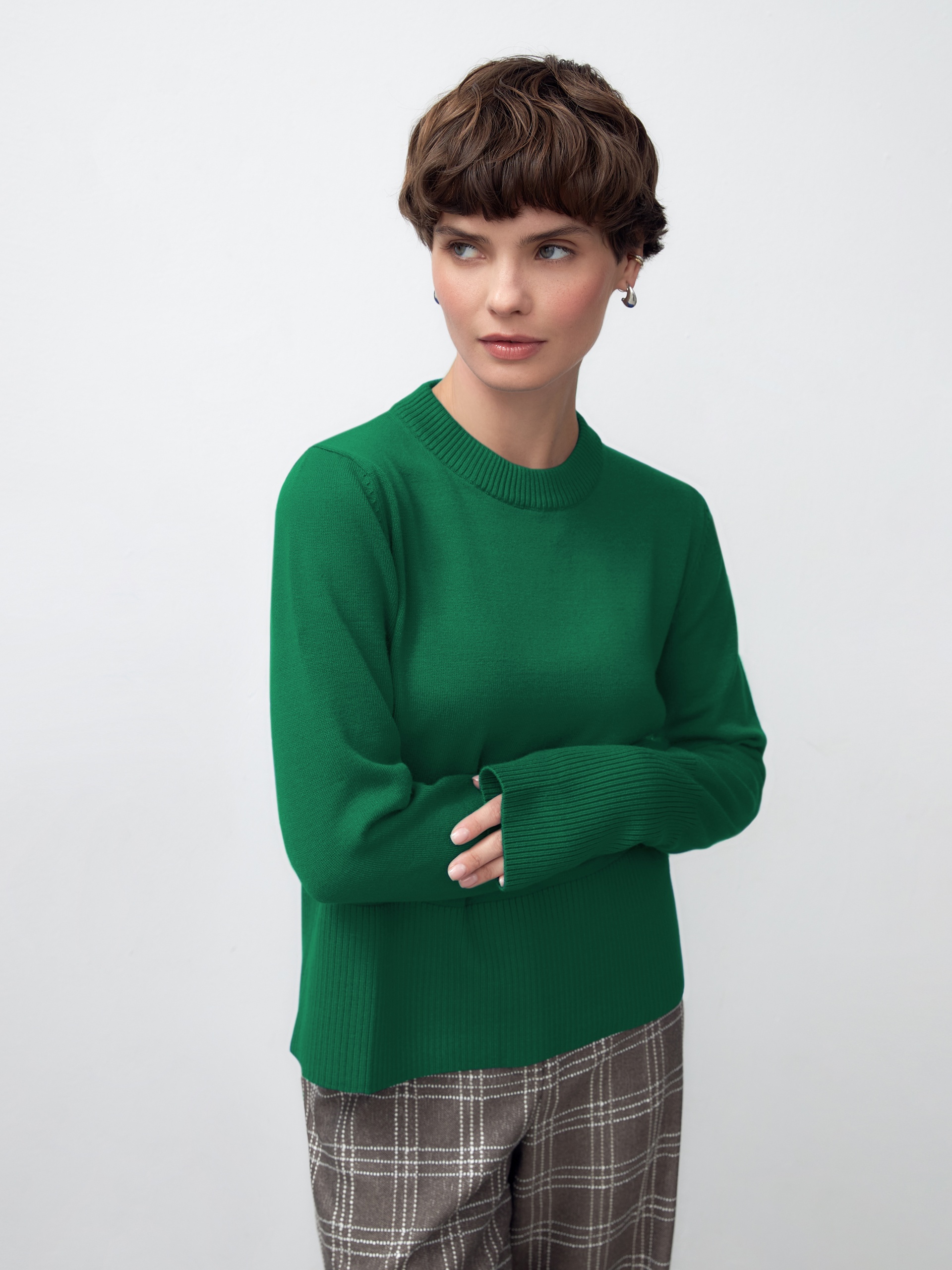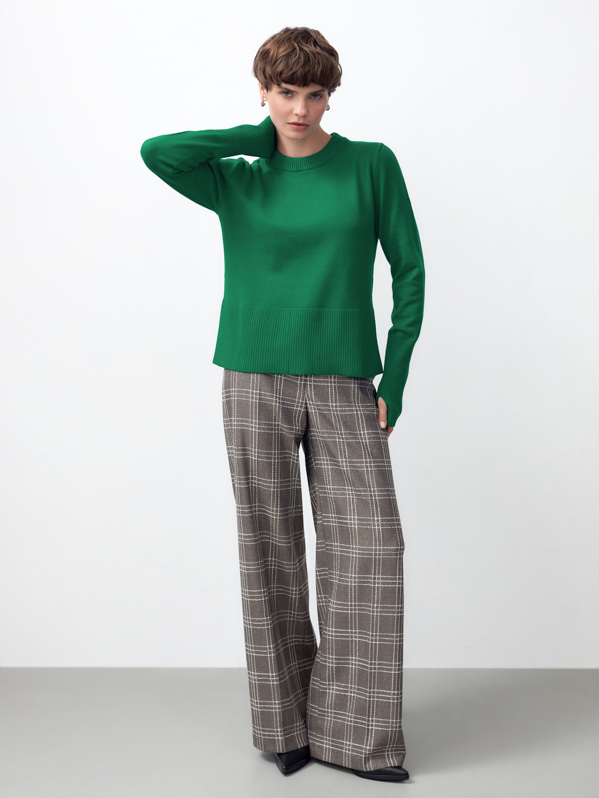 Джемпер прямого силуэта ярко-зеленого цвета с удлиненными манжетами, с вырезами для большого пальца, для эффекта митенок станет вашим фаворитом. Идеален в сочетании с темными низами разных фактур.