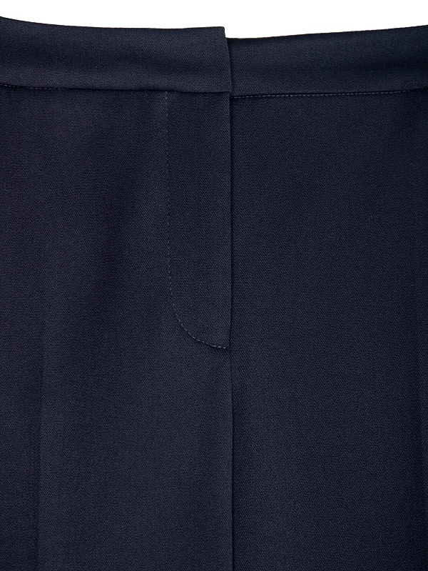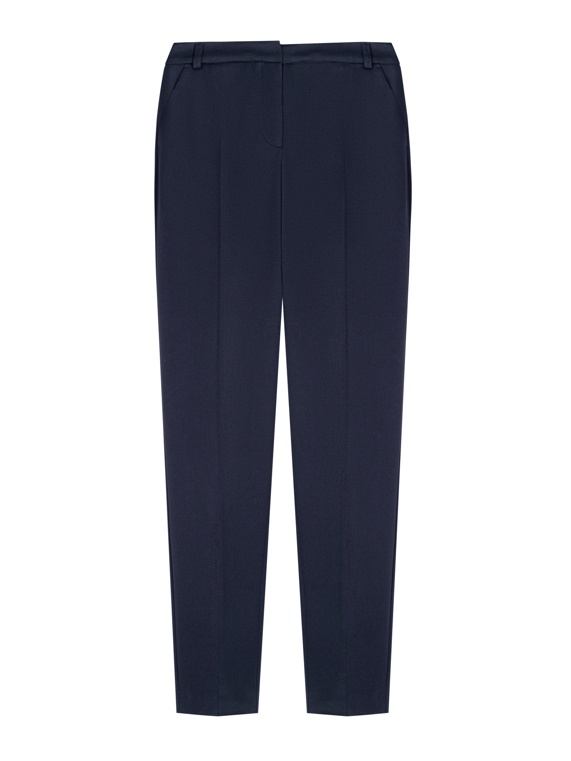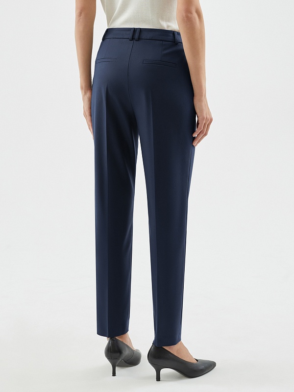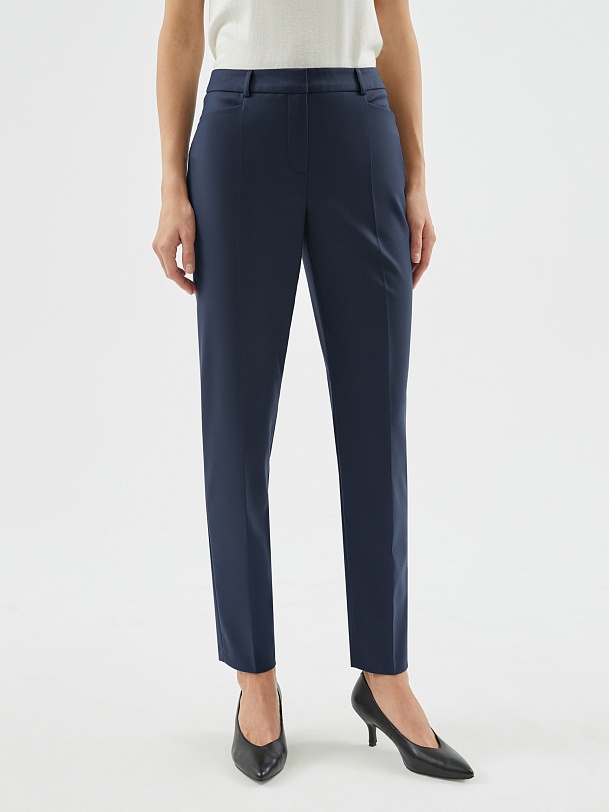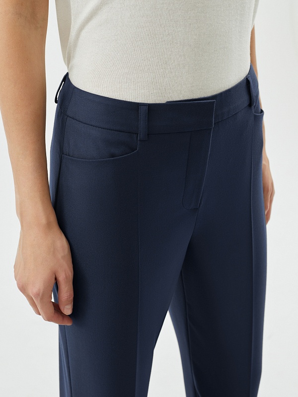 Утепленные темно-синие брюки со стрелками прямого силуэта на притачном поясе со шлевками и рабочими карманами по бокам фигурной формы. Застежка спереди на молнию и крючок. Сзади прорезные карманы с листочками.